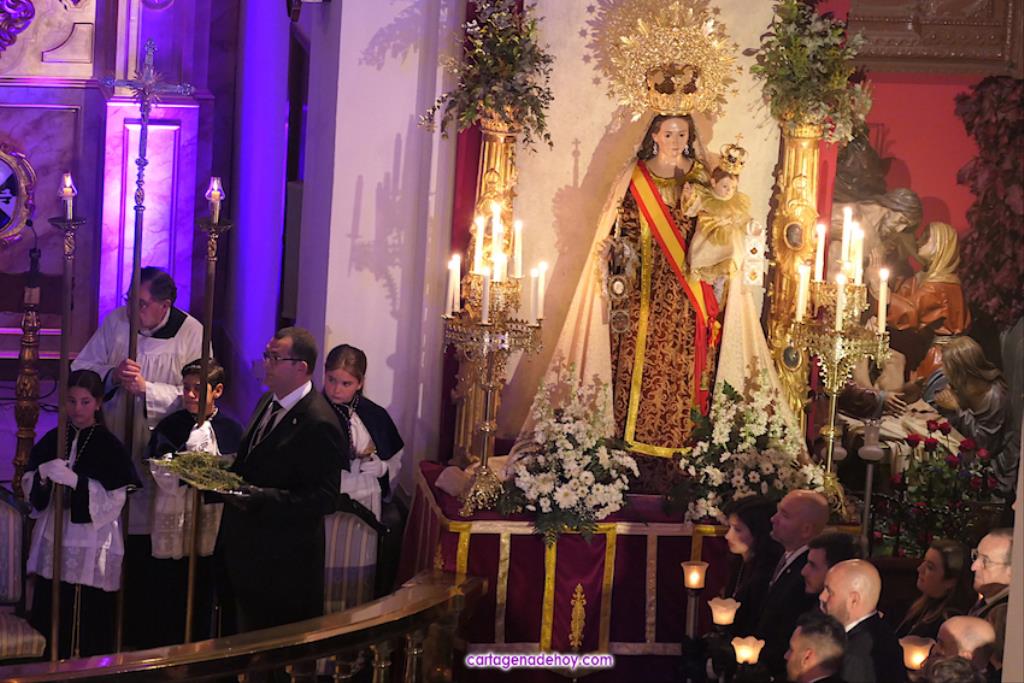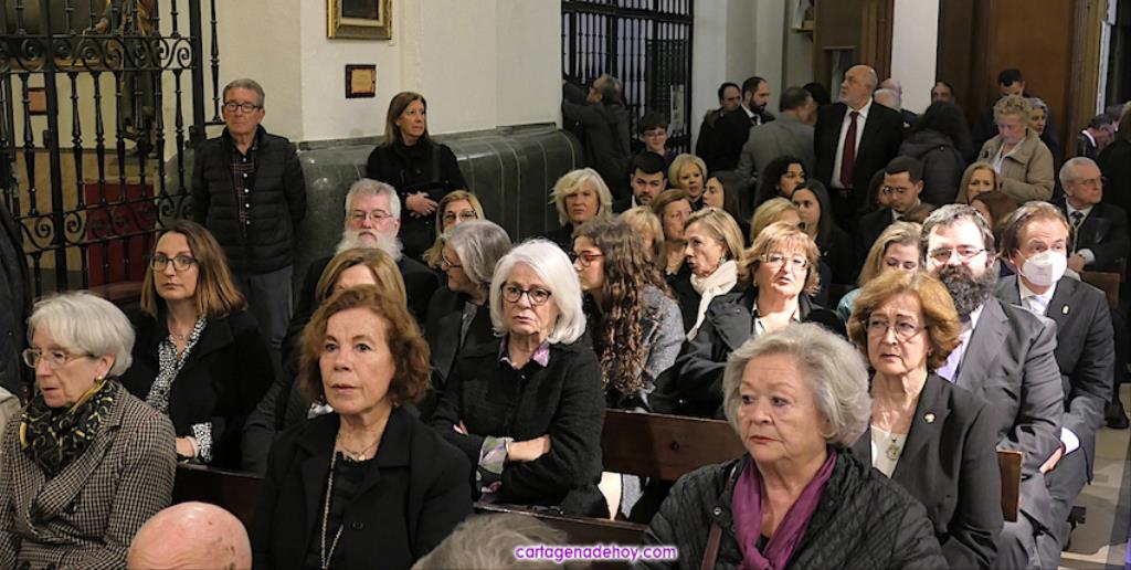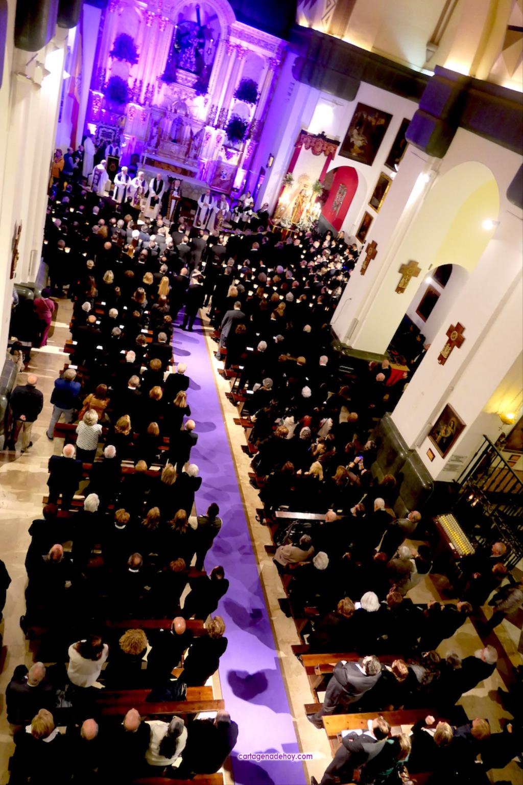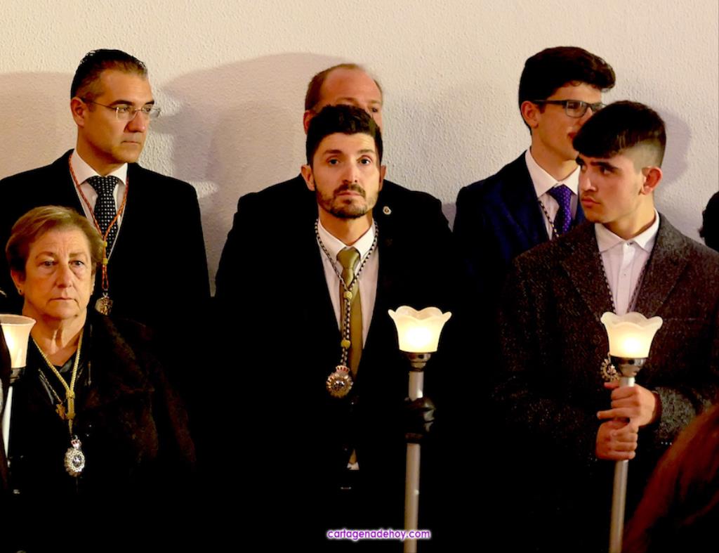 A las nueve de la noche ha comenzado este acto penitencial de cuaresma cuyas referencias más antiguas que se conservan se remontan al siglo XIX, aunque es posible que su origen sea anterior. Tras la bienvenida de la junta de mesa marraja a los invitados al acto, ha comenzado desde la capilla marraja una procesión claustral que ha pisado escasos metros de la calle Mayor, para después cruzar la entrada principal de la iglesia en una comitiva encabezada por el estandarte y una larga fila de alumbrantes, cerrando los principales distinguidos de la Semana Santa de Cartagena 2023, los hermanos mayores y el equipo eclesiástico.