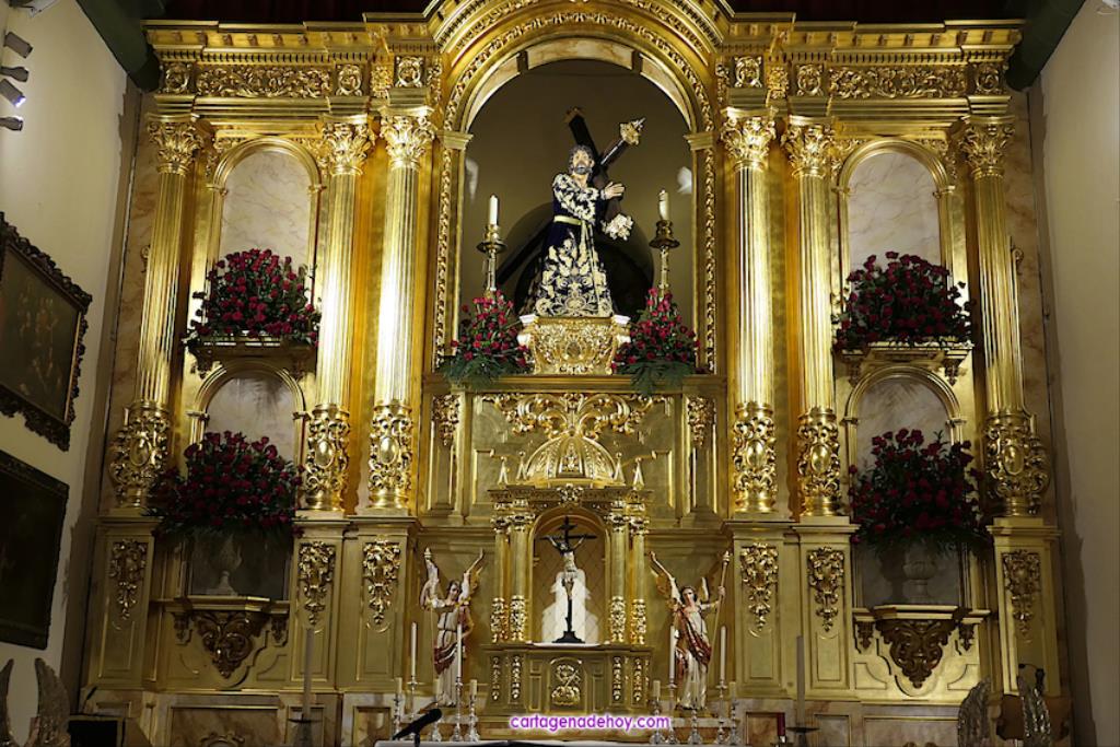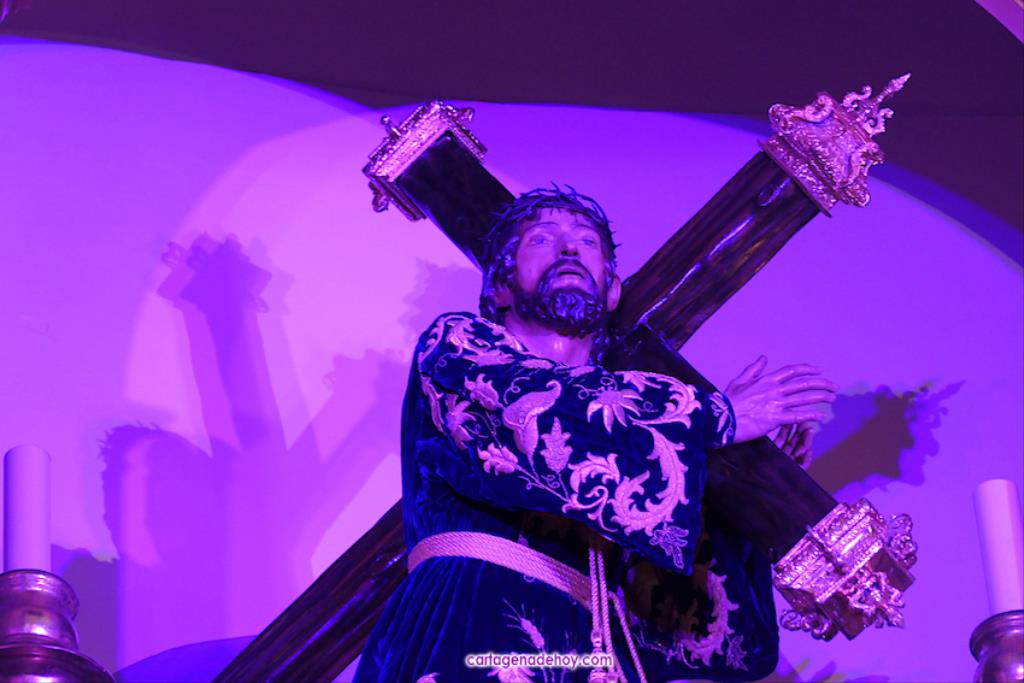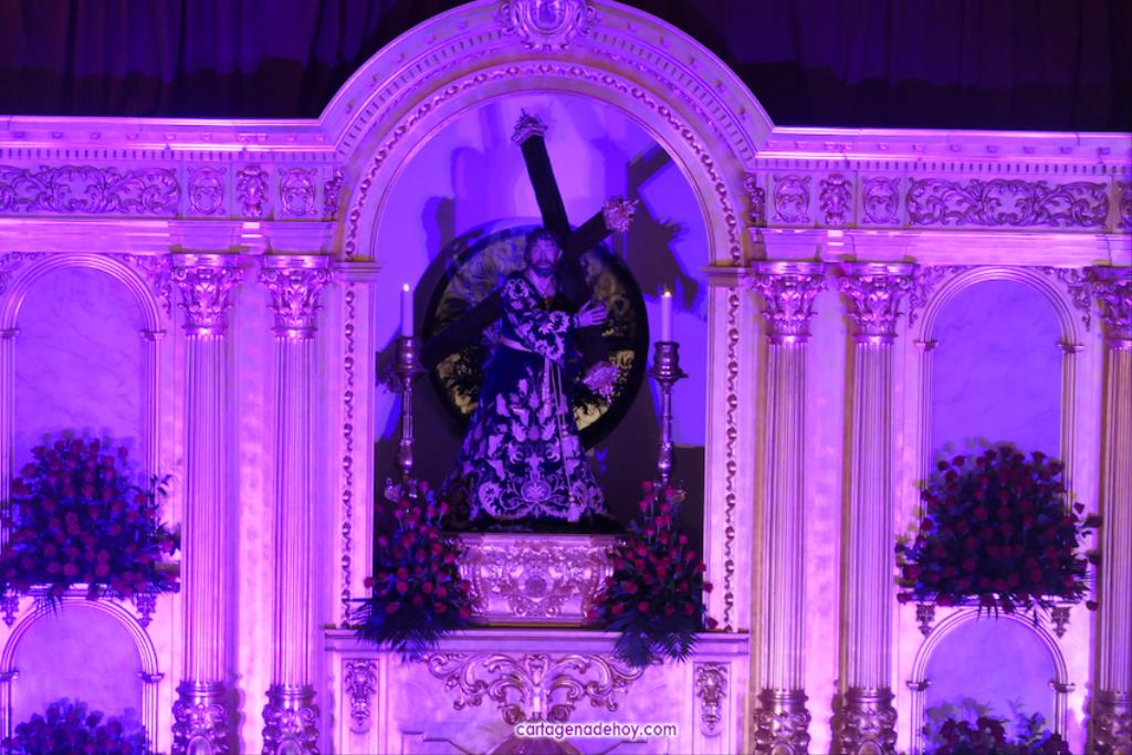 Novedad ha sido este año contemplar a Jesús Nazareno dentro del nuevo retablo de la iglesia de Santo Domingo. La posición es más elevada que como estaba antes y no hay una gran base de flores, las cuales se reparte por los diferentes camarines laterales. Ha reforzado el sentimiento marrajo del acto los focos que han cubierto el retablo de color morado, identificativo de la hermandad de 'Jesús del madero'.
