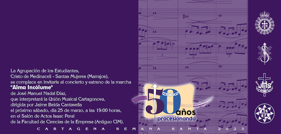 La unión musical, en el transcurso de su actuación en el salón de actos Isaac Peral de la Facultad de Ciencias de la Empresa (antiguo CIM), estrenará la marcha 'Alma Incólume', compuestas por José Manuel Nadal Díaz. Será este sábado, a las 19 horas, con entrada gratuita. Este acto forma parte del programa del cincuenta aniversario del colectivo marrajo, al igual que hace unos días fue la proyección del documento 'Estudiantes' (foto adjunta de algunos asistentes).