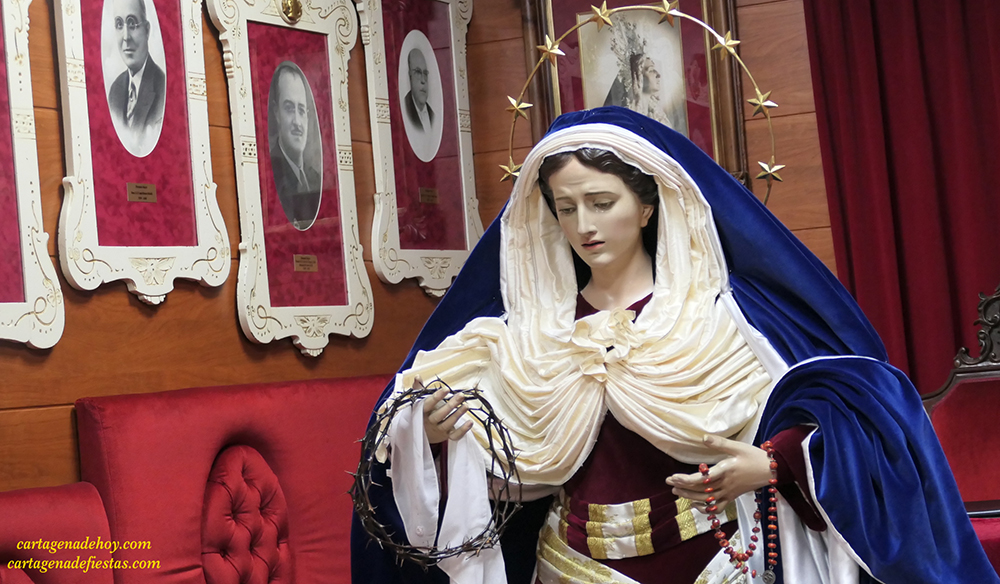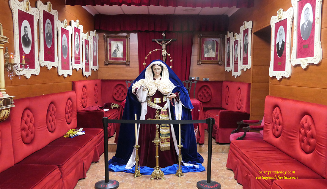 La imagen de María Santísima del Rosario en la sala capitular de la Cofradía del Cristo del Prendimiento, donde esta noche será vestida por sus camareras y trasladada por los hermanos de la agrupación al trono de donde saldrá en procesión el Viernes de Dolores con el primer cortejo pasionario encarnado de la Semana Santa de 2023.