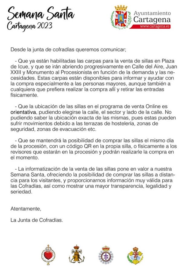Las localidades ya se están vendiendo por internet y a través del puesto presencial instalado en la plaza del Icue, estando previsto instalar más en la calle del Aire y en la plaza de San Sebastián. Además, se pueden adquirir escaneando con el móvil el código que lleva cada silla o con los revisores que estarán durante las procesiones.