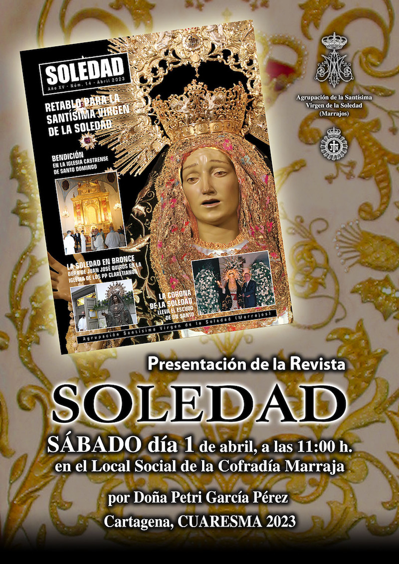 La revista de la agrupación de la Virgen marraja varía la tradicional foto única de las publicaciones de Semana Santa de Cartagena por un formato diferente, con varias imágenes y titulares de temas que lleva en el interior. Será presentada este sábado (13 horas) y por la tarde (20 horas), la agrupación hará el traslado de la Soledad de los Pobres, siendo novedad la salida desde la iglesia de los Padres Claretianos.