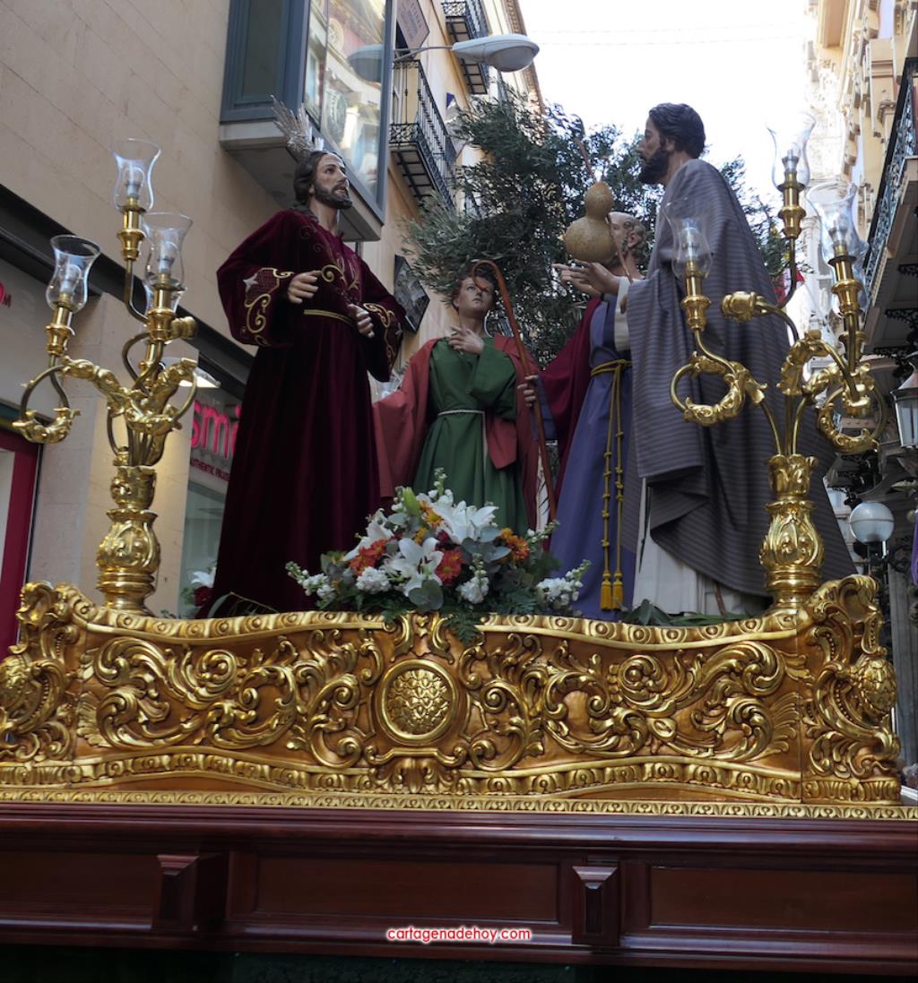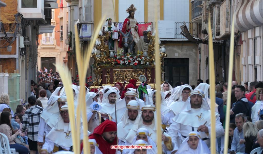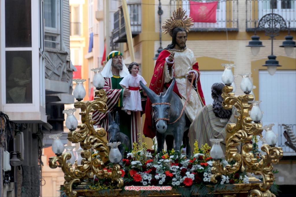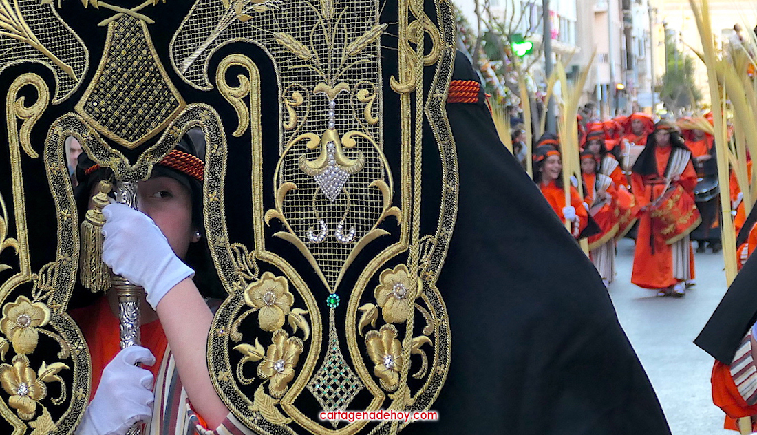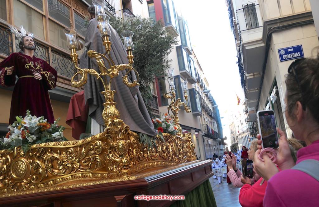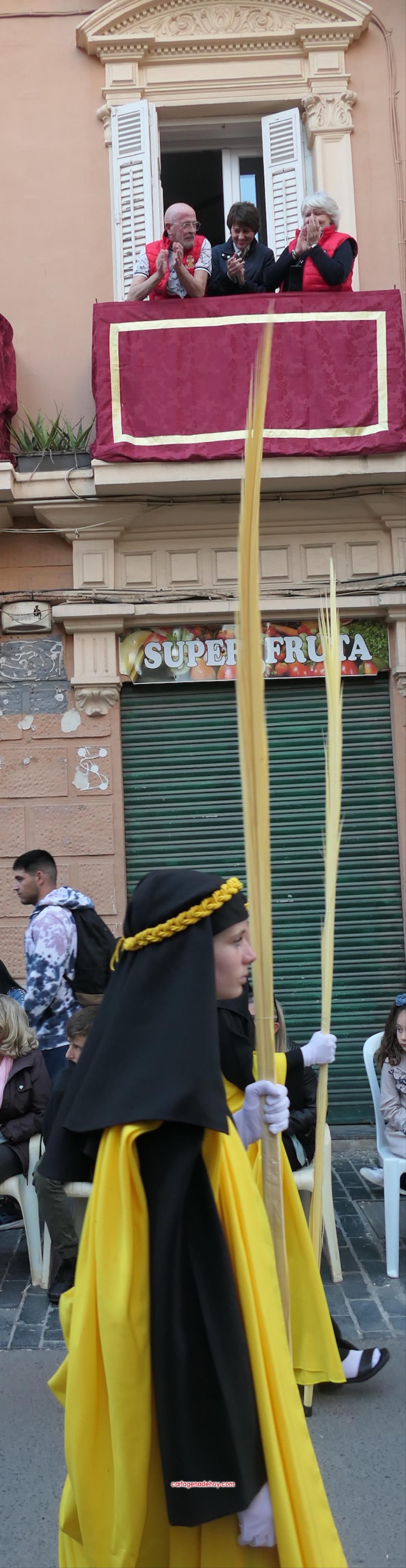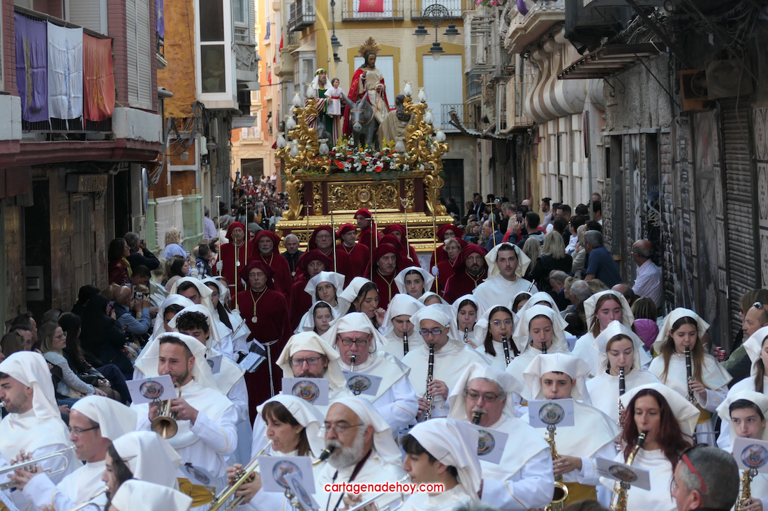 La procesión también ha tenido sus novedades, en especial el estreno de Dies Palmarum', composición creada por Joaquín Grau, quien ha acompañado en la tarde del estreno a la agrupación del Cristo de la Sentencia, donde los músicos de La Unión la han interpretado en varios momentos. Por cierto, además de este vecino municipio, se han dado cita esta tarde, que hayamos visto (y oído), colectivos musicales también de Torre Pacheco, Cartagena y de la alicantina población de Catral. Otros acompañantes han sido el escultor Juan José Quirós con el Ósculo delante del trono que lleva a 'Los milagros de Jesús: la curación del ciego', cuyas tallas son obra del artista de Santa Lucía. Por su parte, la vicealcaldesa, Ana Belén Castejón, ha acompañado al trono sampedristas llevado por las jóvenes damas y el 'Procesionista del año', Francisco Ramón Sánchez, ha salido con los suyos de la agrupación de la Virgen que lleva al grupo escultórico de 'Jesús con los niños', en el que en una artesanal jaula de madera va el canario 'Bendito' desde que este grupo lo crease el escultor Hernández Navarro.