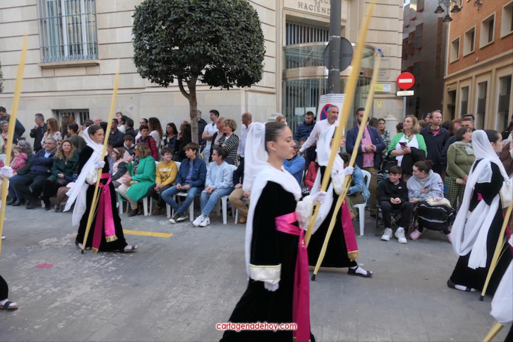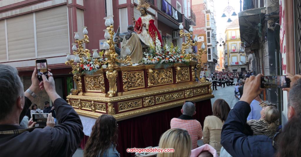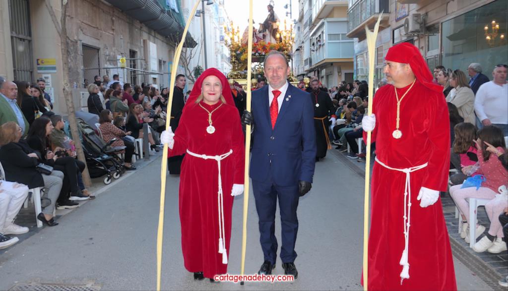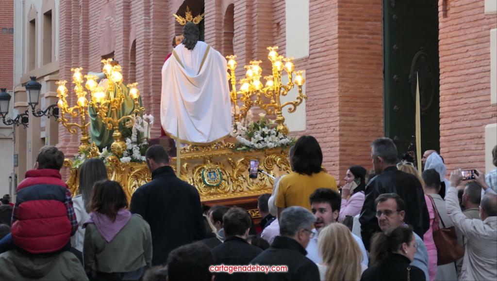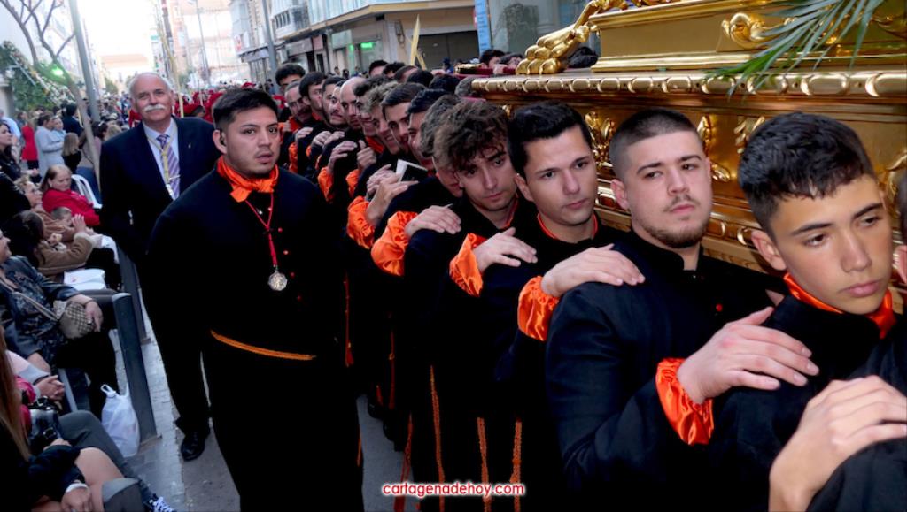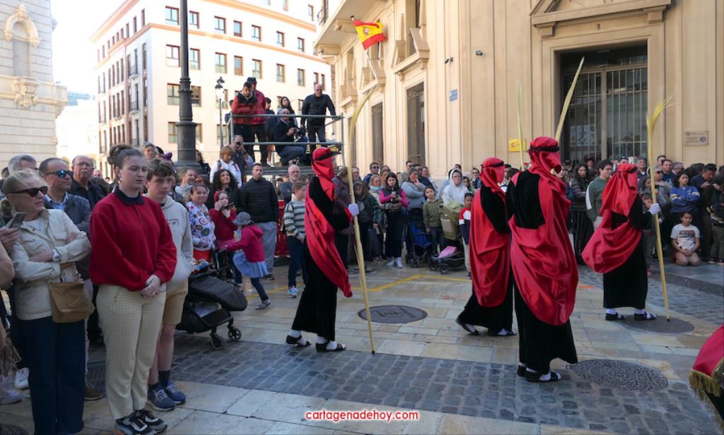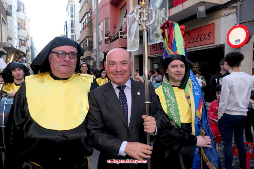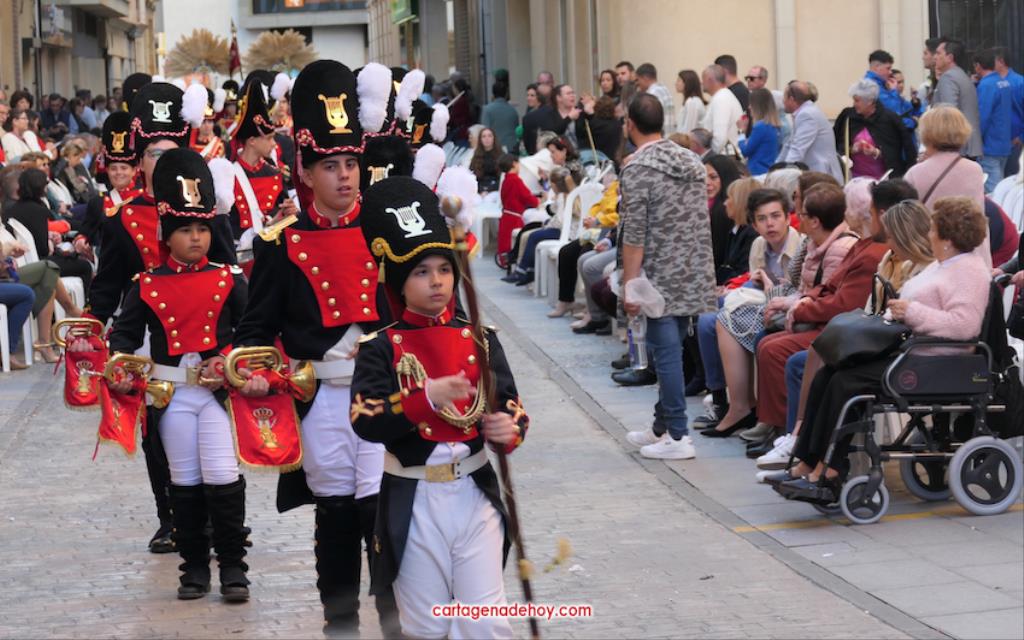 La procesión también ha tenido sus novedades, en especial el estreno de Dies Palmarum', composición creada por Joaquín Grau, quien ha acompañado en la tarde del estreno a la agrupación del Cristo de la Sentencia, donde los músicos de La Unión la han interpretado en varios momentos. Por cierto, además de este vecino municipio, se han dado cita esta tarde, que hayamos visto (y oído), colectivos musicales también de Torre Pacheco, Cartagena y de la alicantina población de Catral. Otros acompañantes han sido el escultor Juan José Quirós con el Ósculo delante del trono que lleva a 'Los milagros de Jesús: la curación del ciego', cuyas tallas son obra del artista de Santa Lucía. Por su parte, la vicealcaldesa, Ana Belén Castejón, ha acompañado al trono sampedristas llevado por las jóvenes damas y el 'Procesionista del año', Francisco Ramón Sánchez, ha salido con los suyos de la agrupación de la Virgen que lleva al grupo escultórico de 'Jesús con los niños', en el que en una artesanal jaula de madera va el canario 'Bendito' desde que este grupo lo crease el escultor Hernández Navarro.