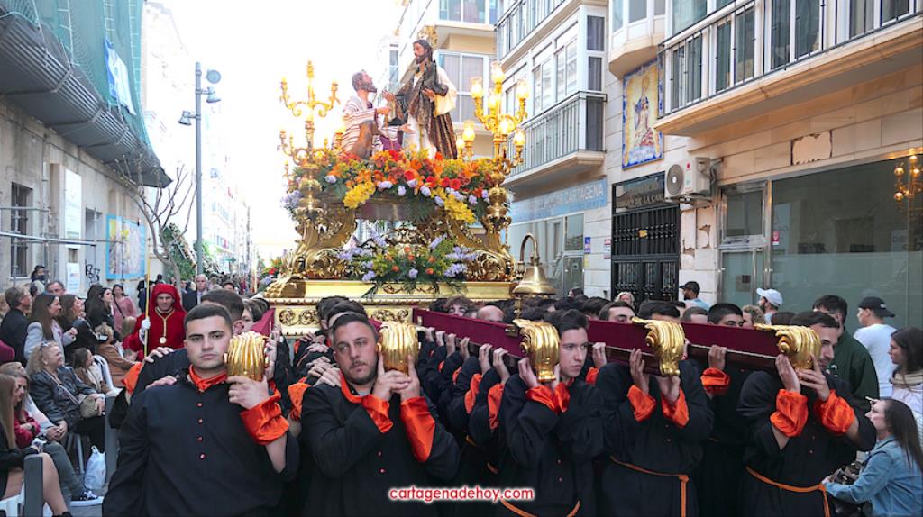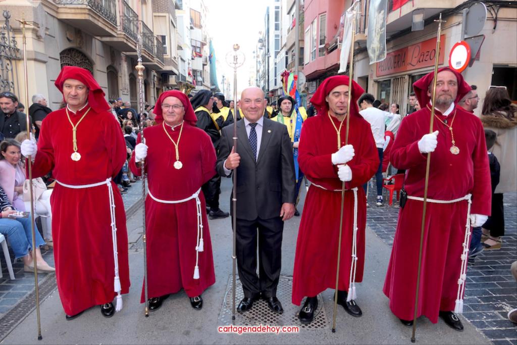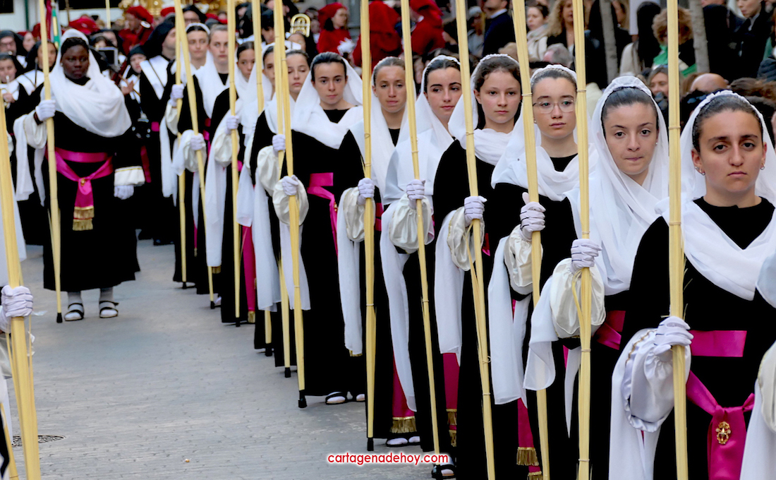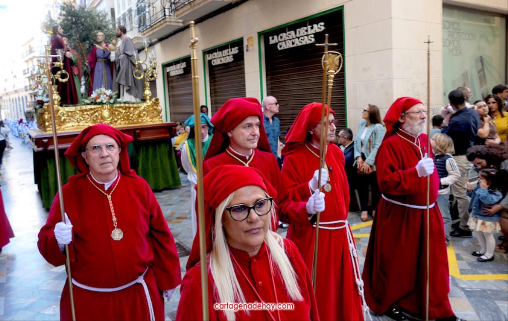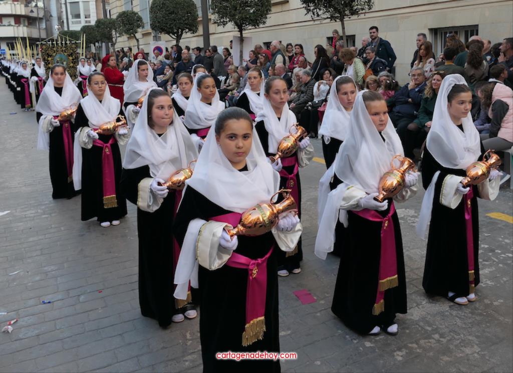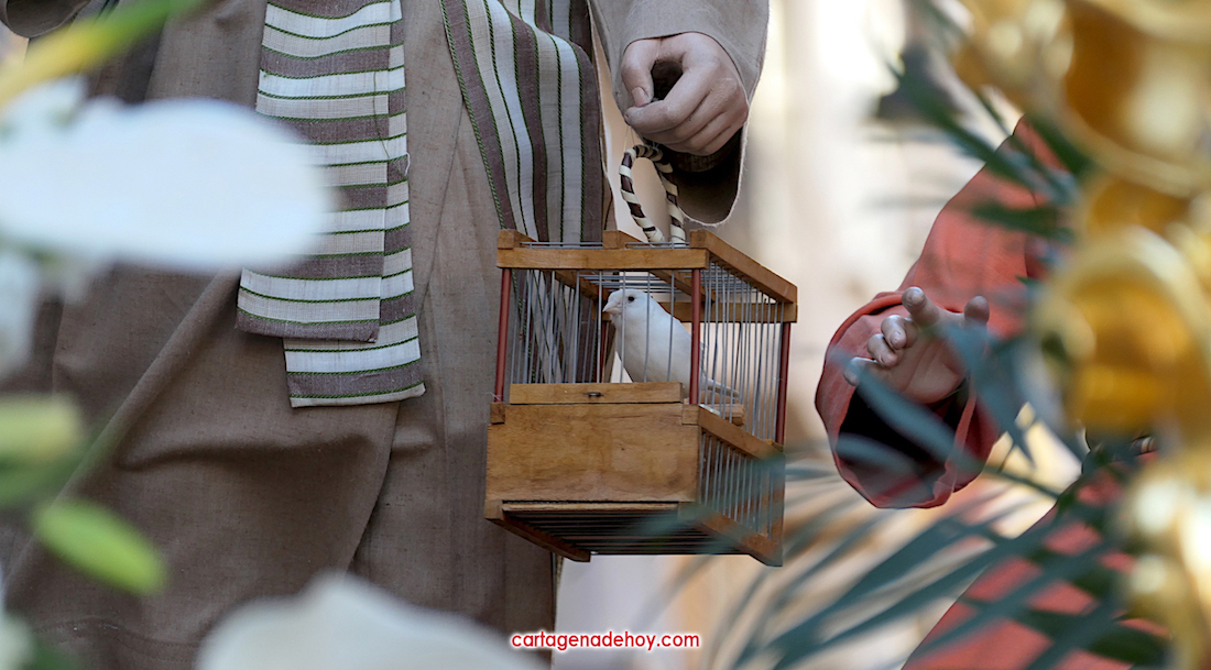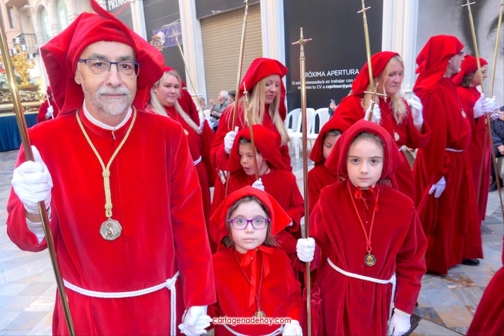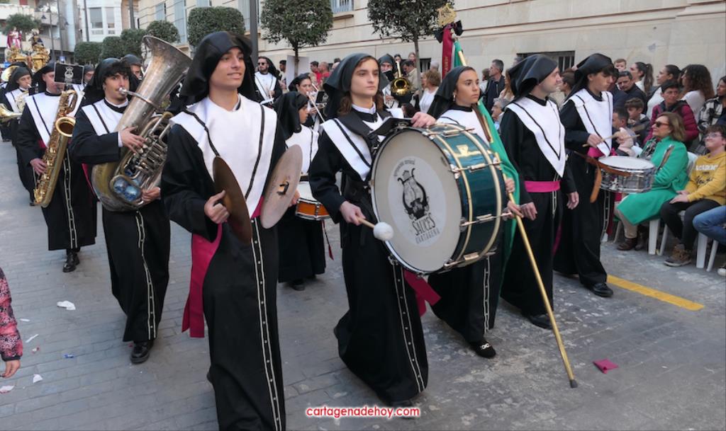 La procesión también ha tenido sus novedades, en especial el estreno de Dies Palmarum', composición creada por Joaquín Grau, quien ha acompañado en la tarde del estreno a la agrupación del Cristo de la Sentencia, donde los músicos de La Unión la han interpretado en varios momentos. Por cierto, además de este vecino municipio, se han dado cita esta tarde, que hayamos visto (y oído), colectivos musicales también de Torre Pacheco, Cartagena y de la alicantina población de Catral. Otros acompañantes han sido el escultor Juan José Quirós con el Ósculo delante del trono que lleva a 'Los milagros de Jesús: la curación del ciego', cuyas tallas son obra del artista de Santa Lucía. Por su parte, la vicealcaldesa, Ana Belén Castejón, ha acompañado al trono sampedristas llevado por las jóvenes damas y el 'Procesionista del año', Francisco Ramón Sánchez, ha salido con los suyos de la agrupación de la Virgen que lleva al grupo escultórico de 'Jesús con los niños', en el que en una artesanal jaula de madera va el canario 'Bendito' desde que este grupo lo crease el escultor Hernández Navarro.