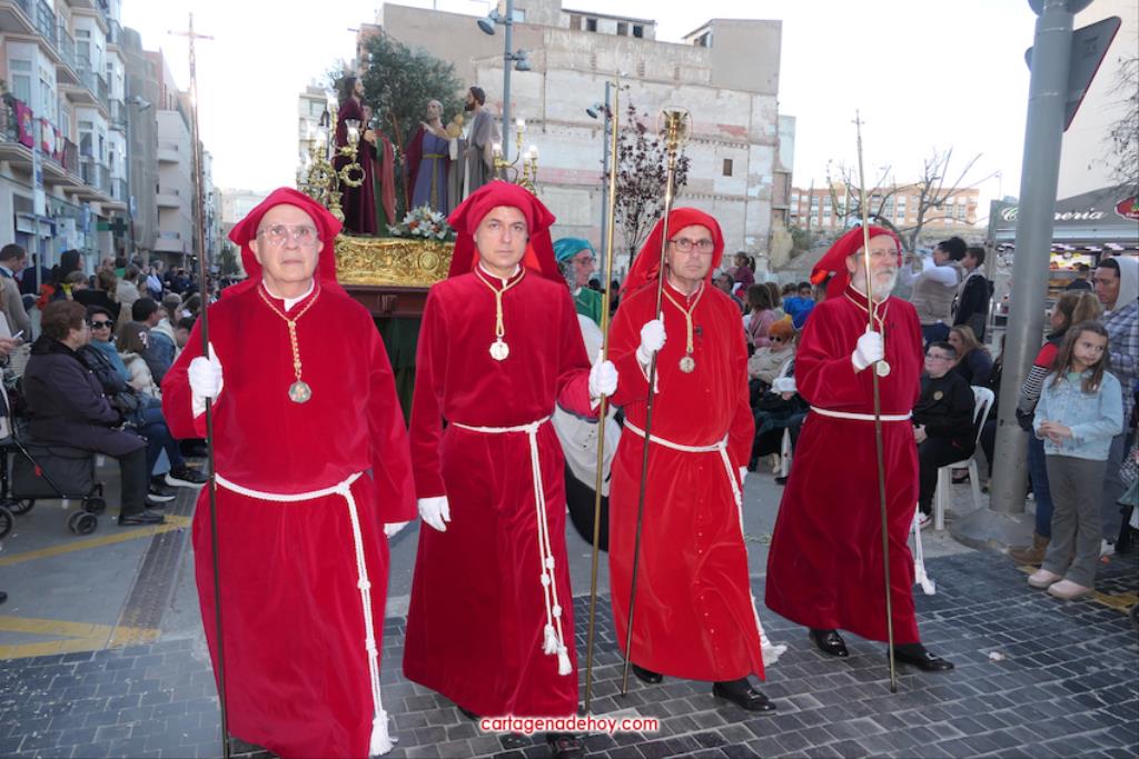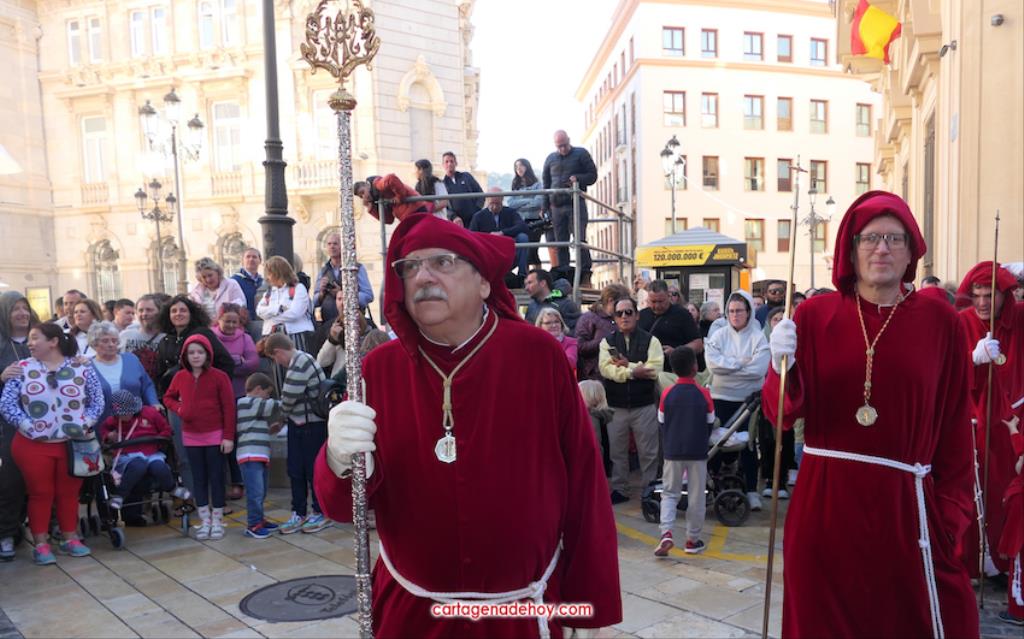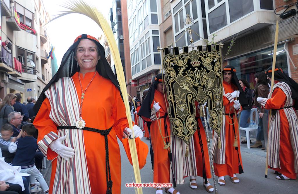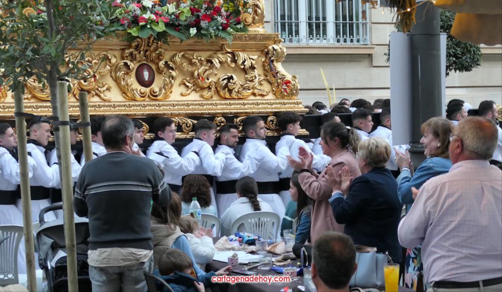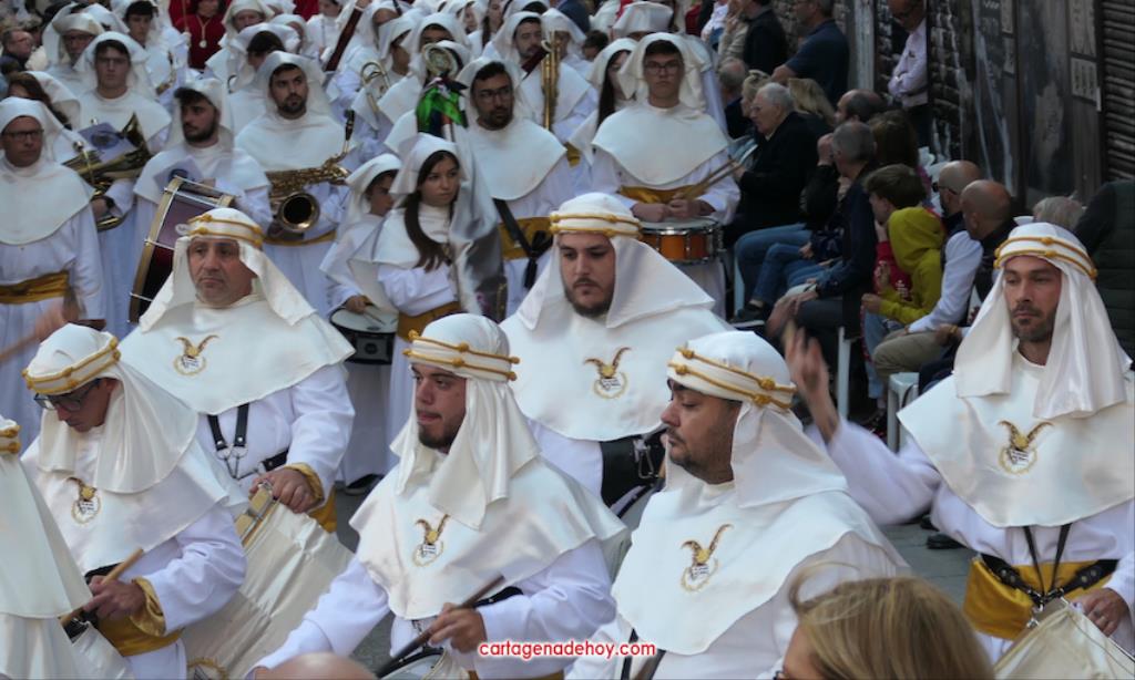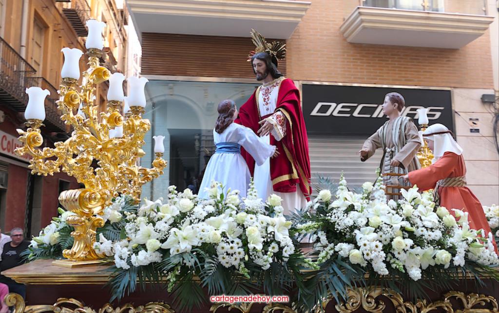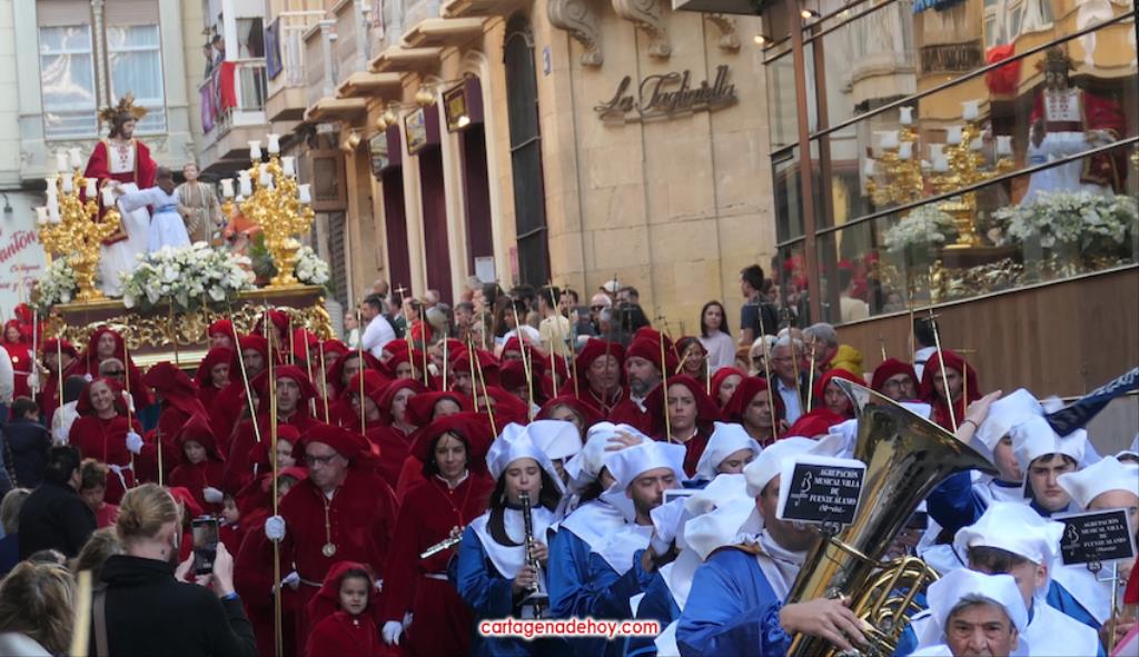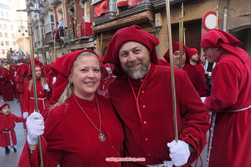 La procesión también ha tenido sus novedades, en especial el estreno de Dies Palmarum', composición creada por Joaquín Grau, quien ha acompañado en la tarde del estreno a la agrupación del Cristo de la Sentencia, donde los músicos de La Unión la han interpretado en varios momentos. Por cierto, además de este vecino municipio, se han dado cita esta tarde, que hayamos visto (y oído), colectivos musicales también de Torre Pacheco, Cartagena y de la alicantina población de Catral. Otros acompañantes han sido el escultor Juan José Quirós con el Ósculo delante del trono que lleva a 'Los milagros de Jesús: la curación del ciego', cuyas tallas son obra del artista de Santa Lucía. Por su parte, la vicealcaldesa, Ana Belén Castejón, ha acompañado al trono sampedristas llevado por las jóvenes damas y el 'Procesionista del año', Francisco Ramón Sánchez, ha salido con los suyos de la agrupación de la Virgen que lleva al grupo escultórico de 'Jesús con los niños', en el que en una artesanal jaula de madera va el canario 'Bendito' desde que este grupo lo crease el escultor Hernández Navarro.