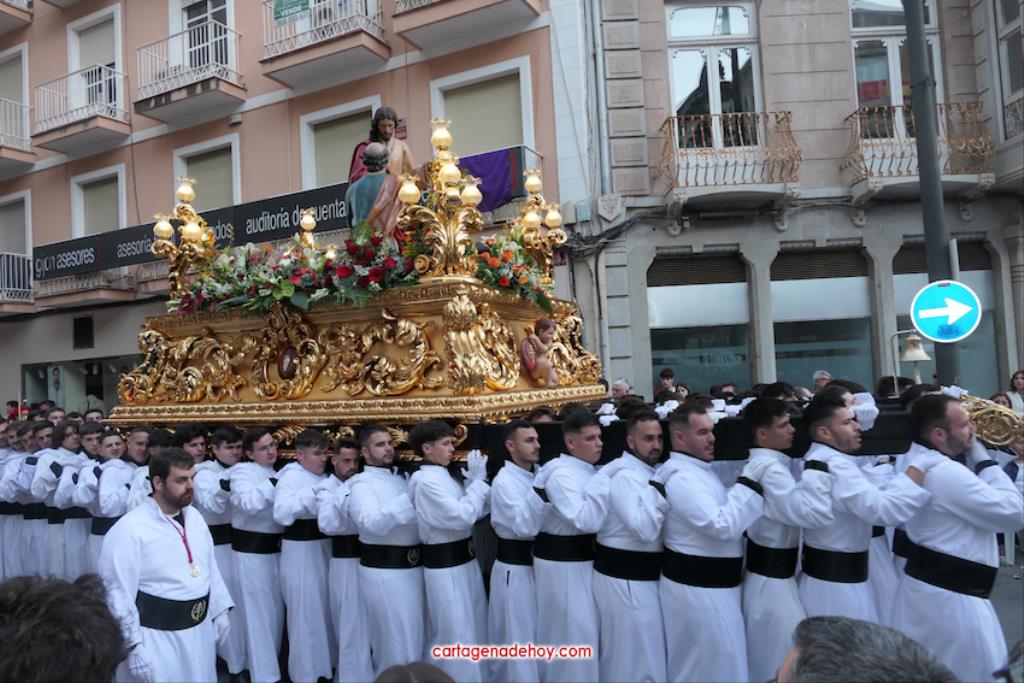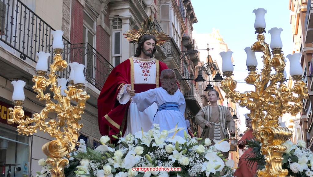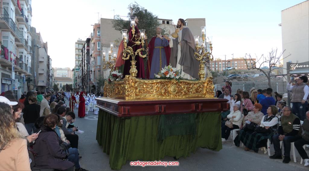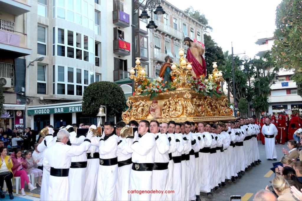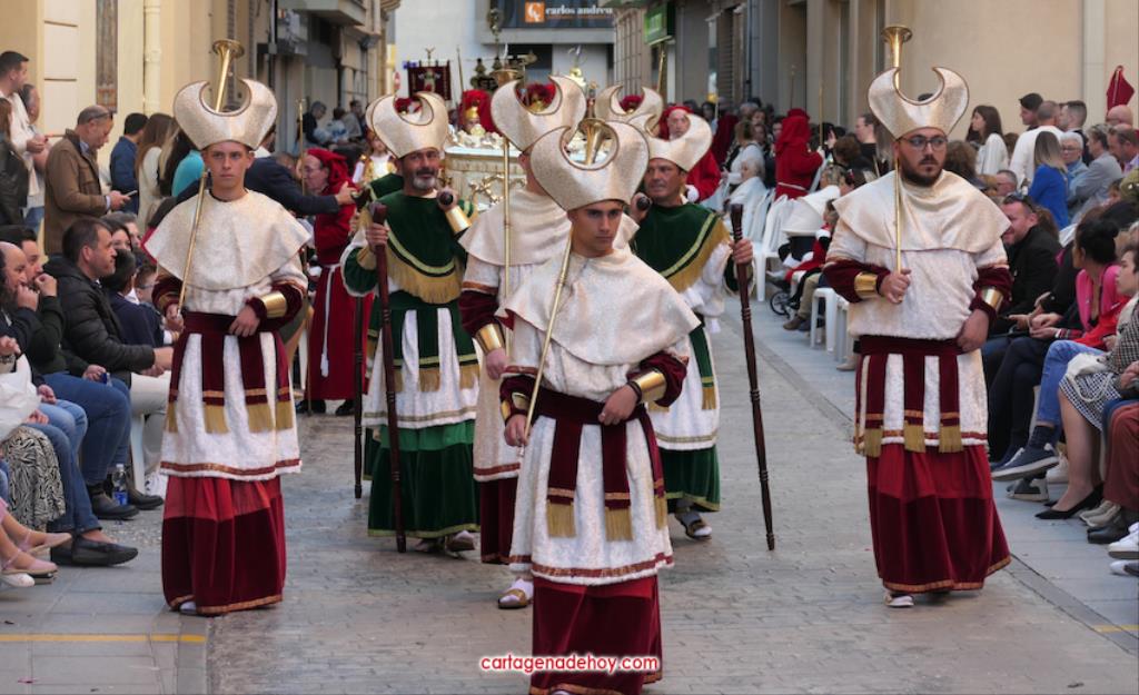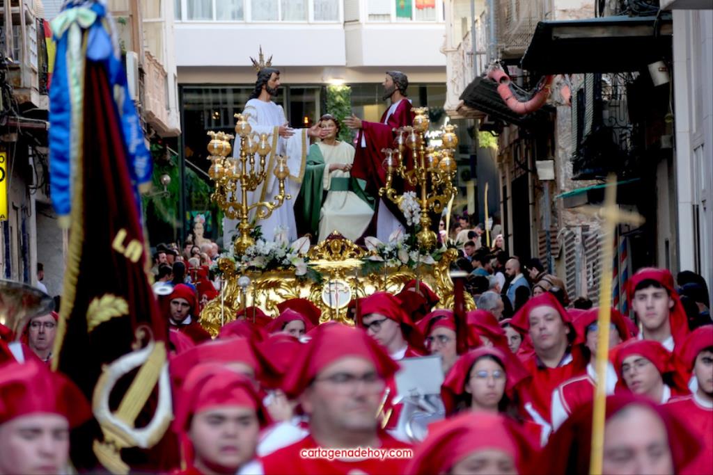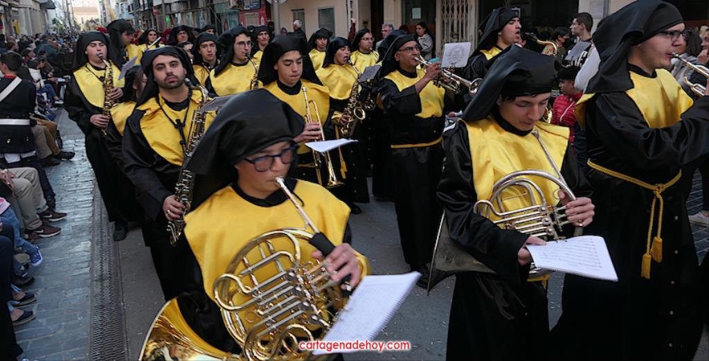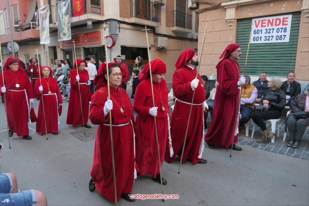 La procesión también ha tenido sus novedades, en especial el estreno de Dies Palmarum', composición creada por Joaquín Grau, quien ha acompañado en la tarde del estreno a la agrupación del Cristo de la Sentencia, donde los músicos de La Unión la han interpretado en varios momentos. Por cierto, además de este vecino municipio, se han dado cita esta tarde, que hayamos visto (y oído), colectivos musicales también de Torre Pacheco, Cartagena y de la alicantina población de Catral. Otros acompañantes han sido el escultor Juan José Quirós con el Ósculo delante del trono que lleva a 'Los milagros de Jesús: la curación del ciego', cuyas tallas son obra del artista de Santa Lucía. Por su parte, la vicealcaldesa, Ana Belén Castejón, ha acompañado al trono sampedristas llevado por las jóvenes damas y el 'Procesionista del año', Francisco Ramón Sánchez, ha salido con los suyos de la agrupación de la Virgen que lleva al grupo escultórico de 'Jesús con los niños', en el que en una artesanal jaula de madera va el canario 'Bendito' desde que este grupo lo crease el escultor Hernández Navarro.