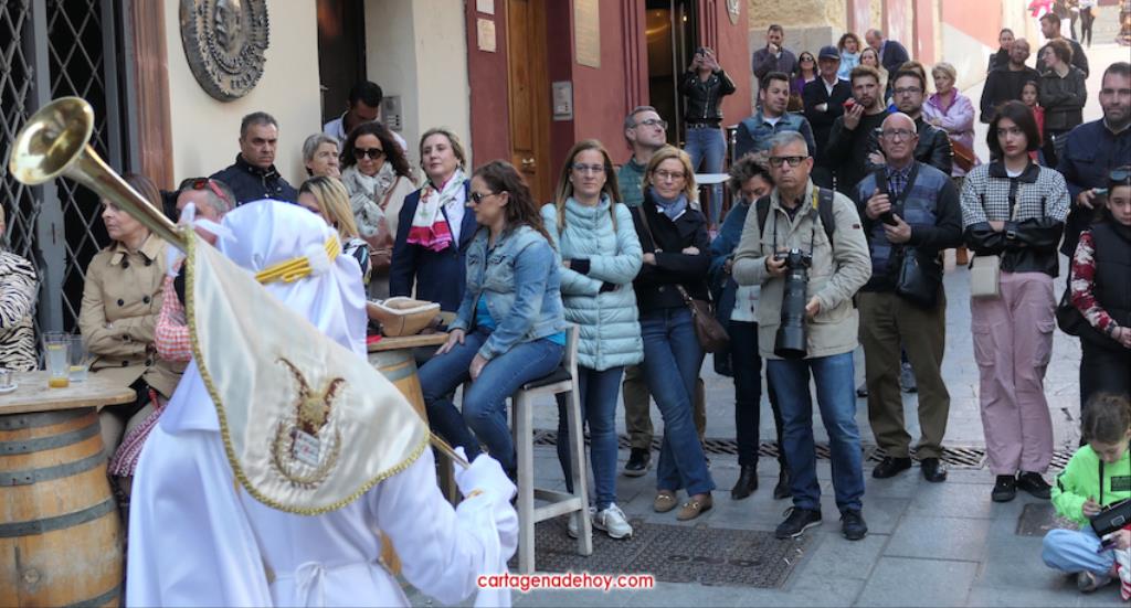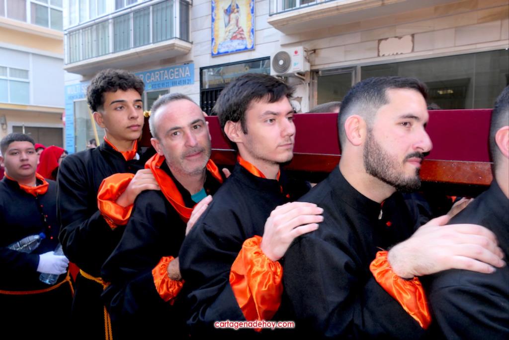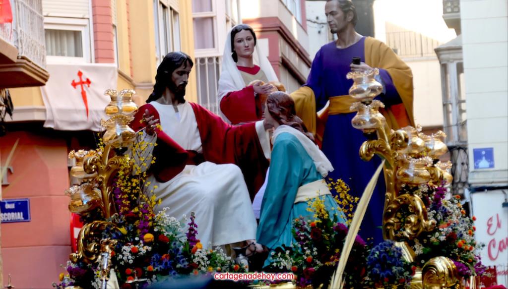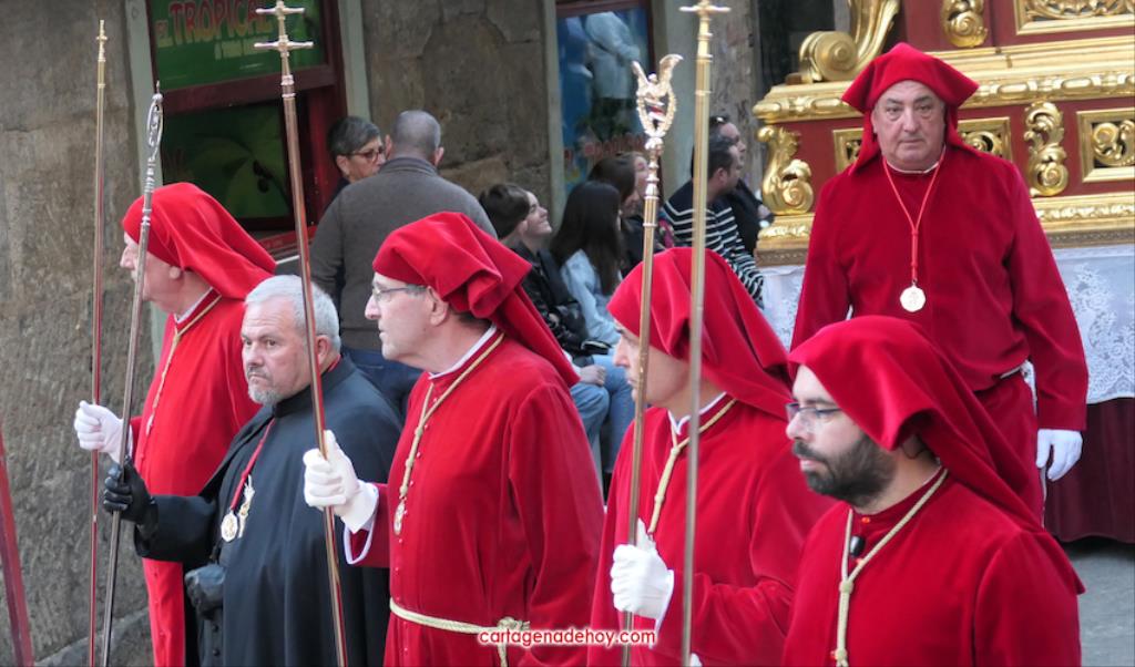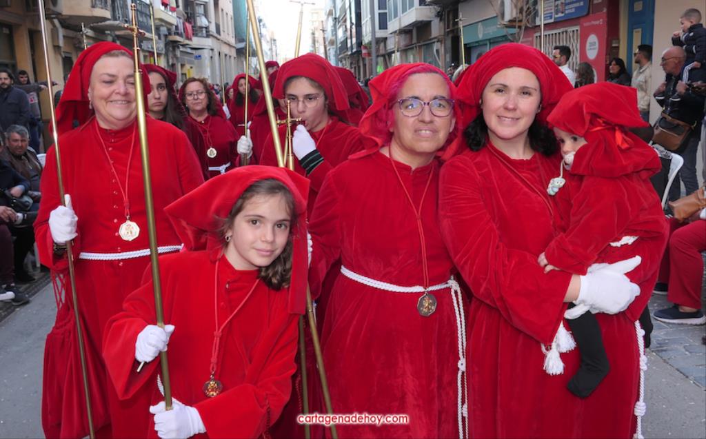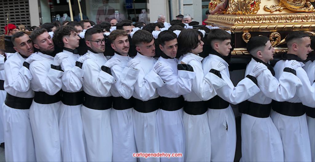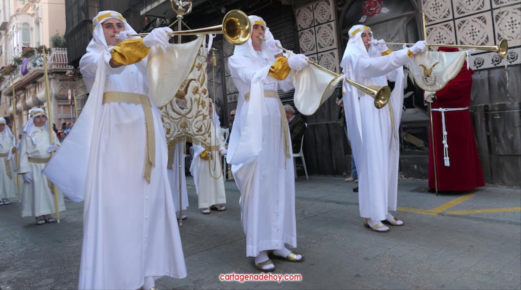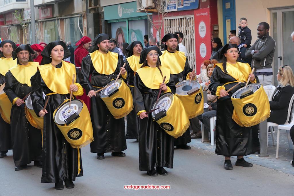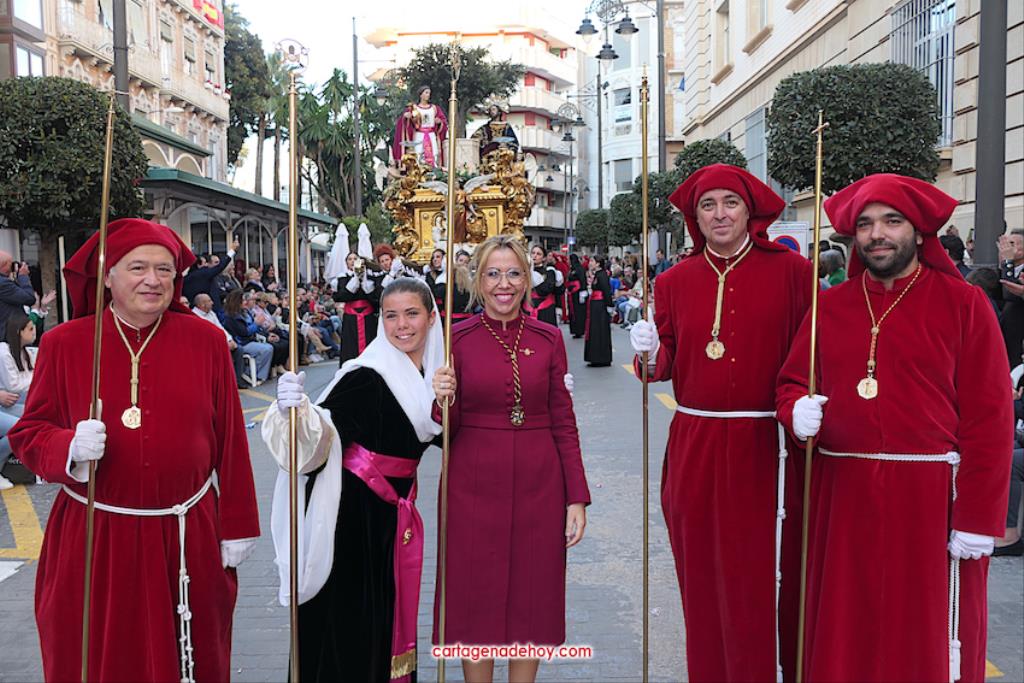La procesión también ha tenido sus novedades, en especial el estreno de Dies Palmarum', composición creada por Joaquín Grau, quien ha acompañado en la tarde del estreno a la agrupación del Cristo de la Sentencia, donde los músicos de La Unión la han interpretado en varios momentos. Por cierto, además de este vecino municipio, se han dado cita esta tarde, que hayamos visto (y oído), colectivos musicales también de Torre Pacheco, Cartagena y de la alicantina población de Catral. Otros acompañantes han sido el escultor Juan José Quirós con el Ósculo delante del trono que lleva a 'Los milagros de Jesús: la curación del ciego', cuyas tallas son obra del artista de Santa Lucía. Por su parte, la vicealcaldesa, Ana Belén Castejón, ha acompañado al trono sampedristas llevado por las jóvenes damas y el 'Procesionista del año', Francisco Ramón Sánchez, ha salido con los suyos de la agrupación de la Virgen que lleva al grupo escultórico de 'Jesús con los niños', en el que en una artesanal jaula de madera va el canario 'Bendito' desde que este grupo lo crease el escultor Hernández Navarro.