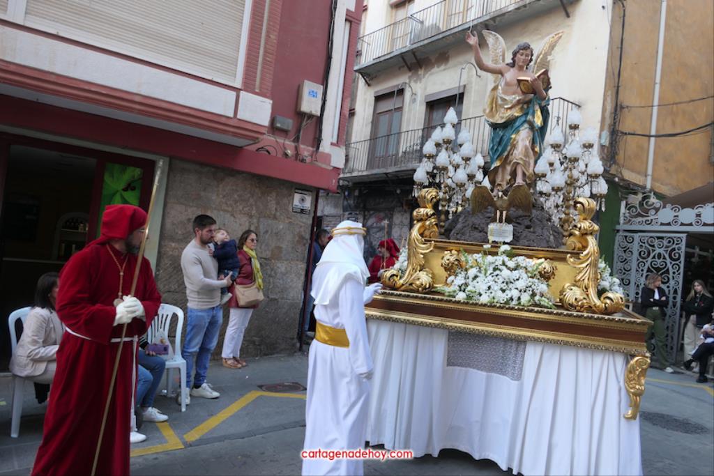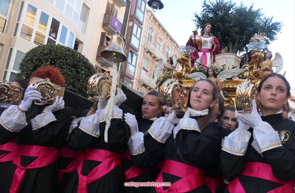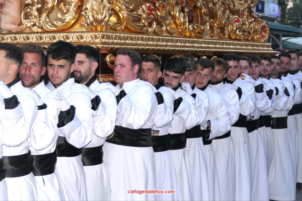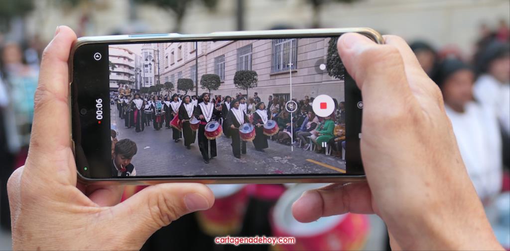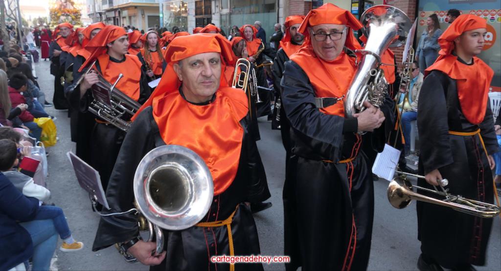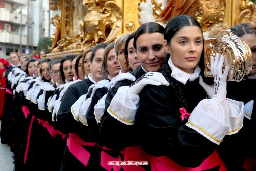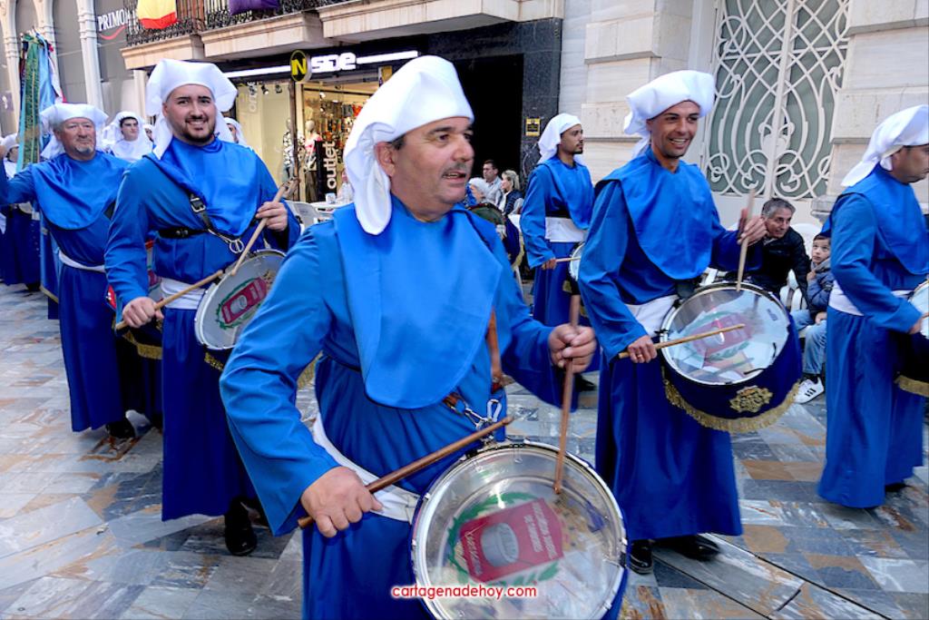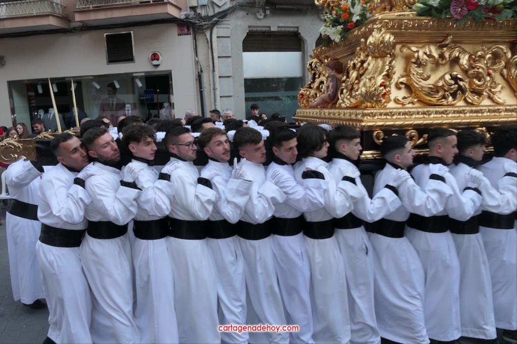La procesión también ha tenido sus novedades, en especial el estreno de Dies Palmarum', composición creada por Joaquín Grau, quien ha acompañado en la tarde del estreno a la agrupación del Cristo de la Sentencia, donde los músicos de La Unión la han interpretado en varios momentos. Por cierto, además de este vecino municipio, se han dado cita esta tarde, que hayamos visto (y oído), colectivos musicales también de Torre Pacheco, Cartagena y de la alicantina población de Catral. Otros acompañantes han sido el escultor Juan José Quirós con el Ósculo delante del trono que lleva a 'Los milagros de Jesús: la curación del ciego', cuyas tallas son obra del artista de Santa Lucía. Por su parte, la vicealcaldesa, Ana Belén Castejón, ha acompañado al trono sampedristas llevado por las jóvenes damas y el 'Procesionista del año', Francisco Ramón Sánchez, ha salido con los suyos de la agrupación de la Virgen que lleva al grupo escultórico de 'Jesús con los niños', en el que en una artesanal jaula de madera va el canario 'Bendito' desde que este grupo lo crease el escultor Hernández Navarro.