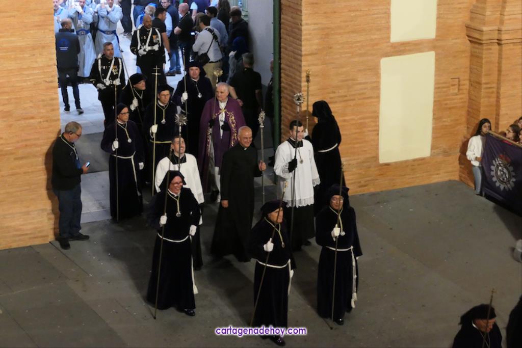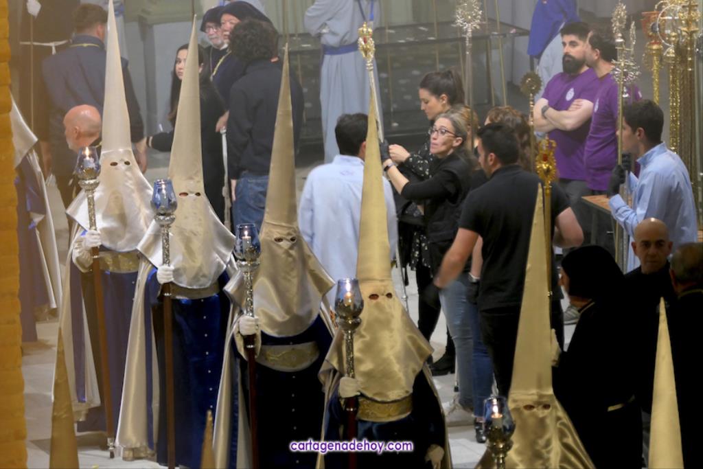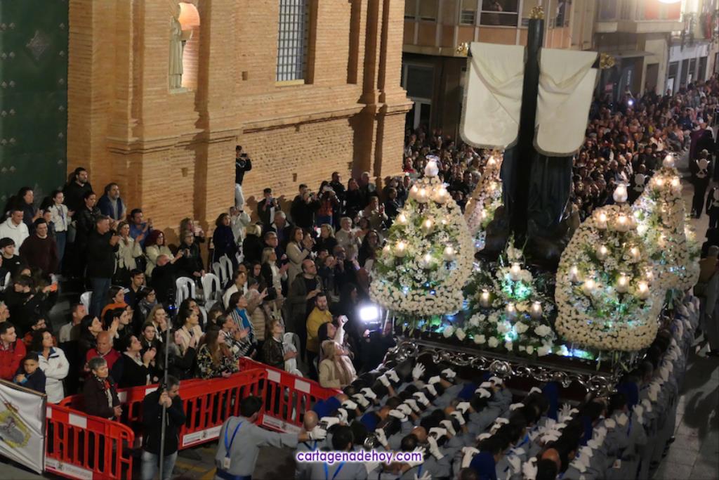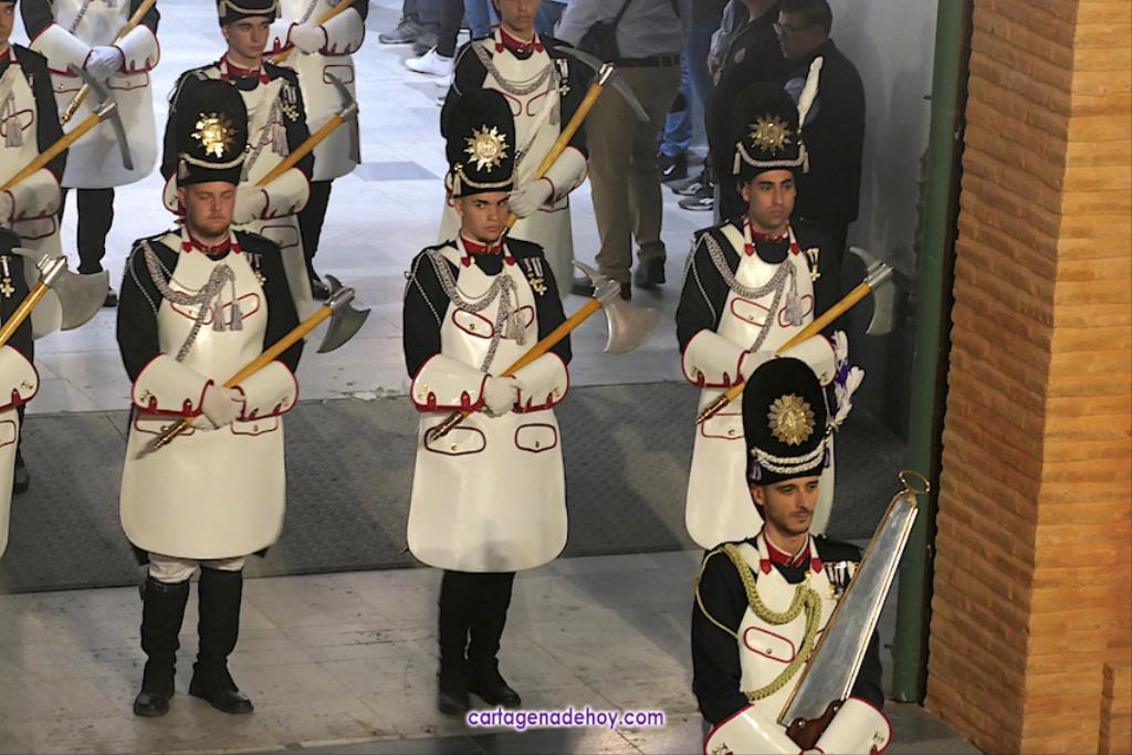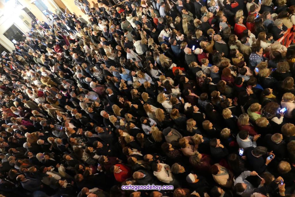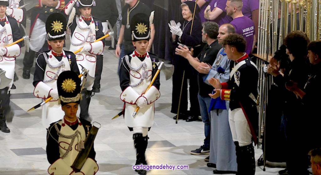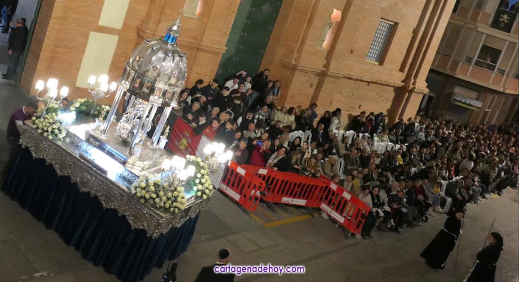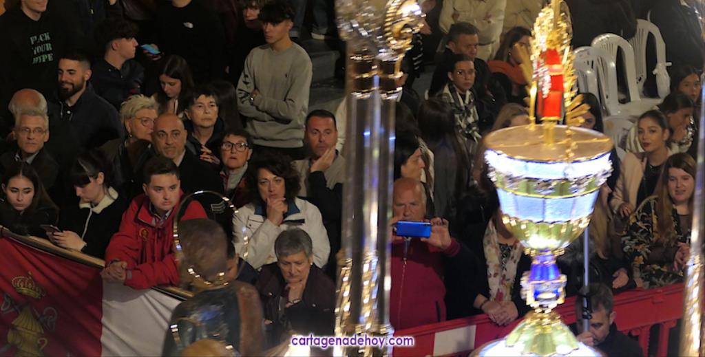 A las diez y siete minutos toda la procesión estaba en la calle. Veinte minutos después de la medianoche ha llegado el primer trono, el Cáliz, que en otro tiempo fue carro insignia de la cofradía, a Santa María. A la una menos veinte lo ha hecho la cúpula de la Caridad y a la una ha alcanzado el trono principal la emblemática rampa de la iglesia, dentro de una recogida en la que se ha ofrecido la última saeta de la noche (con la ganadora del certamen organizado fechas atrás, Ana Cayetana Atienza) y que que ha culminado con el emocionante canto de la salve cartagenera, la interpretación del himno de España, los cohetes estallando en el cielo y los momentos de mayor júbilo de la noche.