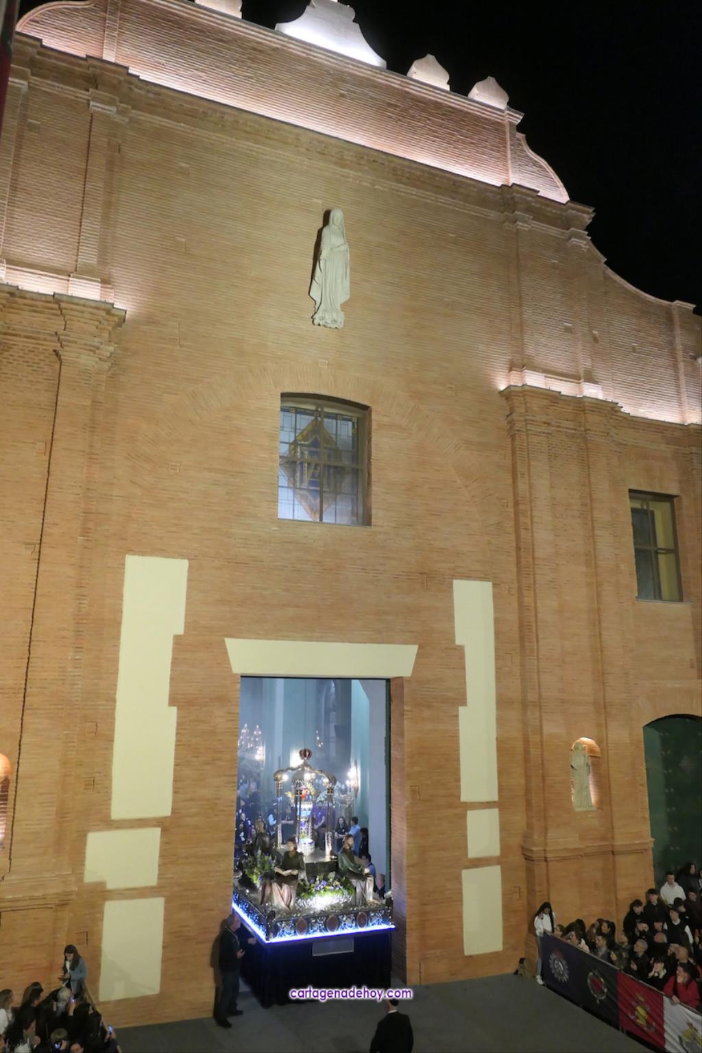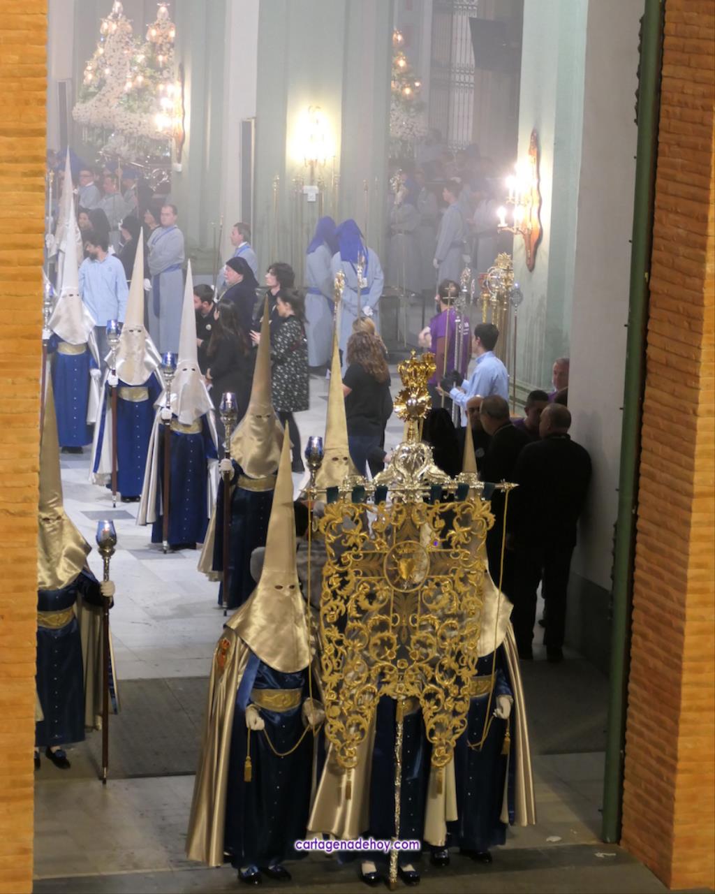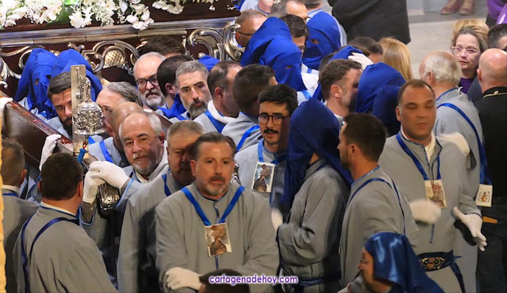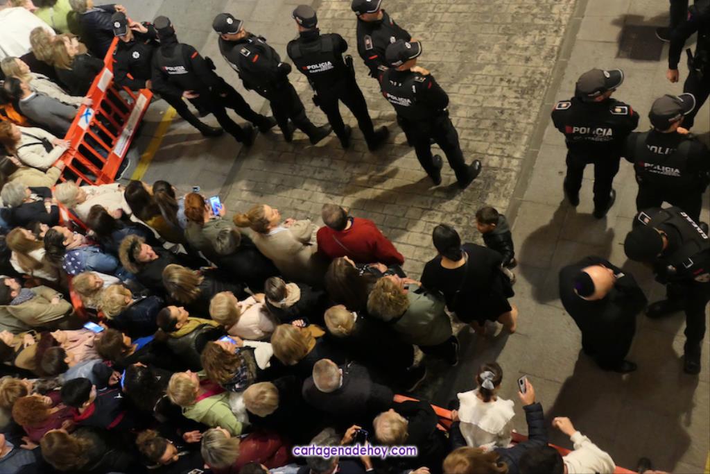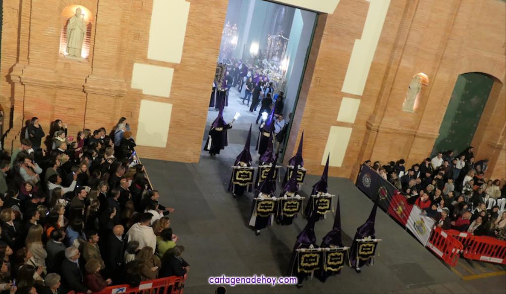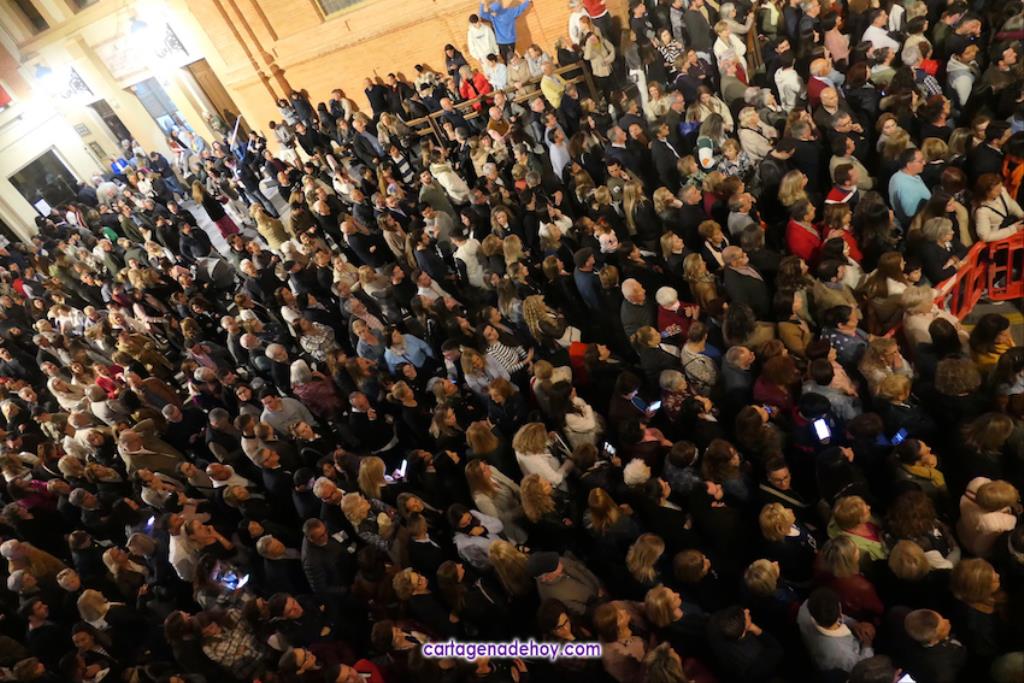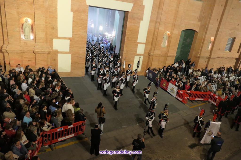 A las diez y siete minutos toda la procesión estaba en la calle. Veinte minutos después de la medianoche ha llegado el primer trono, el Cáliz, que en otro tiempo fue carro insignia de la cofradía, a Santa María. A la una menos veinte lo ha hecho la cúpula de la Caridad y a la una ha alcanzado el trono principal la emblemática rampa de la iglesia, dentro de una recogida en la que se ha ofrecido la última saeta de la noche (con la ganadora del certamen organizado fechas atrás, Ana Cayetana Atienza) y que que ha culminado con el emocionante canto de la salve cartagenera, la interpretación del himno de España, los cohetes estallando en el cielo y los momentos de mayor júbilo de la noche.