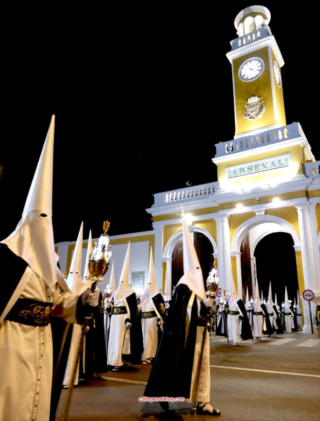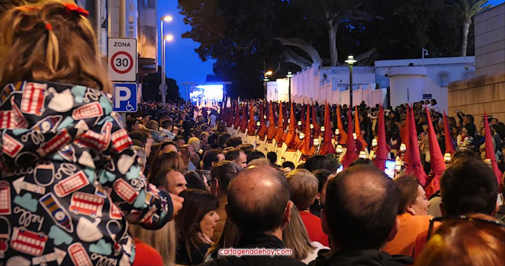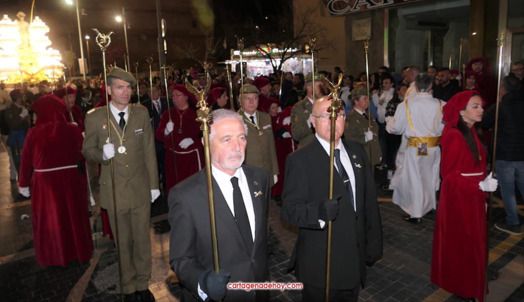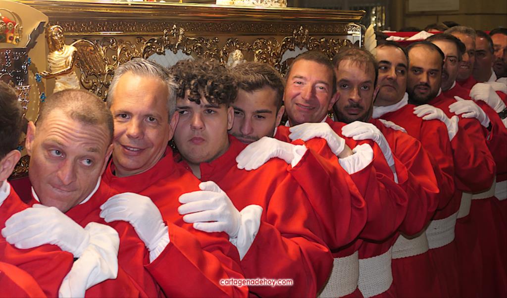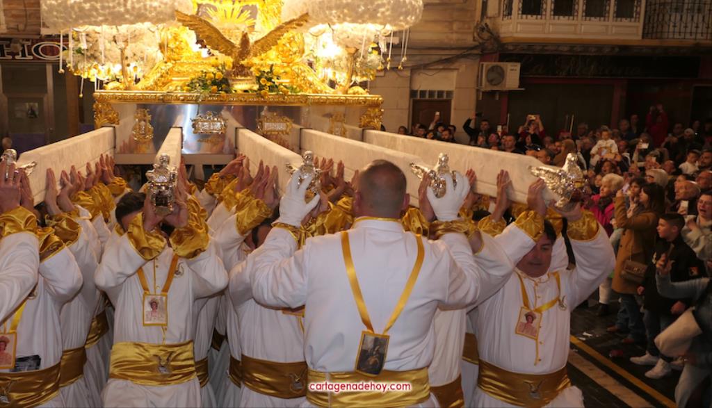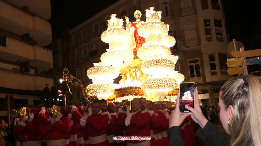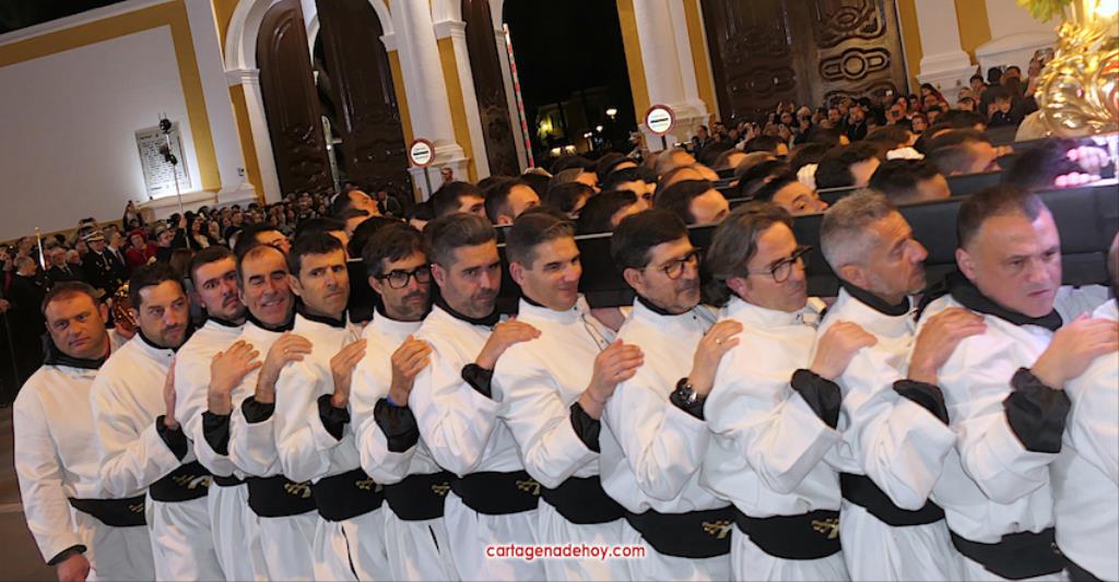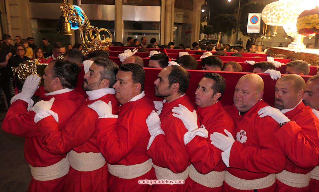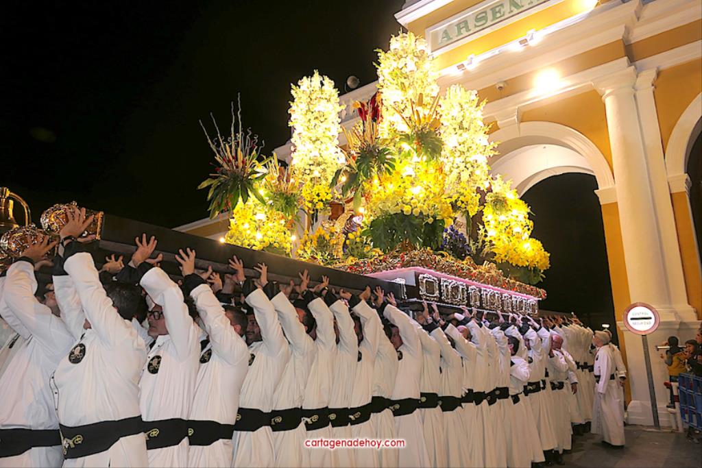 De misión en misión. Unos eligen la salida del San Juan, otros la de Santiago y muchos la de San Pedro, pero también hay quienes intentan estar en todas y los que combinan una salida con otros momentos especiales, como cuando Pedro Marina Cartagena (el nombre del DNI de quien fue el primer Papa) cruza el pórtico del Arsenal, como ver y escuchar a los portapasos santiaguistas cruzar la calle Mayor sin poner el trono en el suelo con su peculiar ‘grito de guerra’ (“¿De quién es la calle Mayor?, ¡Del Santiago!”) o cuando la punta de las varas del trono del Discípulo Amado se meten en la entrada de la Real Basílica Menor de la Virgen de la Caridad. Luego, gran parte coincide en no perderse las recogidas de las tres formaciones en Santa María. Es noche de trasiegos, diferente a las habituales de la Cartagena semanasantera, pero también cargada de emociones y alicientes.