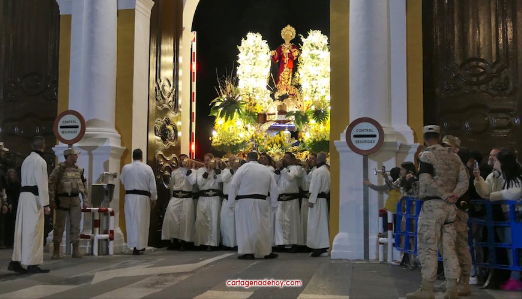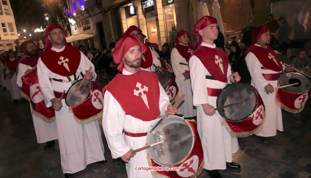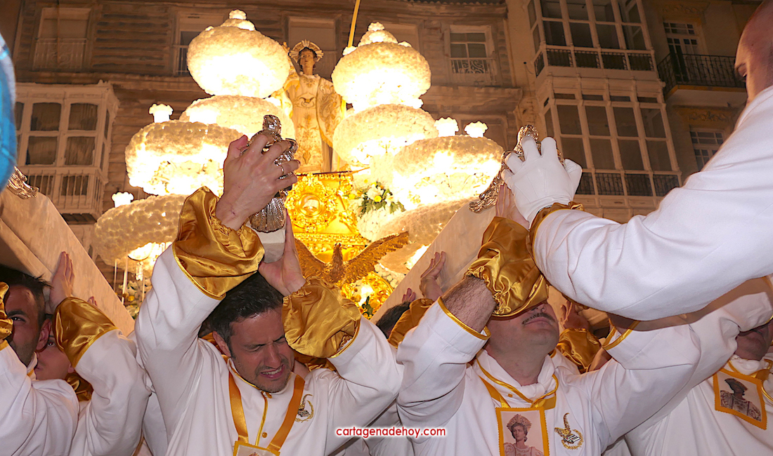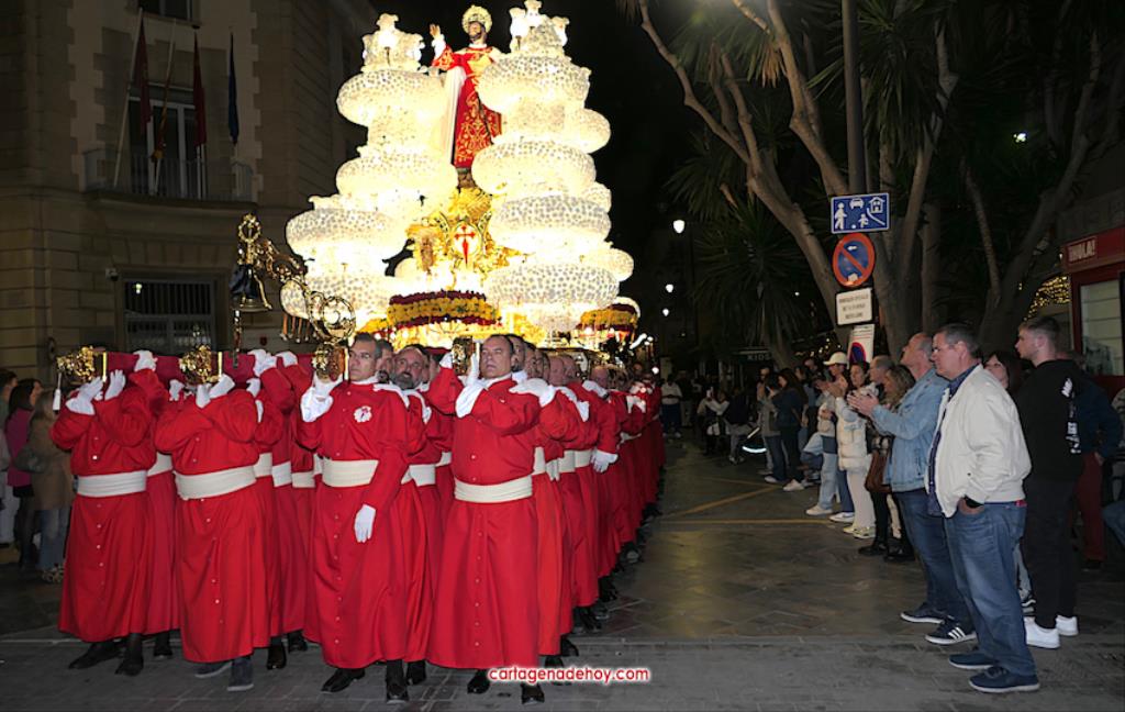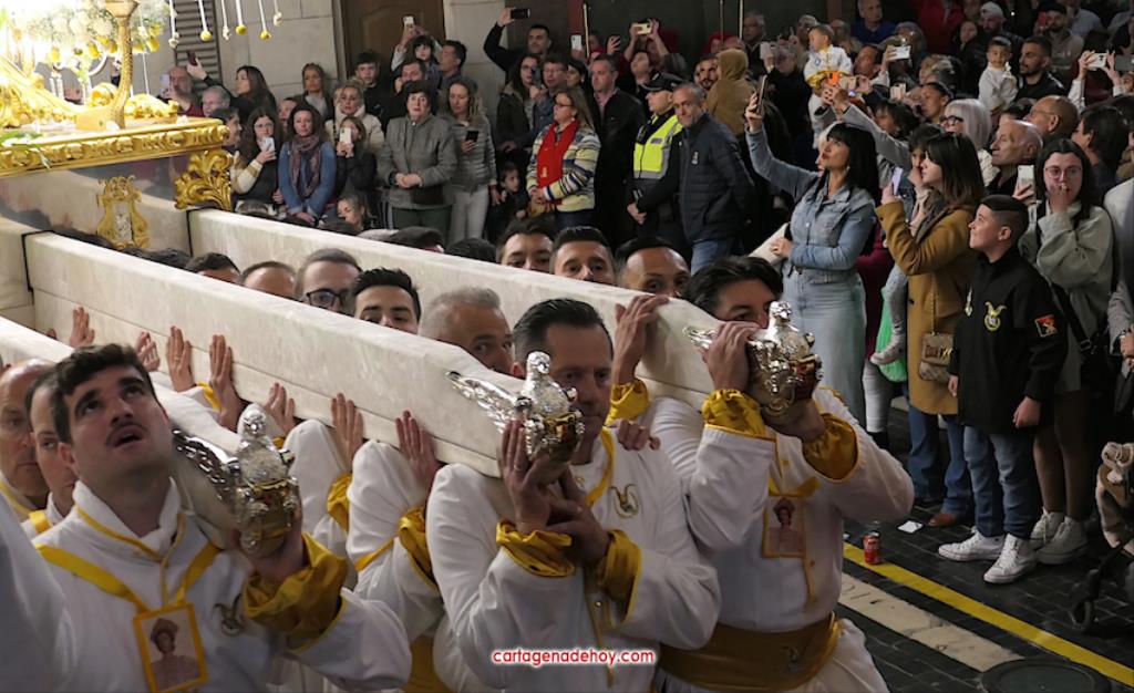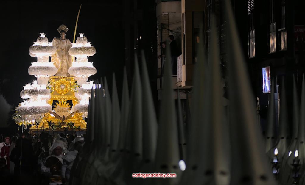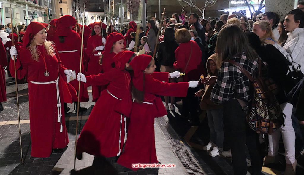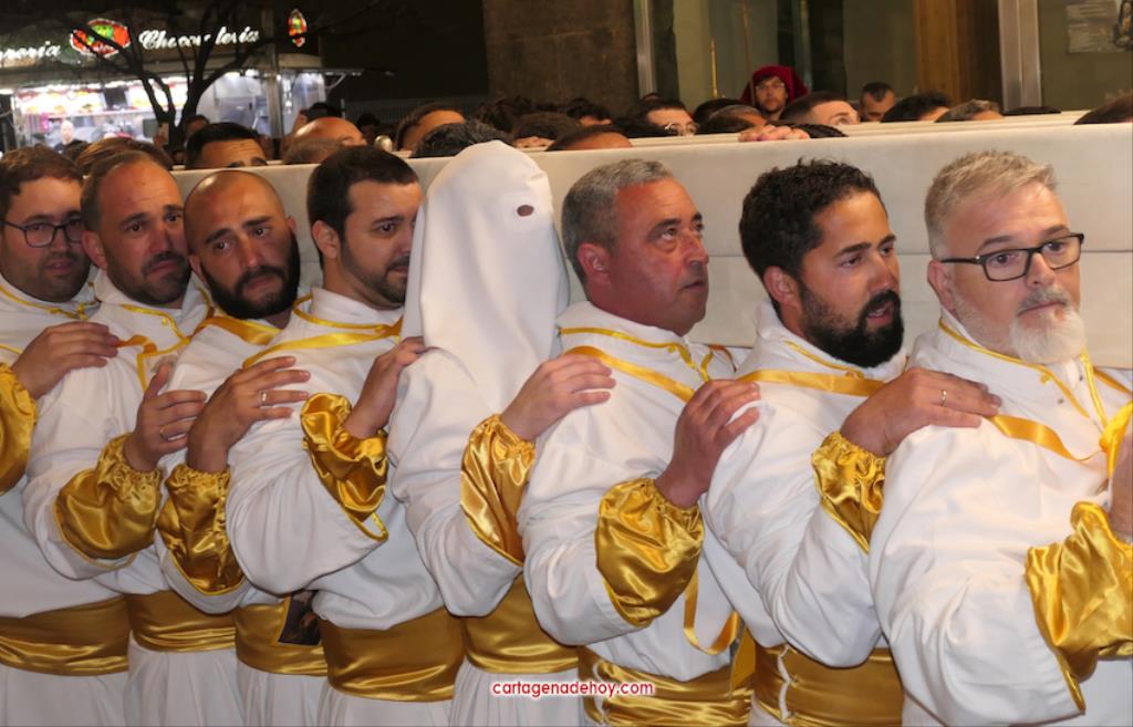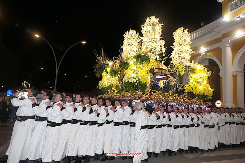 De misión en misión. Unos eligen la salida del San Juan, otros la de Santiago y muchos la de San Pedro, pero también hay quienes intentan estar en todas y los que combinan una salida con otros momentos especiales, como cuando Pedro Marina Cartagena (el nombre del DNI de quien fue el primer Papa) cruza el pórtico del Arsenal, como ver y escuchar a los portapasos santiaguistas cruzar la calle Mayor sin poner el trono en el suelo con su peculiar ‘grito de guerra’ (“¿De quién es la calle Mayor?, ¡Del Santiago!”) o cuando la punta de las varas del trono del Discípulo Amado se meten en la entrada de la Real Basílica Menor de la Virgen de la Caridad. Luego, gran parte coincide en no perderse las recogidas de las tres formaciones en Santa María. Es noche de trasiegos, diferente a las habituales de la Cartagena semanasantera, pero también cargada de emociones y alicientes.