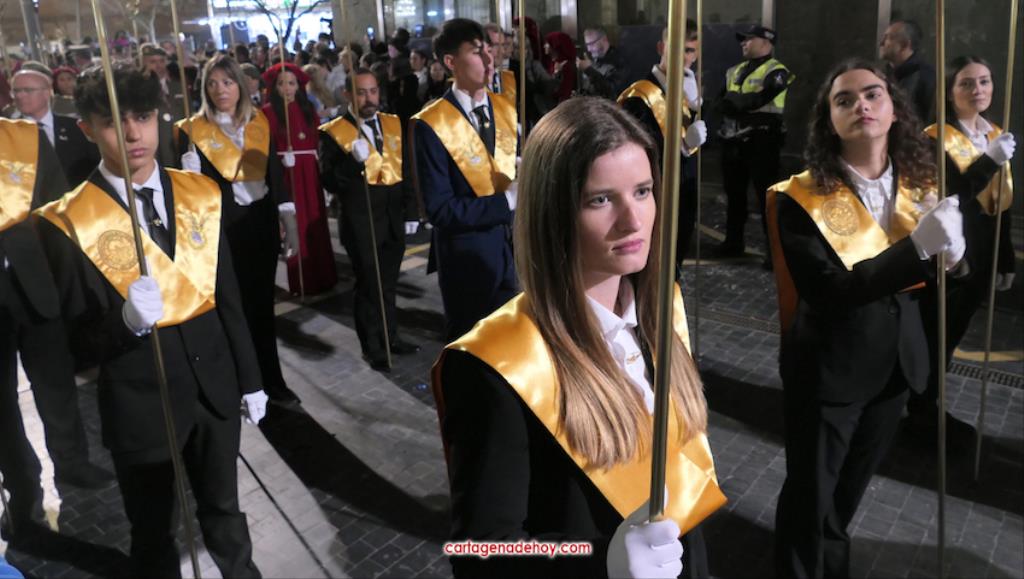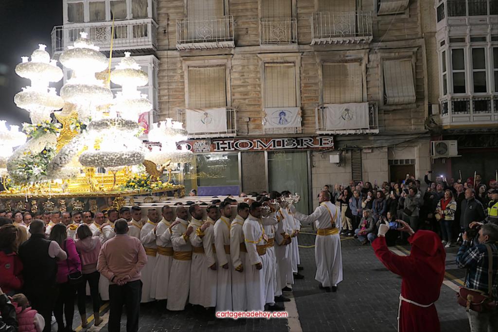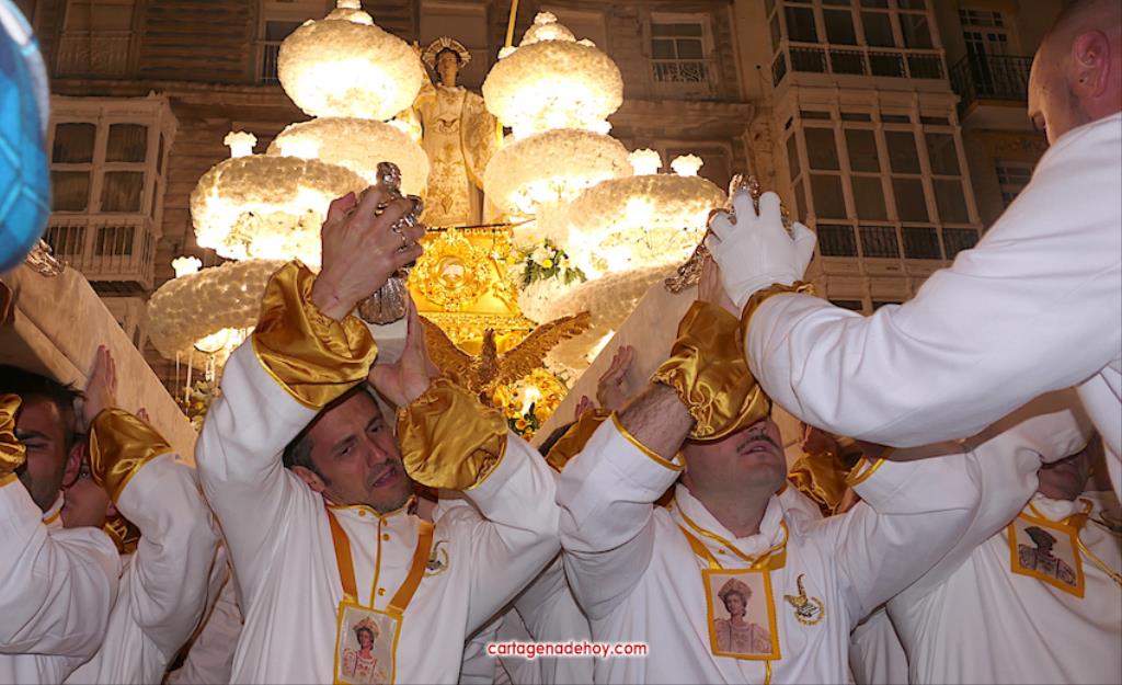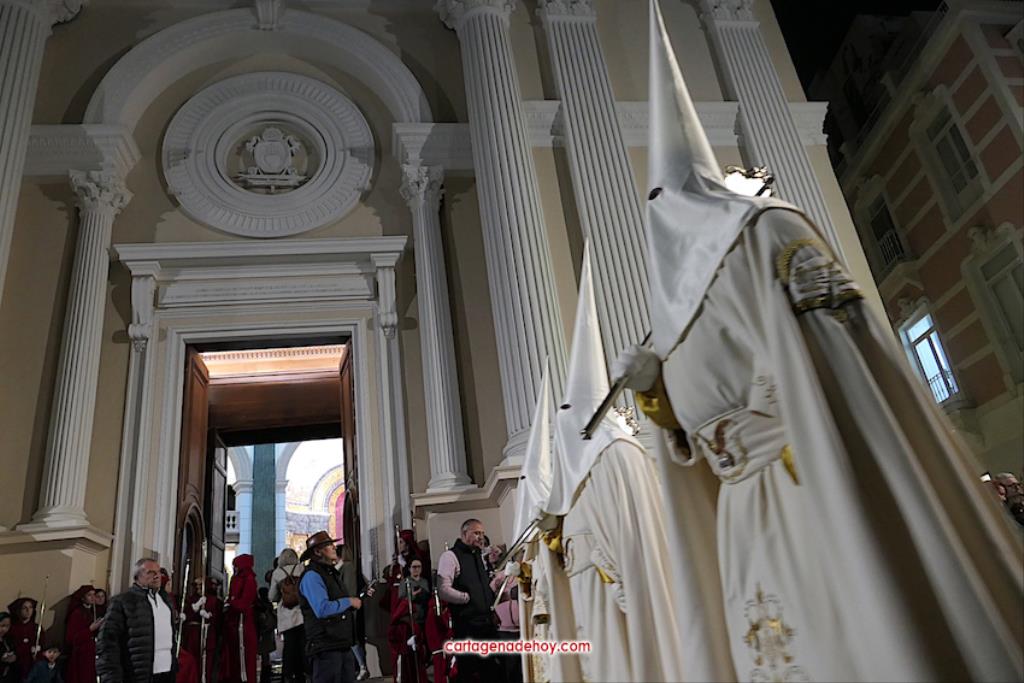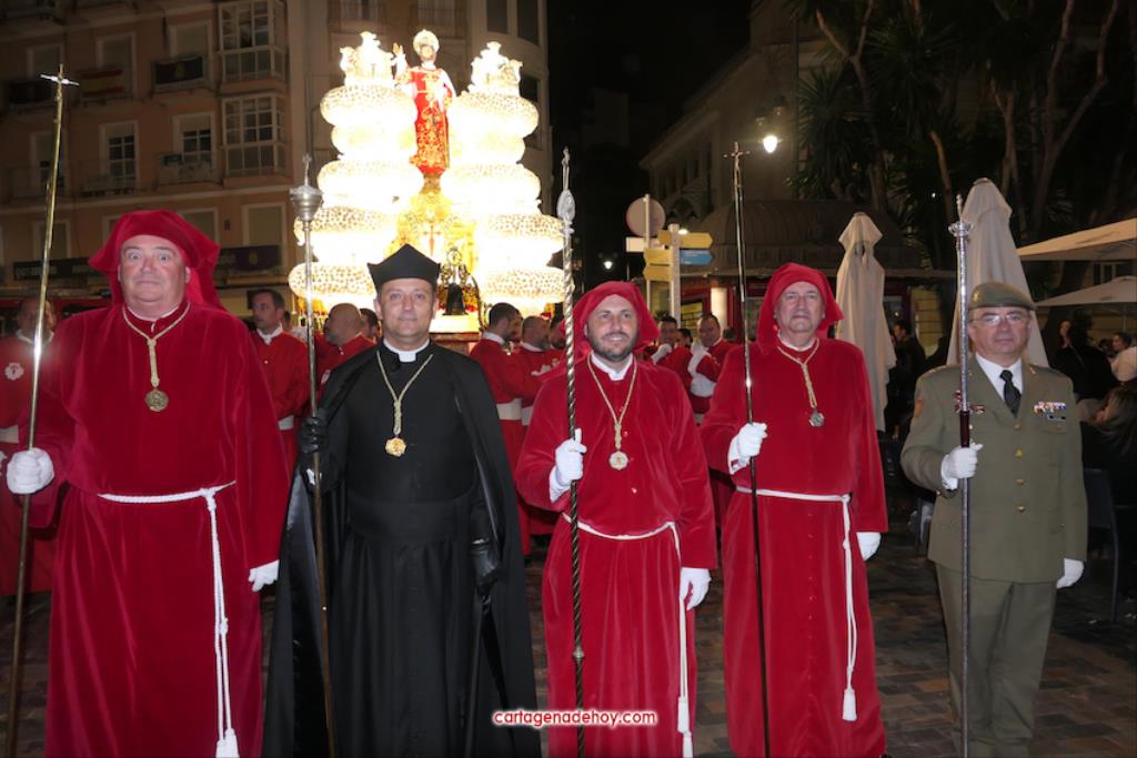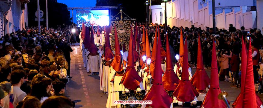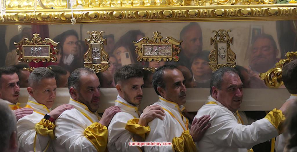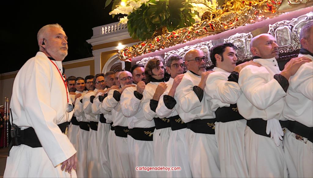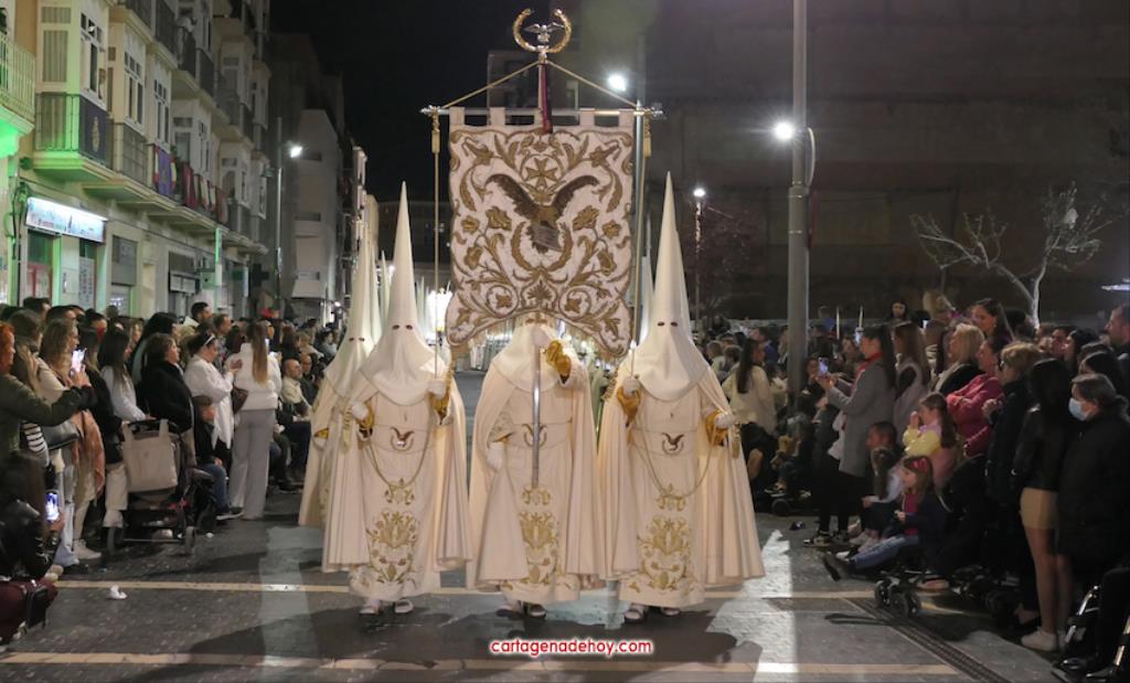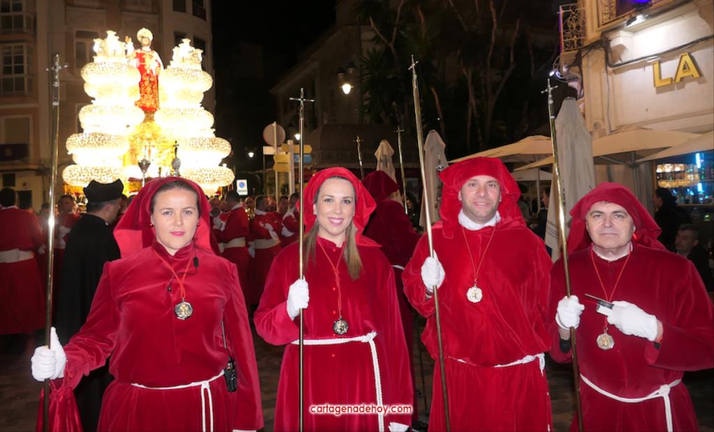 De misión en misión. Unos eligen la salida del San Juan, otros la de Santiago y muchos la de San Pedro, pero también hay quienes intentan estar en todas y los que combinan una salida con otros momentos especiales, como cuando Pedro Marina Cartagena (el nombre del DNI de quien fue el primer Papa) cruza el pórtico del Arsenal, como ver y escuchar a los portapasos santiaguistas cruzar la calle Mayor sin poner el trono en el suelo con su peculiar ‘grito de guerra’ (“¿De quién es la calle Mayor?, ¡Del Santiago!”) o cuando la punta de las varas del trono del Discípulo Amado se meten en la entrada de la Real Basílica Menor de la Virgen de la Caridad. Luego, gran parte coincide en no perderse las recogidas de las tres formaciones en Santa María. Es noche de trasiegos, diferente a las habituales de la Cartagena semanasantera, pero también cargada de emociones y alicientes.
