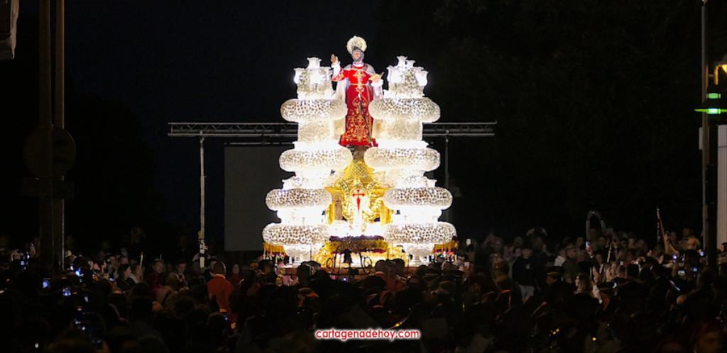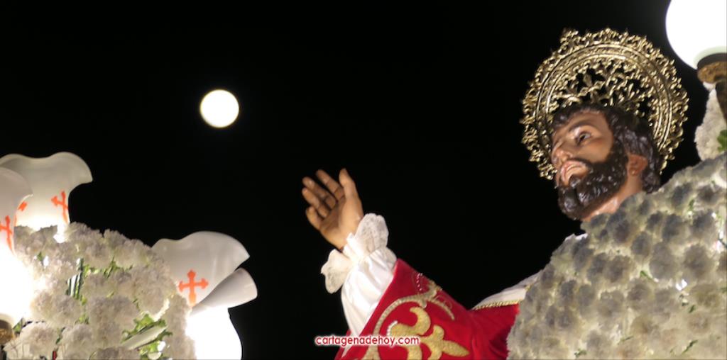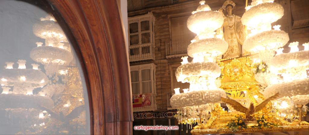 Desde el Parque de Artillería se ha puesto en marcha San Juan. El acto estaba programado para las 20.40 horas y una hora más tarde es cuando se ha ‘asomado’ a la basílica de la patrona, instantes después de que su madrina, Ana Gómez San Nicolás, fuese la encargada de efectuar la tradicional ofrenda floral. A continuación ha cruzado la Serreta, se ha adentrado por la plaza de San Ginés y ha bajado por Jara hasta colocarse detrás de sus hermanos santiaguistas en la procesión.