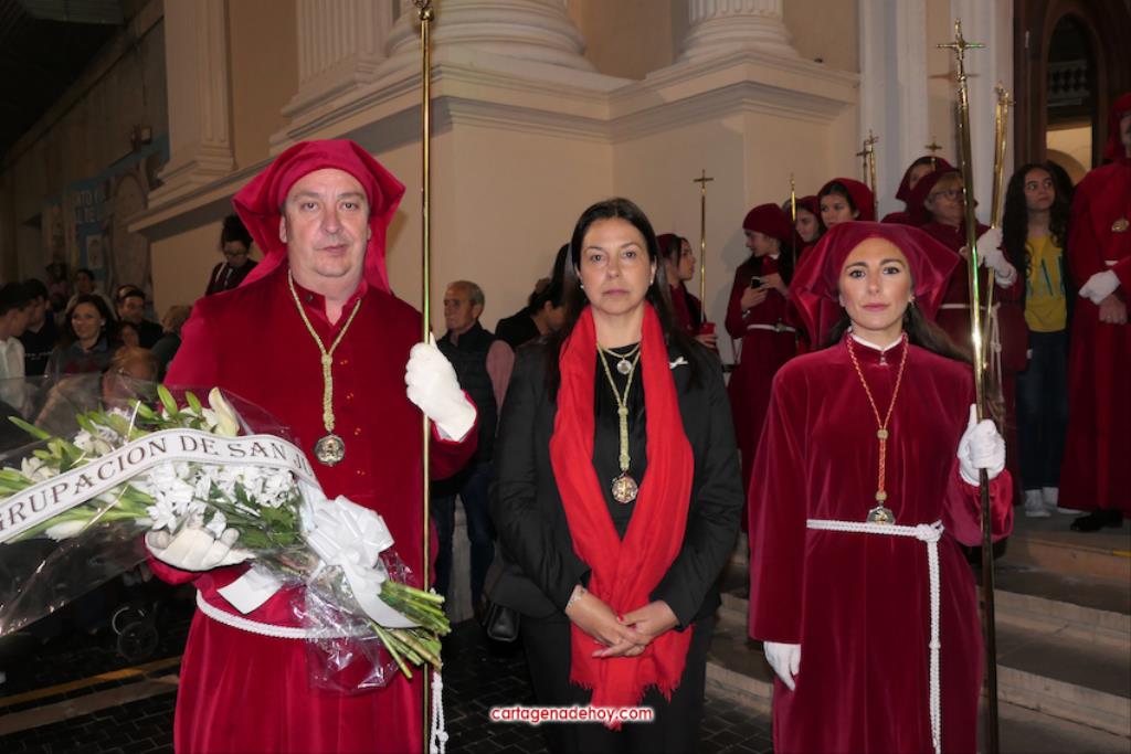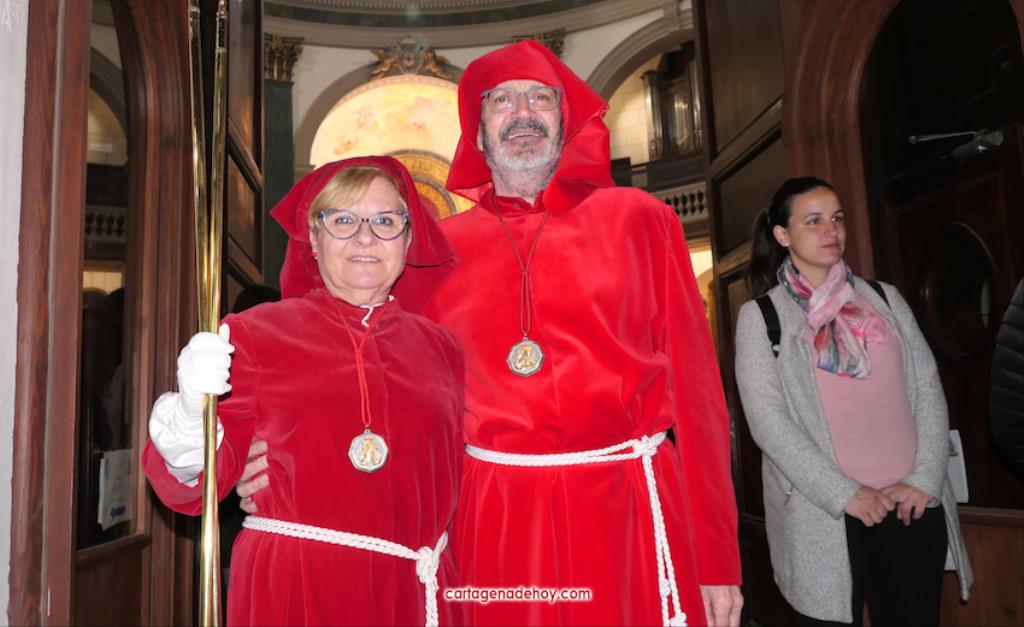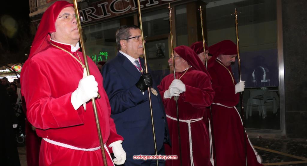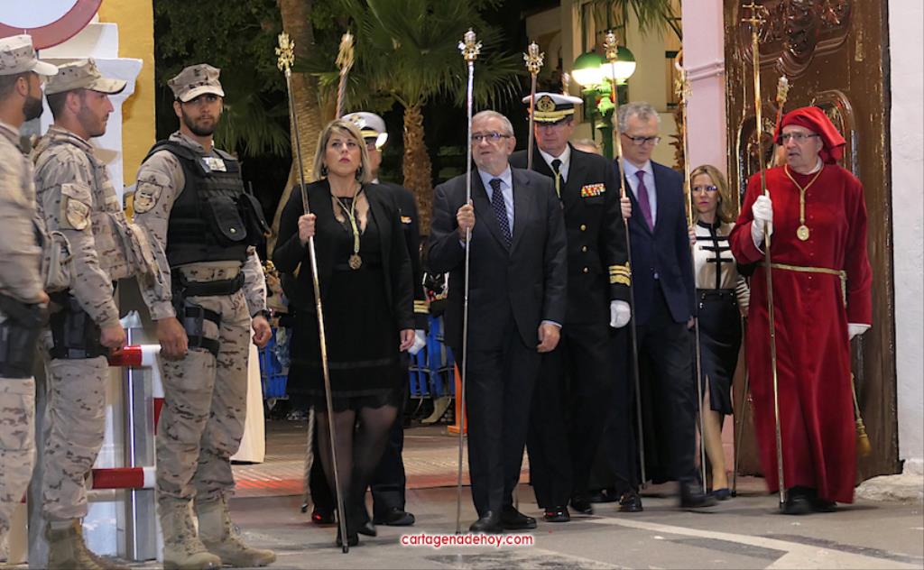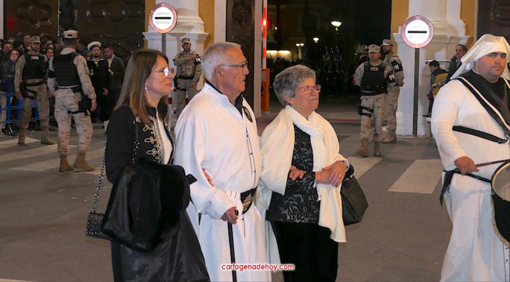 La alcaldesa, Noelia Arroyo, ha visitado a los tres santos, quedando como acompañante de San Pedro, junto al presidente de la Asamblea Regional, un consejero, el hermano mayor californio y la ‘Nazarena mayor’, Margarita García Segarra, mientras que el ‘Procesionista del año’ ha marchado con San Juan. Destacar también que el sacerdote cartagenero José Manuel Martínez Rosique, sigue viniendo a su tierra cada vez que puede en esta fechas. Quien fue capellán del Cristo del Socorro, director espiritual de varias agrupaciones californias y pregonero de la Semana Santa estuvo en el vía crucis de la primera madrugada y anoche con los santiaguistas.