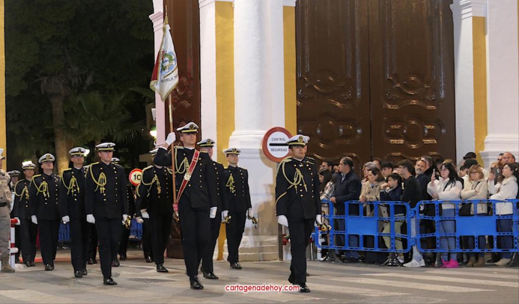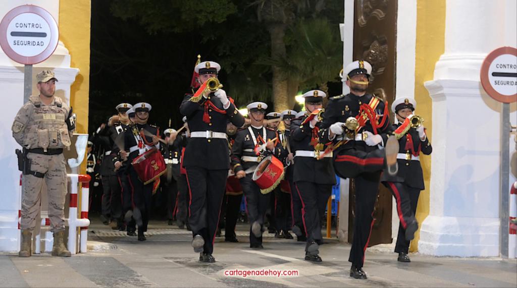 San Pedro, antes de salir, tiene ‘faena’ dentro del Arsenal. Primero el acto junto al muelle con homenaje a los caídos y después la solicitud para que se le levante el arresto. El almirante ha recordado que su obligación es estar en el cuartel antes de la medianoche del Miércoles Santo y que ni siquiera cumplió el pasado año, cuando por la lluvia no hubo procesión, pero nuevamente será benévolo y accederá a que se encuentre con el pueblo cartagenero. A las 22.40 horas es cuando ha cruzado el arco central de las puertas del Arsenal, donde le esperaban cientos de personas. El trono ha sido elevado al cielo por su portapasos y después ha seguido la marcha con el tercio por calle Real, Plaza Castellini y Puerta de Murcia.