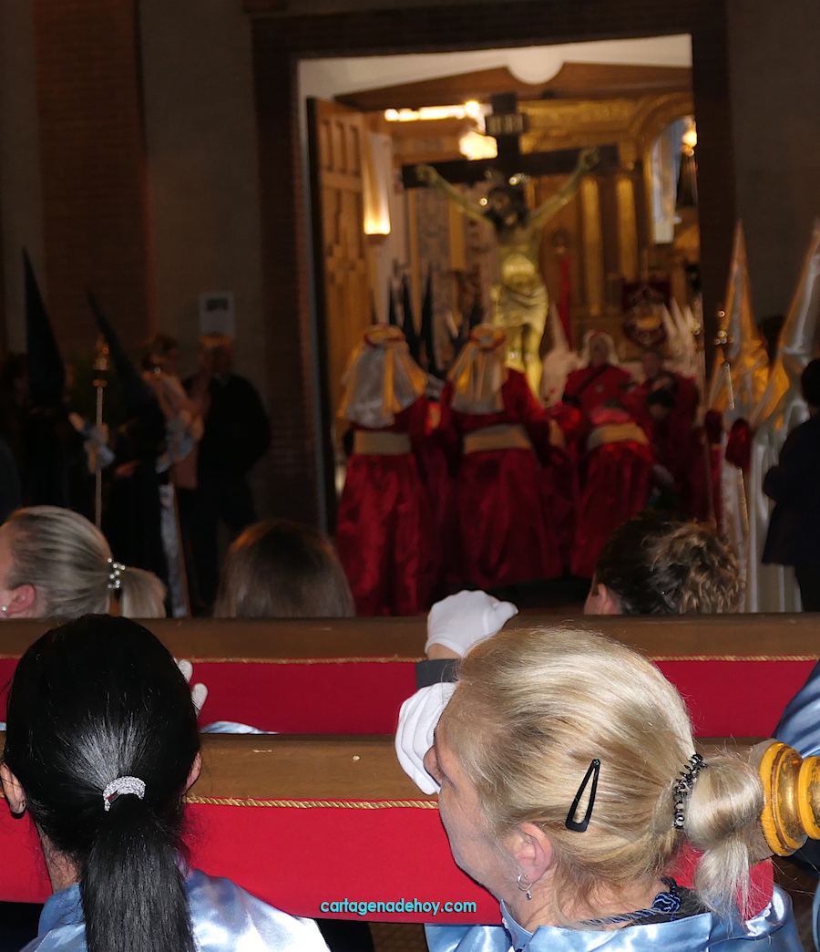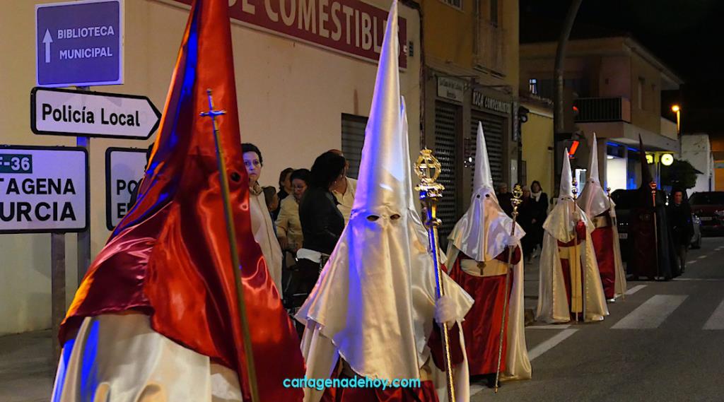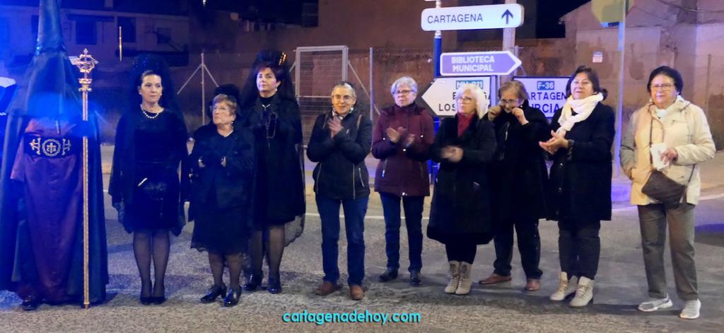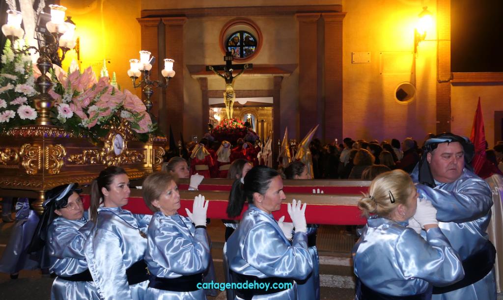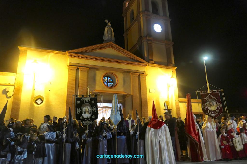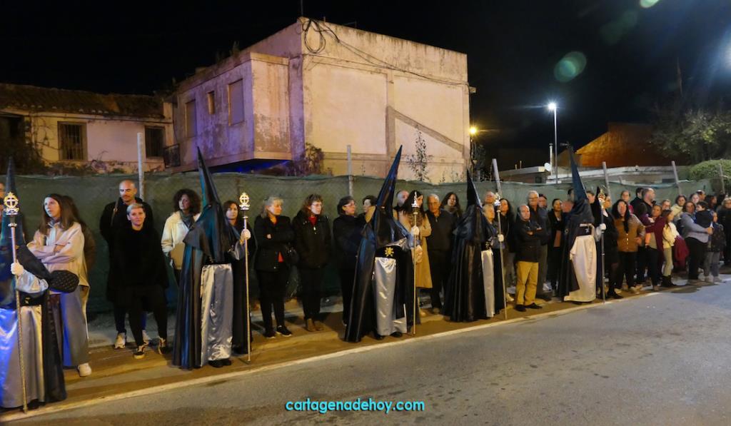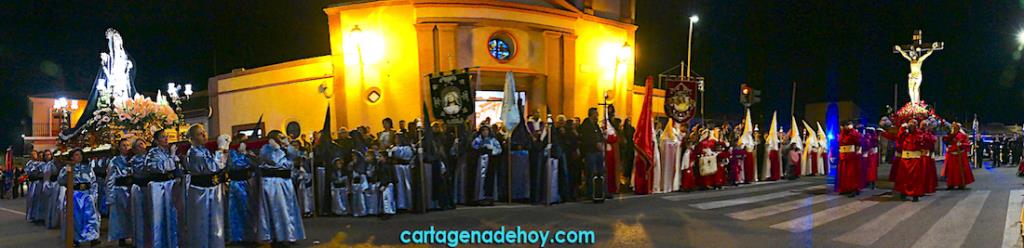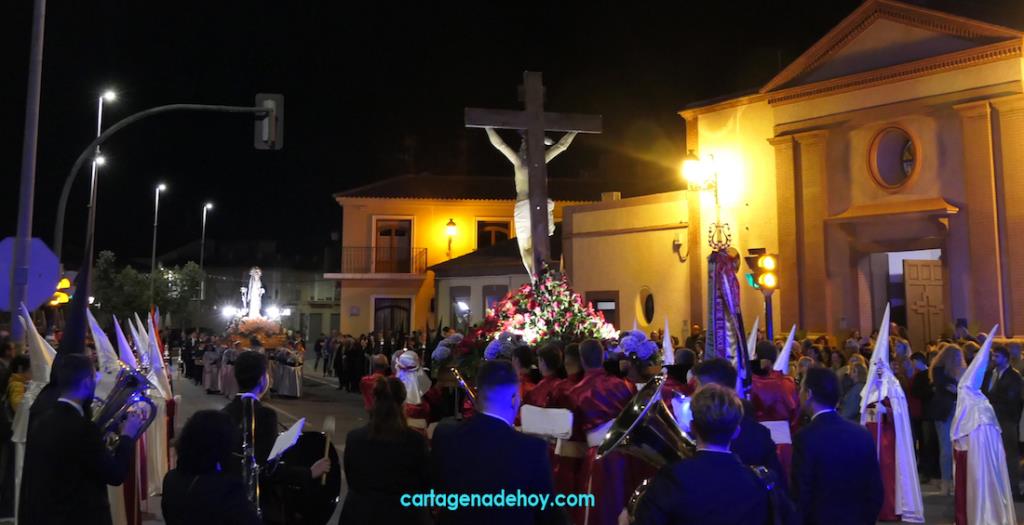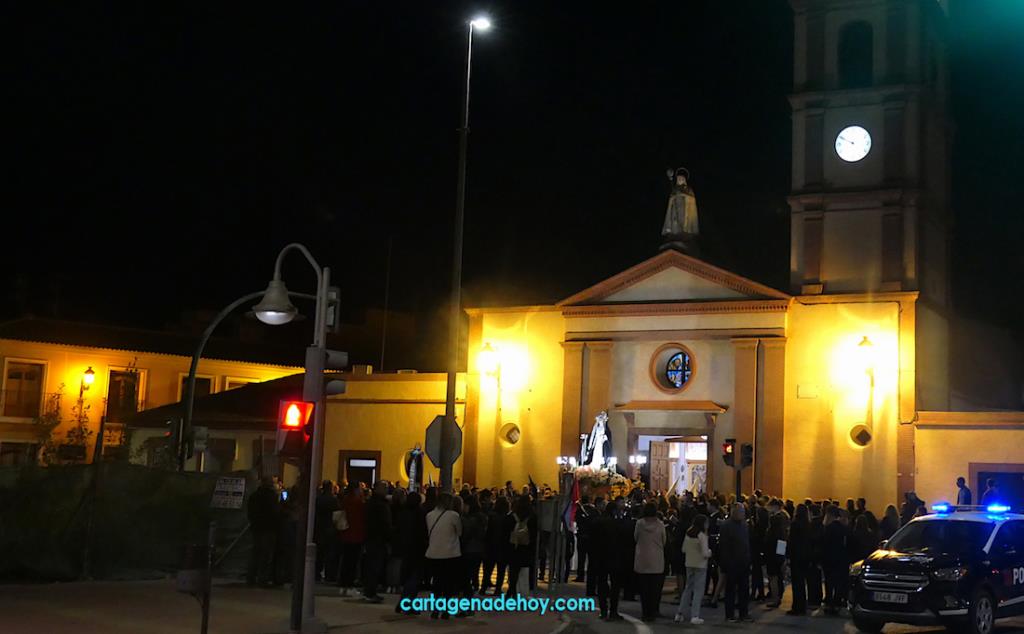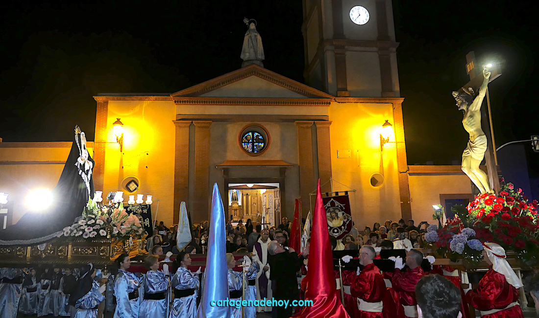 La Palma ofrece cada Semana Santa dos atractivas procesiones. Una es la muy singular que tiene lugar en la medianoche del Viernes Santo y que se adentra en el cementerio. La otra es la que cada Martes Santo se lleva a cabo con las tallas de Cristo Crucificado y de la Virgen de la Soledad, que culmina con el encuentro de ambos, que anoche tuvo lugar delante de la fachada de las más que tres veces centenario iglesia (otras veces se han encontrado los tronos en la curva), en un momento muy especial en el que fueron cantada dos saetas y en el que el párroco, Pedro García Casas, llevó a cabo una alocución-oración sobre el rencor y el valor de perdón. Después, reverencia del trono de la Virgen al de su hijo, que consiste en que las damas portapasos baja el primero mientras que los costaleros varones elevan el otro. Las dos tallas se recogen entrando de espaldas en la iglesia para 'mirar' al pueblo, sonando en este cruce de pórtico el himno de España, al que se suma la salve cartagenera en el caso de la Soledad. Una vez dentro, llegan hasta el altar mientras los penitentes que ha participado en la procesión le tributan numerosos aplausos.