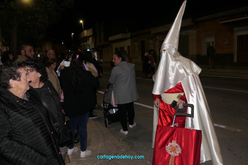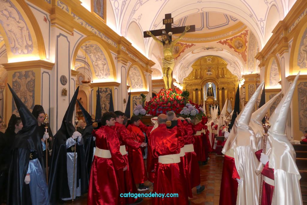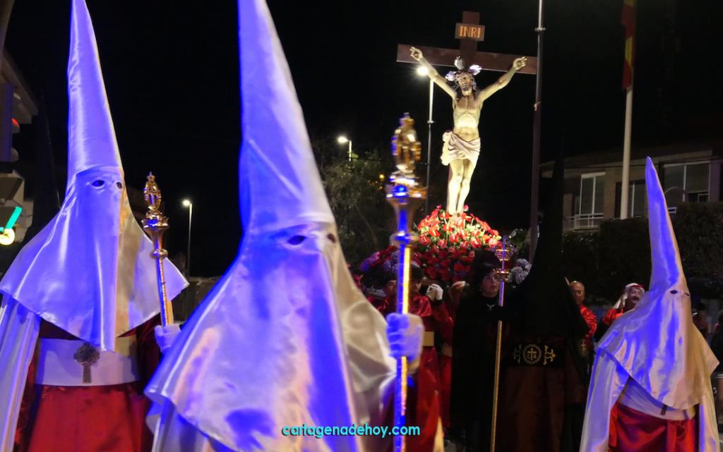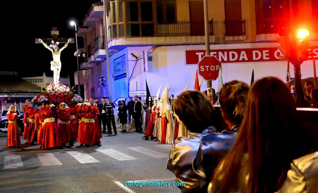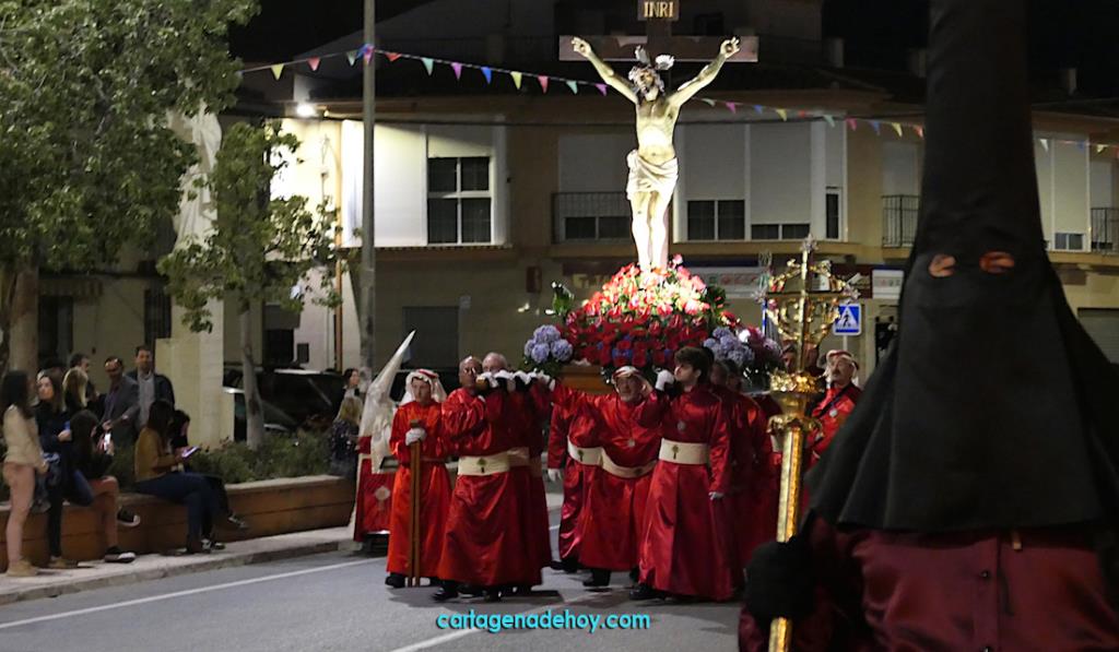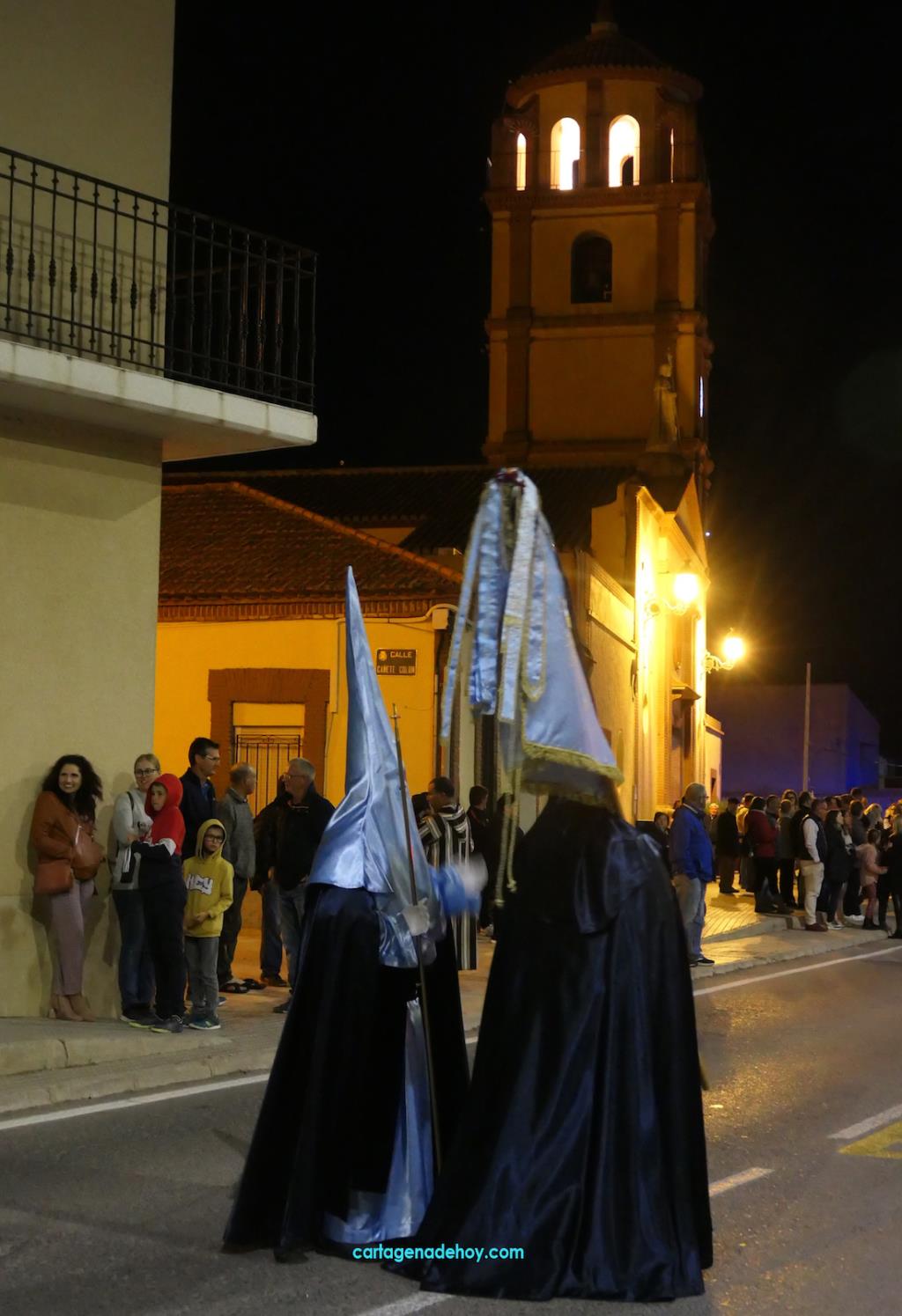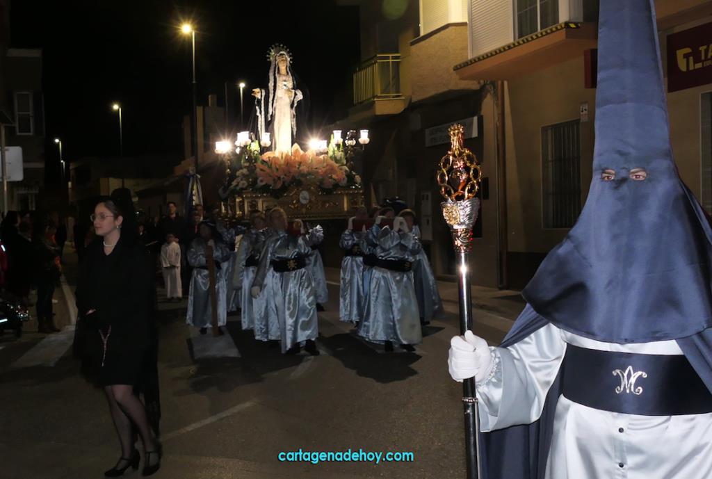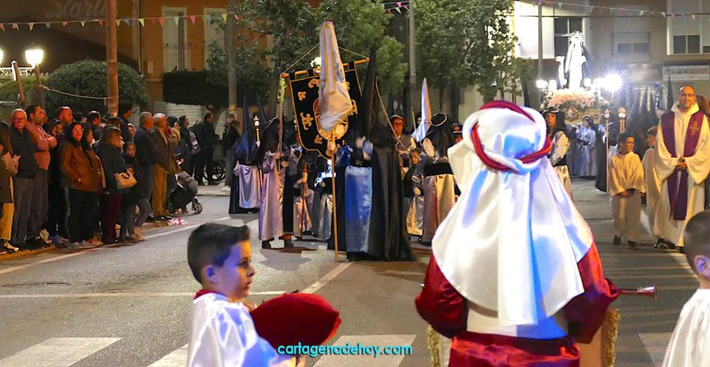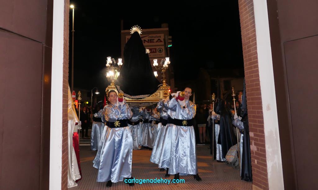 La Palma ofrece cada Semana Santa dos atractivas procesiones. Una es la muy singular que tiene lugar en la medianoche del Viernes Santo y que se adentra en el cementerio. La otra es la que cada Martes Santo se lleva a cabo con las tallas de Cristo Crucificado y de la Virgen de la Soledad, que culmina con el encuentro de ambos, que anoche tuvo lugar delante de la fachada de las más que tres veces centenario iglesia (otras veces se han encontrado los tronos en la curva), en un momento muy especial en el que fueron cantada dos saetas y en el que el párroco, Pedro García Casas, llevó a cabo una alocución-oración sobre el rencor y el valor de perdón. Después, reverencia del trono de la Virgen al de su hijo, que consiste en que las damas portapasos baja el primero mientras que los costaleros varones elevan el otro. Las dos tallas se recogen entrando de espaldas en la iglesia para 'mirar' al pueblo, sonando en este cruce de pórtico el himno de España, al que se suma la salve cartagenera en el caso de la Soledad. Una vez dentro, llegan hasta el altar mientras los penitentes que ha participado en la procesión le tributan numerosos aplausos.