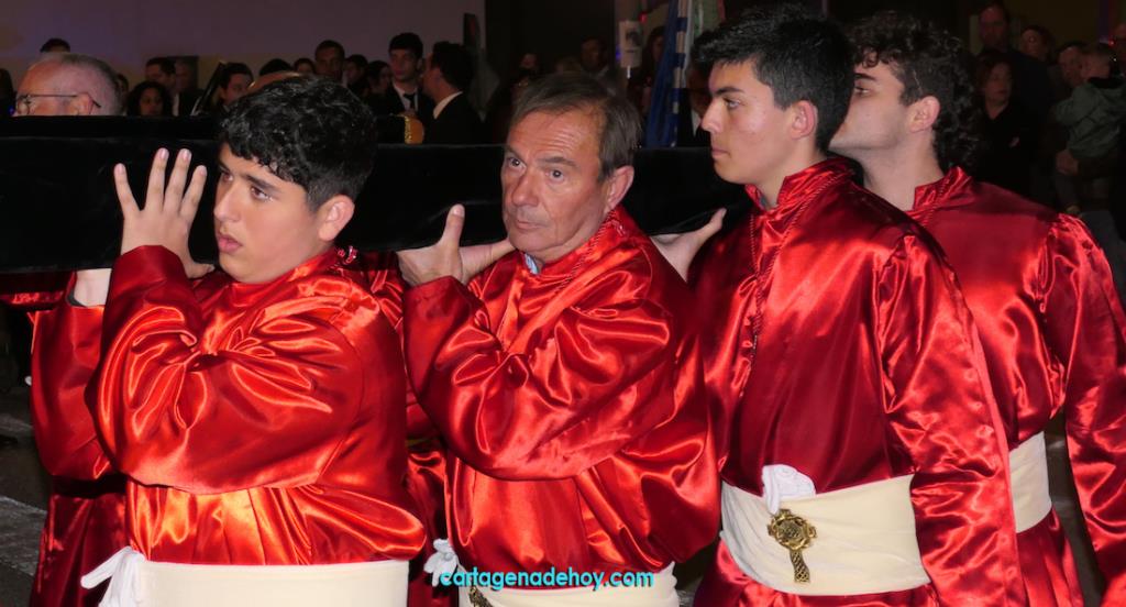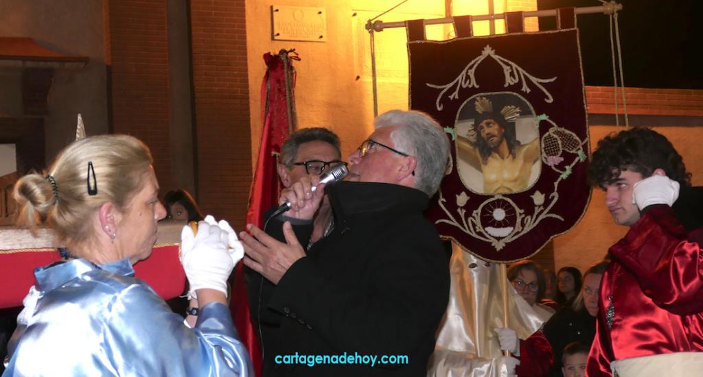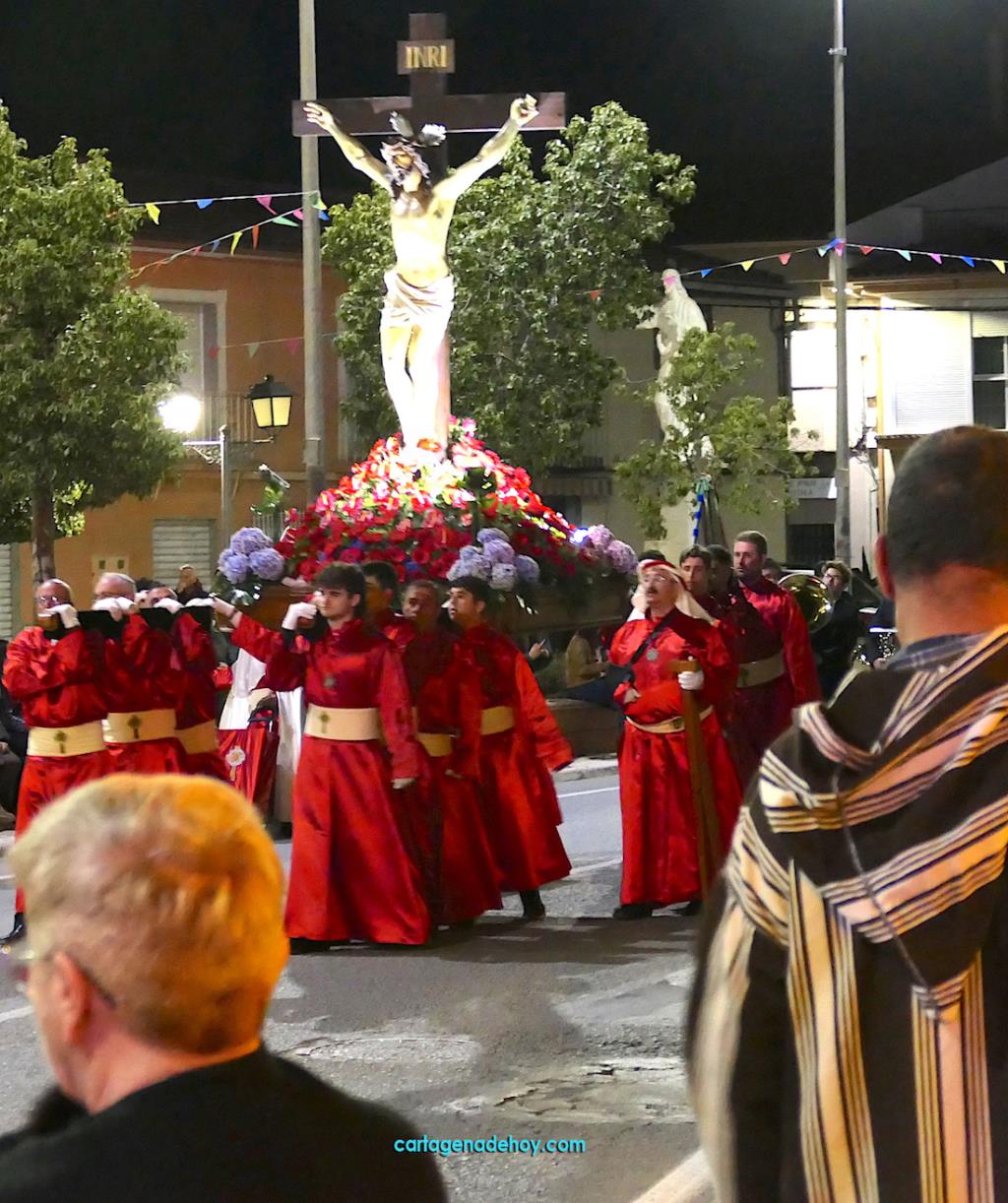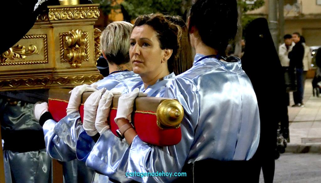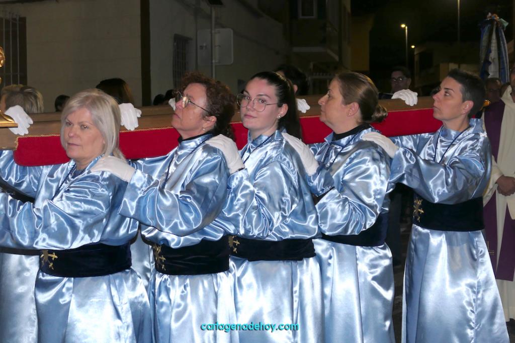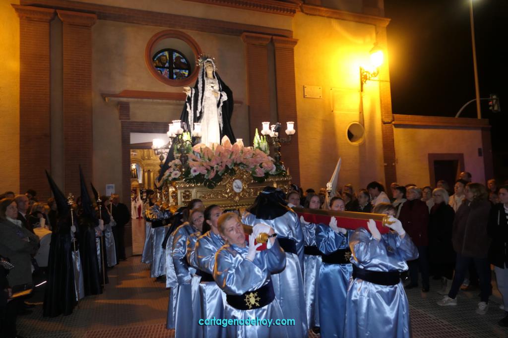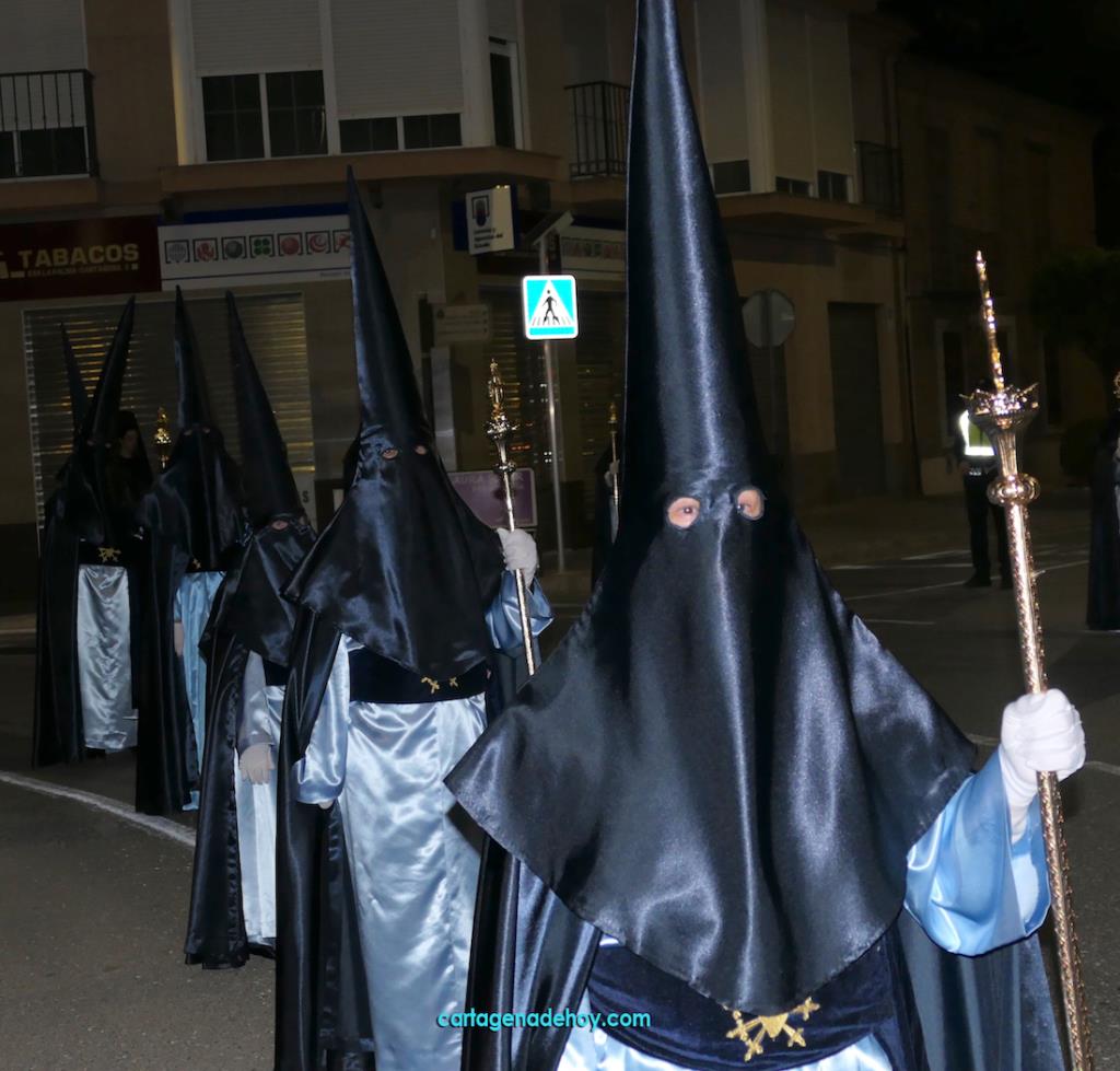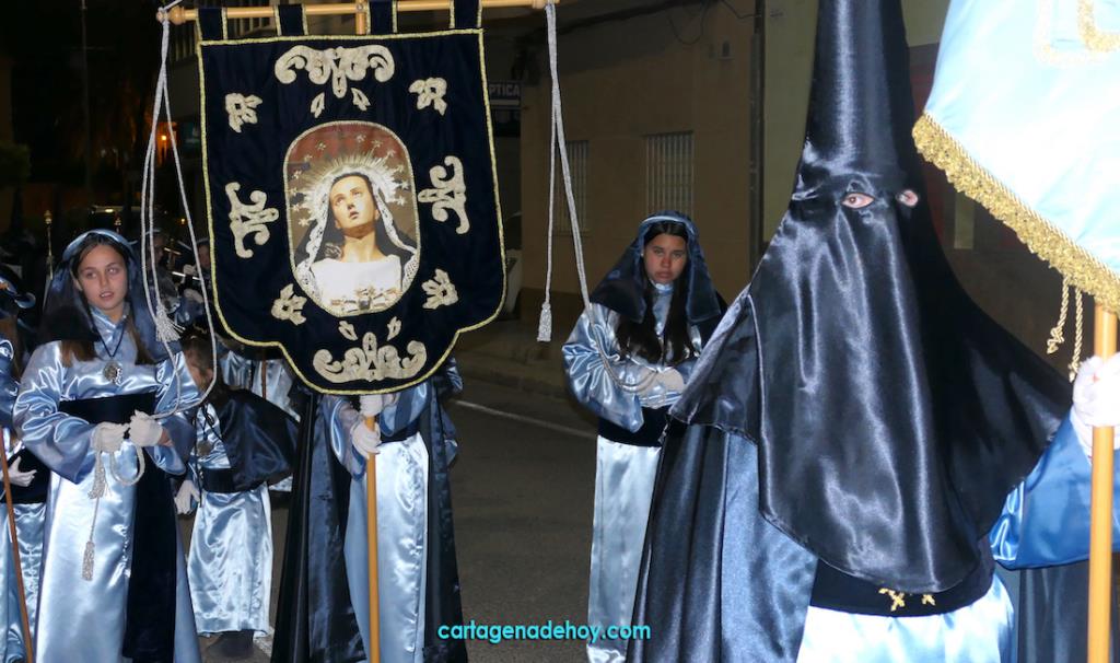 La Palma ofrece cada Semana Santa dos atractivas procesiones. Una es la muy singular que tiene lugar en la medianoche del Viernes Santo y que se adentra en el cementerio. La otra es la que cada Martes Santo se lleva a cabo con las tallas de Cristo Crucificado y de la Virgen de la Soledad, que culmina con el encuentro de ambos, que anoche tuvo lugar delante de la fachada de las más que tres veces centenario iglesia (otras veces se han encontrado los tronos en la curva), en un momento muy especial en el que fueron cantada dos saetas y en el que el párroco, Pedro García Casas, llevó a cabo una alocución-oración sobre el rencor y el valor de perdón. Después, reverencia del trono de la Virgen al de su hijo, que consiste en que las damas portapasos baja el primero mientras que los costaleros varones elevan el otro. Las dos tallas se recogen entrando de espaldas en la iglesia para 'mirar' al pueblo, sonando en este cruce de pórtico el himno de España, al que se suma la salve cartagenera en el caso de la Soledad. Una vez dentro, llegan hasta el altar mientras los penitentes que ha participado en la procesión le tributan numerosos aplausos.