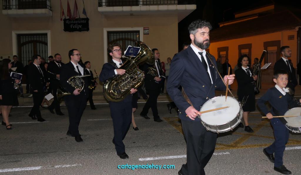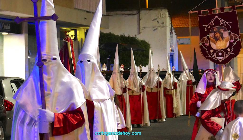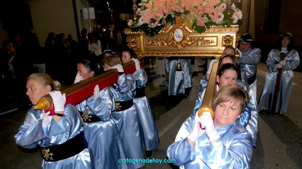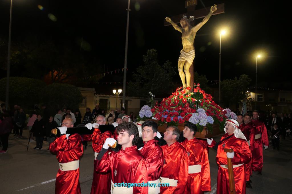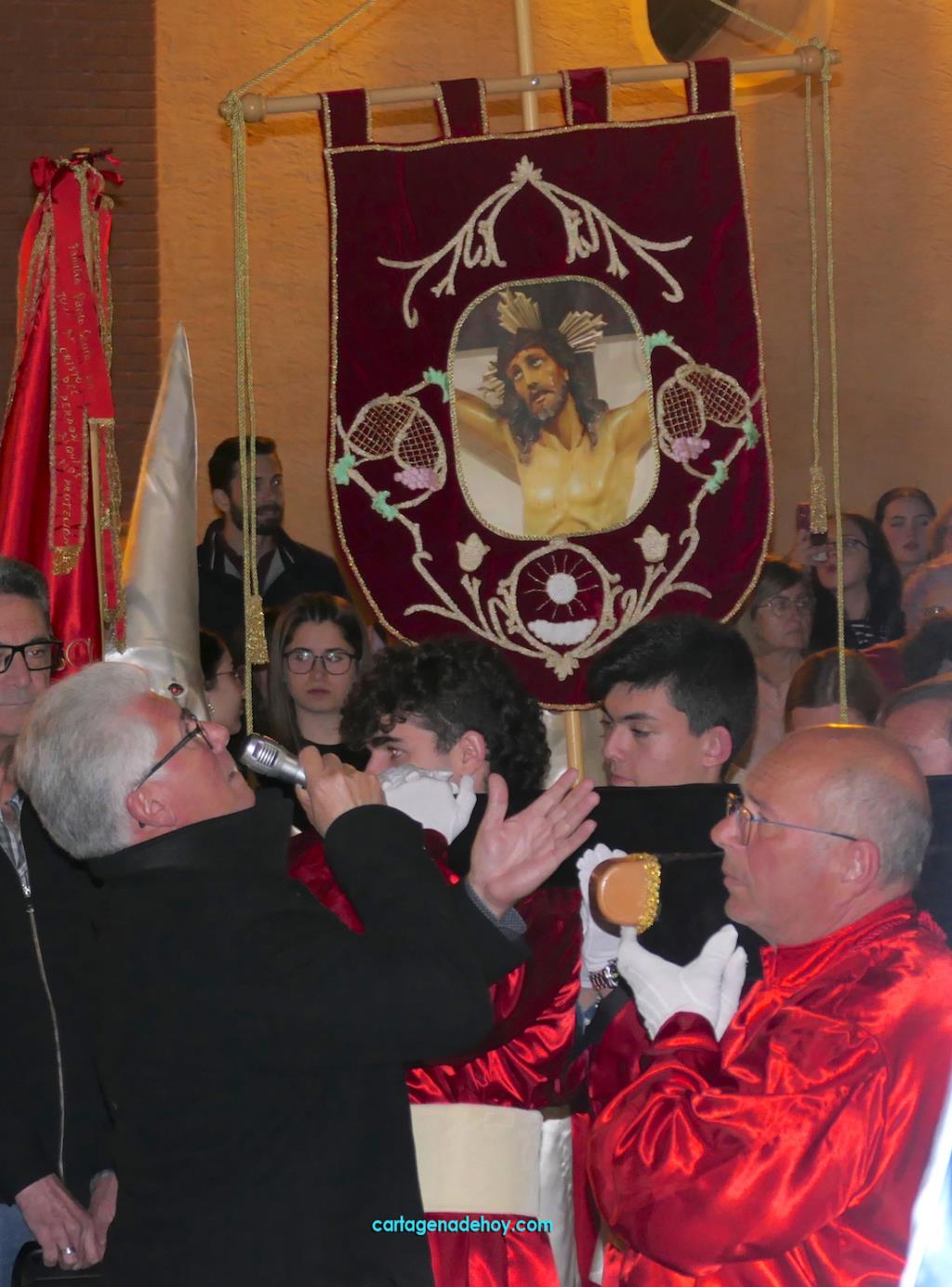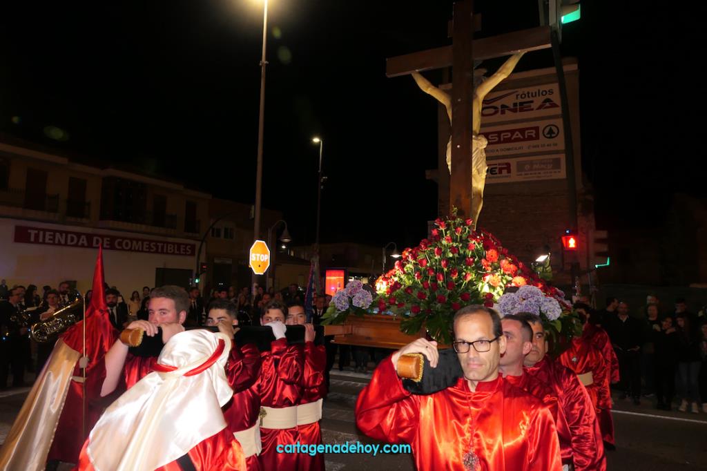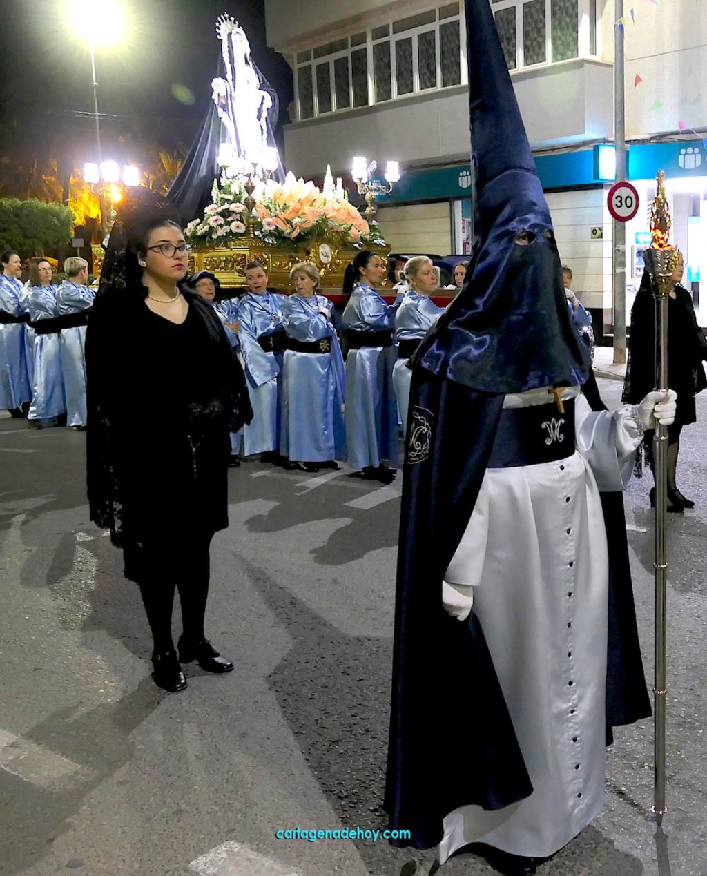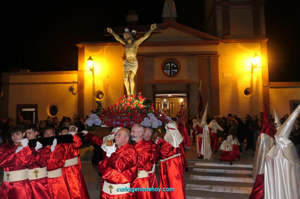 La Palma ofrece cada Semana Santa dos atractivas procesiones. Una es la muy singular que tiene lugar en la medianoche del Viernes Santo y que se adentra en el cementerio. La otra es la que cada Martes Santo se lleva a cabo con las tallas de Cristo Crucificado y de la Virgen de la Soledad, que culmina con el encuentro de ambos, que anoche tuvo lugar delante de la fachada de las más que tres veces centenario iglesia (otras veces se han encontrado los tronos en la curva), en un momento muy especial en el que fueron cantada dos saetas y en el que el párroco, Pedro García Casas, llevó a cabo una alocución-oración sobre el rencor y el valor de perdón. Después, reverencia del trono de la Virgen al de su hijo, que consiste en que las damas portapasos baja el primero mientras que los costaleros varones elevan el otro. Las dos tallas se recogen entrando de espaldas en la iglesia para 'mirar' al pueblo, sonando en este cruce de pórtico el himno de España, al que se suma la salve cartagenera en el caso de la Soledad. Una vez dentro, llegan hasta el altar mientras los penitentes que ha participado en la procesión le tributan numerosos aplausos.