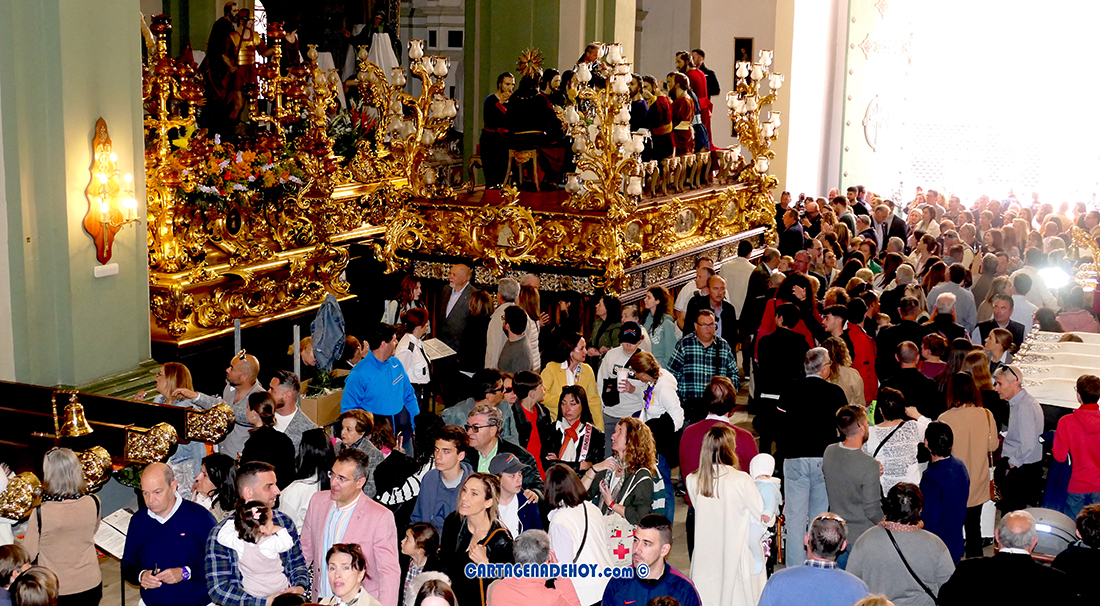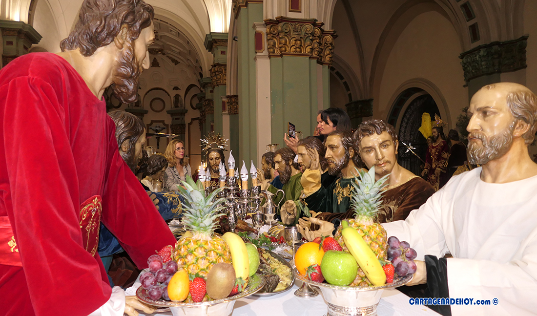 Un asado de cordero, dos de corvinas y trece de doradas son los platos principales que esta noche llevará sobre la mesa del trono de la Santa Cena californio. Reseñar que la vicealcaldesa de Cartagena, Ana Belén Castejón, como madrina de la Agrupación de la Santa Cena y Santísimo Cristo de los Mineros ha estado sobre el trono viendo los detalles del montaje.