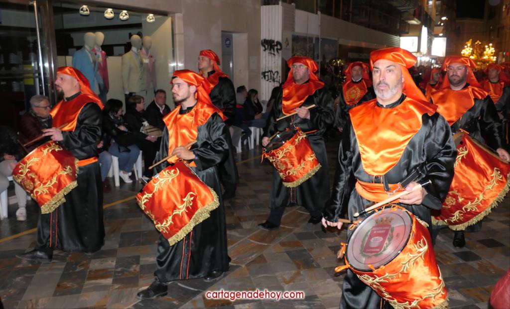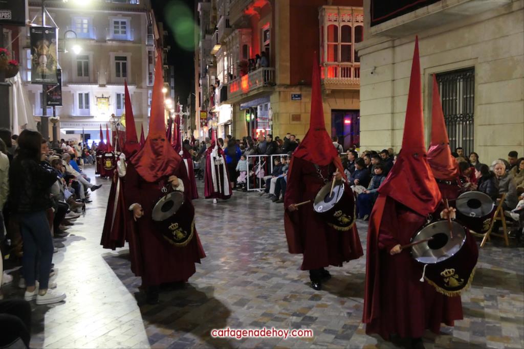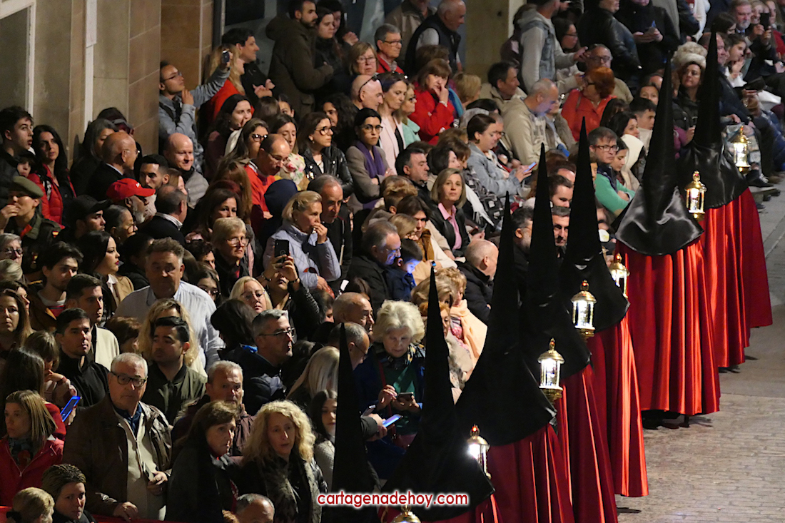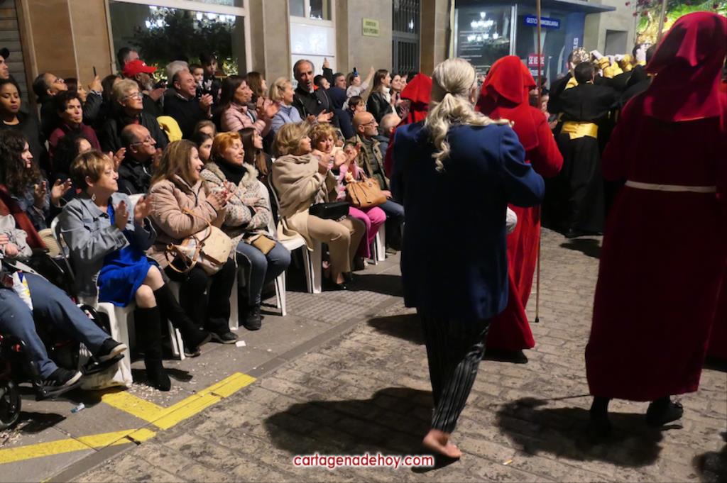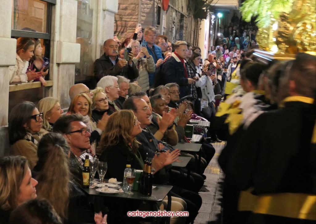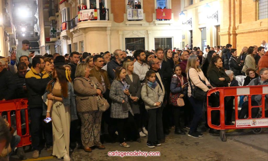 La noche coincidía con el 'clásico del fútbol español, un Barça-Real Madrid copero televisado en abierto, pero no se notó en cuanto a afluencia de público, que volvió a ser masiva. Seguro que hubo quien no fue a las procesiones por el balompié, pero apenas se notó. Hubo quienes compartía ambos con un pinganillo en la oreja o asomándose a televisores de bares y algunos establecimientos. Si goleada hubo (cuatro dianas) en el duelo copero, también goleada se dio en las calles de Cartagena.