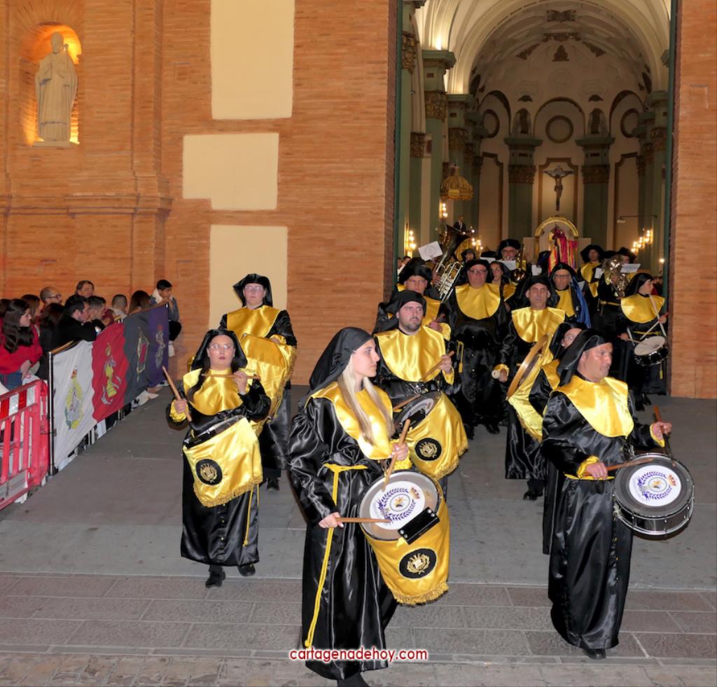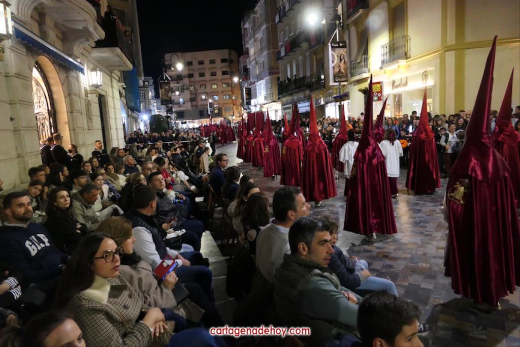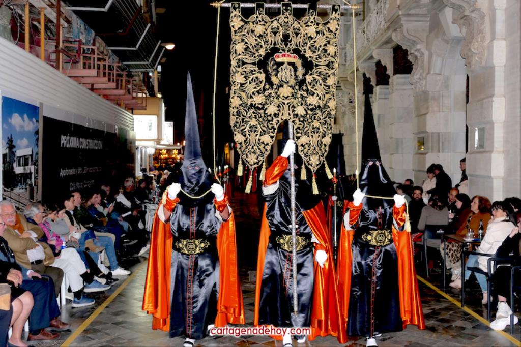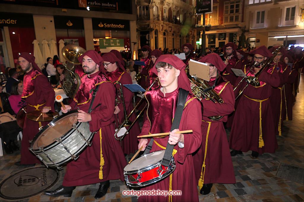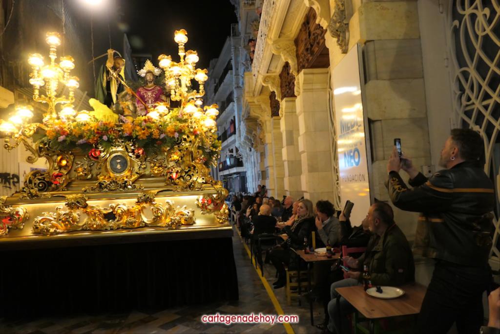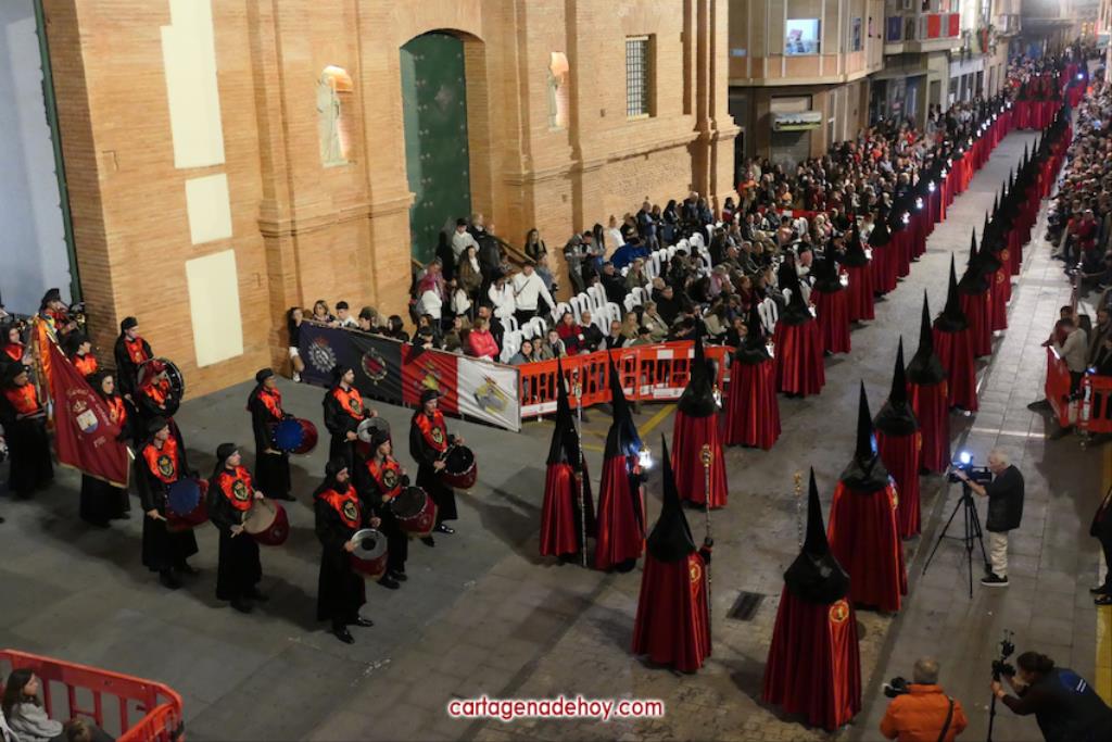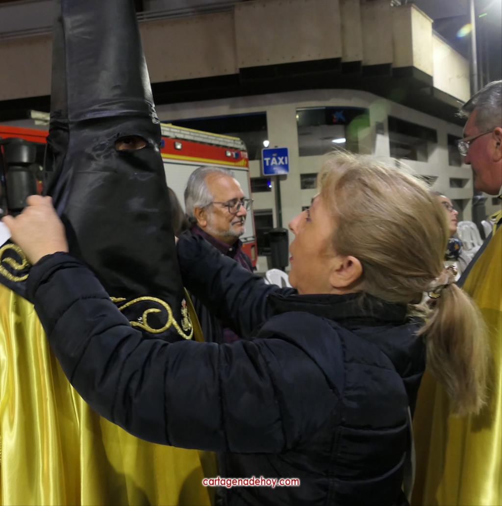 La noche coincidía con el 'clásico del fútbol español, un Barça-Real Madrid copero televisado en abierto, pero no se notó en cuanto a afluencia de público, que volvió a ser masiva. Seguro que hubo quien no fue a las procesiones por el balompié, pero apenas se notó. Hubo quienes compartía ambos con un pinganillo en la oreja o asomándose a televisores de bares y algunos establecimientos. Si goleada hubo (cuatro dianas) en el duelo copero, también goleada se dio en las calles de Cartagena.