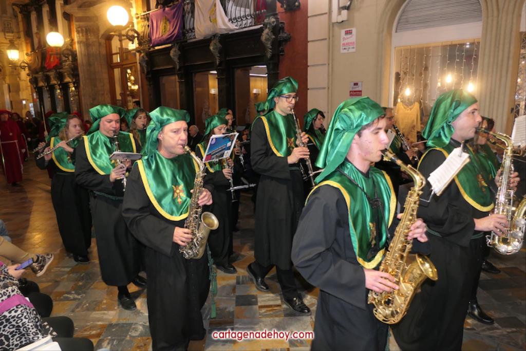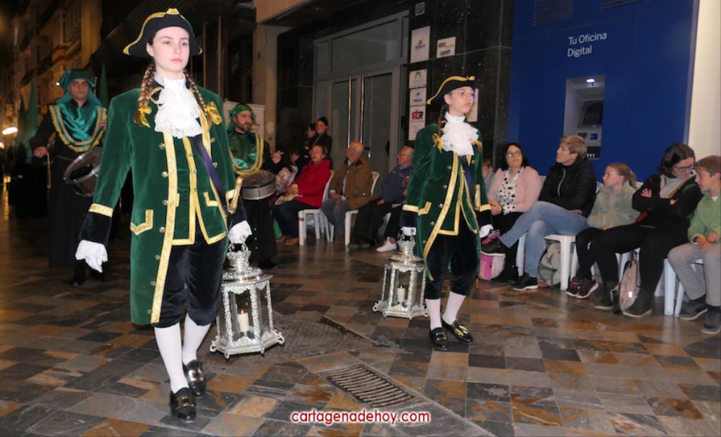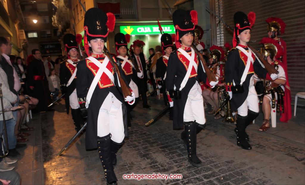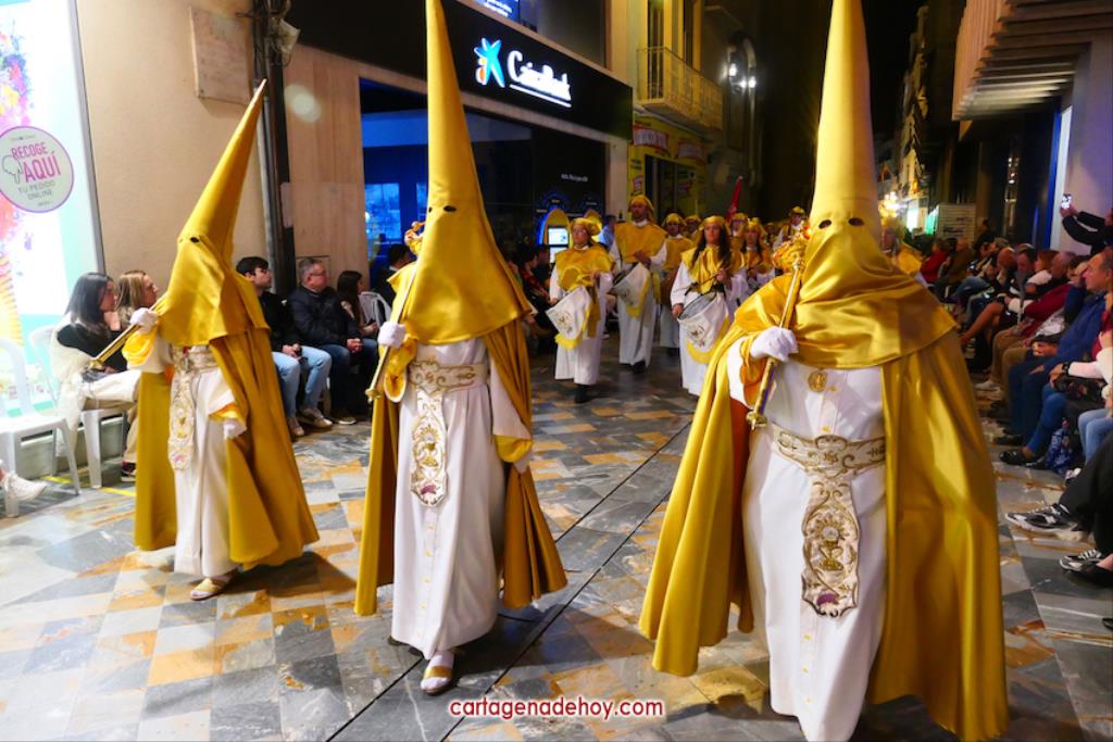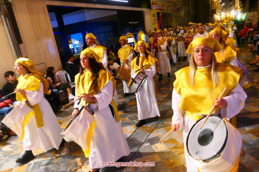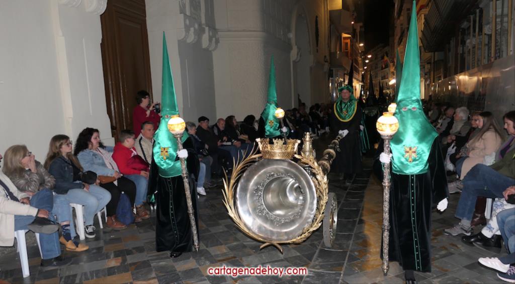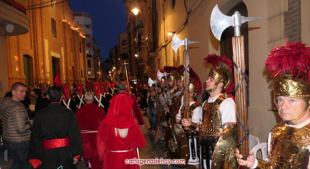 La noche coincidía con el 'clásico del fútbol español, un Barça-Real Madrid copero televisado en abierto, pero no se notó en cuanto a afluencia de público, que volvió a ser masiva. Seguro que hubo quien no fue a las procesiones por el balompié, pero apenas se notó. Hubo quienes compartía ambos con un pinganillo en la oreja o asomándose a televisores de bares y algunos establecimientos. Si goleada hubo (cuatro dianas) en el duelo copero, también goleada se dio en las calles de Cartagena.
