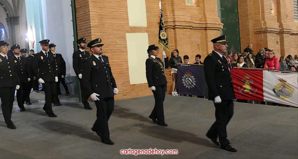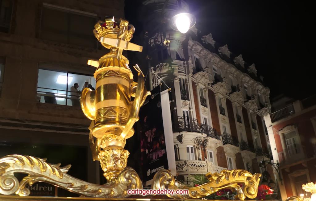 Detalles de la procesión hubo y muchos. La gran trompeta 'El castillo' de la Oración del Huerto, el trono más grande de la Semana Santa (Ósculo), la presencia de la Policía Nacional (incluido su comisario jefe de la Región de Murcia, Ignacio del Olmo) con la Sentencia, los invitados de excepción (la vicealcaldesa y el cronista Francisco José Franco, además de militares, entre otros), la cartela grabada en honor a 'Pepín' en la Flagelación, el gran manto de 24 metros cuadrados de la Virgen... A todo ello se suman el espectáculo de los portapasos (todos masculinos menos el grupo mixto de la Sentencia, cada vez con más hombros femeninos), los homenajes de cada trono a la patrona al pasar por delante de su basílica y que no bajan de su alto nivel el orden al avanzar de los penitentes y la belleza de adornos florales, iluminación y tallas. Derroche californio bajo la luna casi llena.