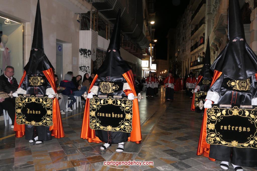 A traves de las imágenes que portaban se iba 'leyendo' el relato de que, después de la última cena, Jesús fue a orar al huerto de los olivos, donde Judas, con un ósculo, lo señaló, siendo prendido por dos sayones, siendo juzgado en el sanedrín, donde al salir cruzó su mirada con el arrepentido San Pedro (por sus tres negaciones). Fue flagelado y le pusieron una corona de espinas, para finalmente salir la sentencia: culpable. Morirá en la cruz. Esta narración ocupó las dos primeras horas de salidas desde Santa María, quedando la tercera para los apóstoles y sus largos tercios, cerrando la 'madre de los californios' sobre la medianoche. En ese momento, la cabeza de la procesión ya asomaba por el final de la calle Jara y comenzaba una recogida que cruzó las tres de la madrugada, con una emotiva sale a la Virgen del Primer Dolor.