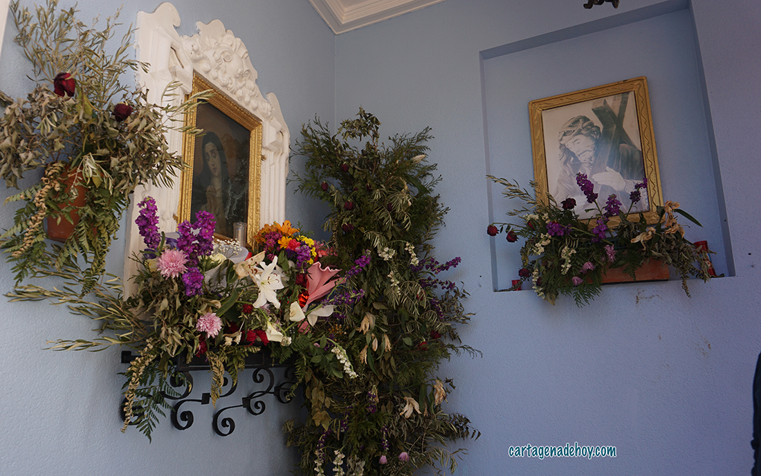 Además del cuadro de la Virgen, obra del pintor Francisco Portela, este rincón de la Soledad, de embrujo amarillento nocturno, luce otro de Jesús Nazareno. Ambas imágenes lucen estos días rodeadas de flores.
