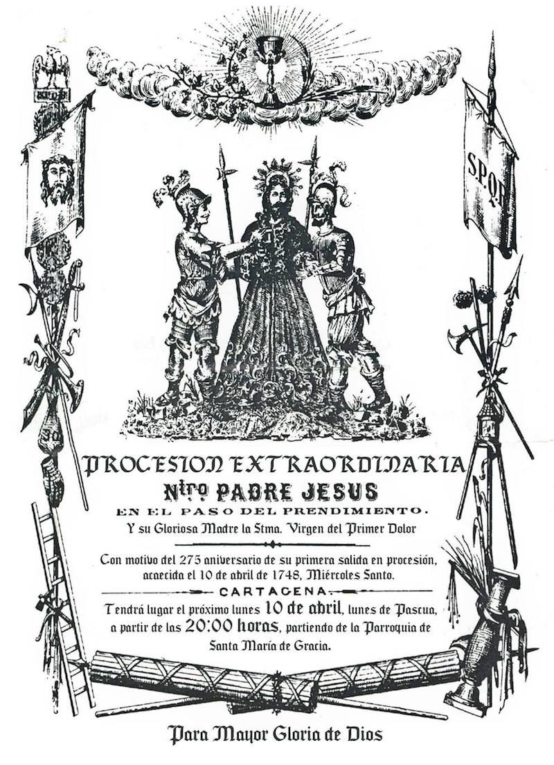 La Cofradía de Cristo en el Paso del Prendimiento de Cartagena se fundó en junio de 1747 y fue un 10 de abril de 1748 cuando celebró su primera salida en procesión, hace hoy, exactamente, 275 años, motivo que ha llevado a los cofrades encarnados a organizar la procesión extraordinaria de esta noche, tratando de ser similar a la que fue su estreno.