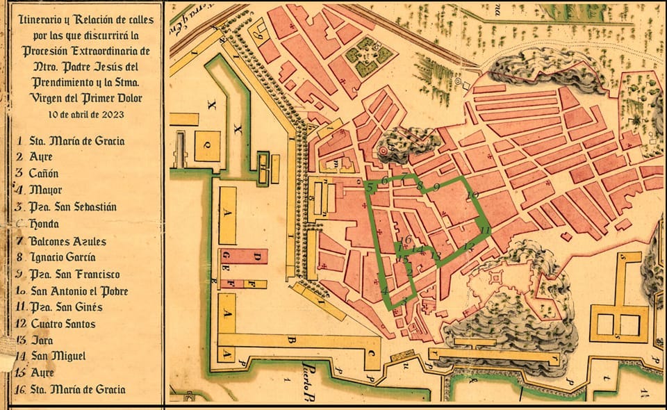 La Cofradía California celebrará esta tarde-noche el 275 aniversario de lo que fue su primera procesión con cortejo similar, en el que irán el Cristo del Prendimiento como Ecce Homo y la Virgen del Primer Dolor, que sobre las peanas que se ob servan en la fotografía superior recorrerá la parte más antigua de la ciudad, volviendo a pasar por calles como Cuatro Santos, que hace décadas que dejó de usarse para los desfiles.