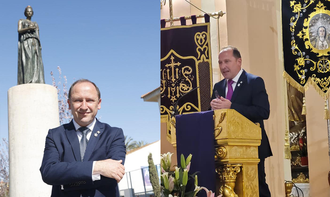 El artista de Santa Lucia participa durante la mañana en el descubrimiento de la musa griega del teatro, Melpómene que ha creado para el Parque Almansa de San Javier y por la noche anunció la Semana Santa en Beniaján.