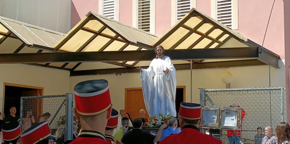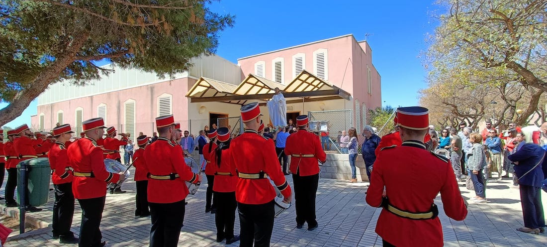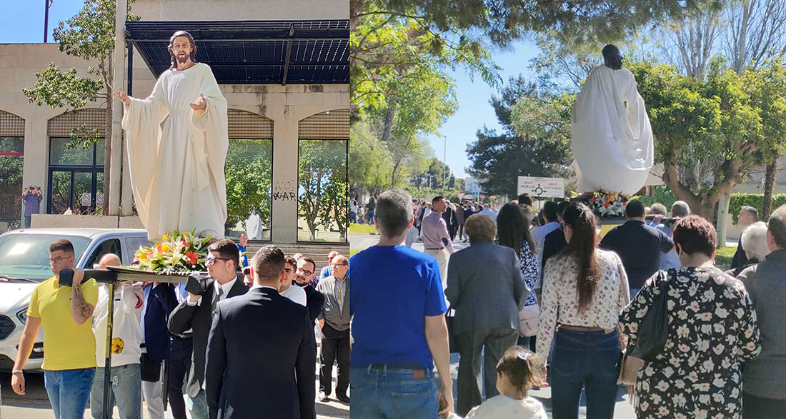 Hace 18 años tuvo lugar la primera edición del regreso de la talla central del grupo escultórico de Luis González Rey a la iglesia donde se le rinde culto fuera de Semana Santa. Dos años pandémicos (2020 y 2021) no se celebró y fue en 2022 cuando se recuperó, entonces, todavía como limitaciones sanitarias. Este año, ya con plena presencialidad, el regreso ha contado con todos los requisitos deseados de antemano, como día soleado, jornada primaveral y un estupendo acompañamiento popular a la imagen ('caminó' a hombros sobre andas) entre las antiguas galerías comerciales y la iglesia del Polígono Santa Ana, siendo la banda musical del ‘Maestro Esteban’ abría paso con su sonido dentro de una comitiva en la que iban la presidenta de la agrupación, Manoli Borrego, con su junta de mesa, y, entre otros, el hermano mayor de la Cofradía California, Juan Carlos de la Cerra. Al llegar a la parroquia, el sacerdote Cletus Padinjarenedumparambil Joseph ofició la tradicional eucaristía de campaña, con el alivio de la sombra de los pinos ubicados junto al inmueble eclesiástico.