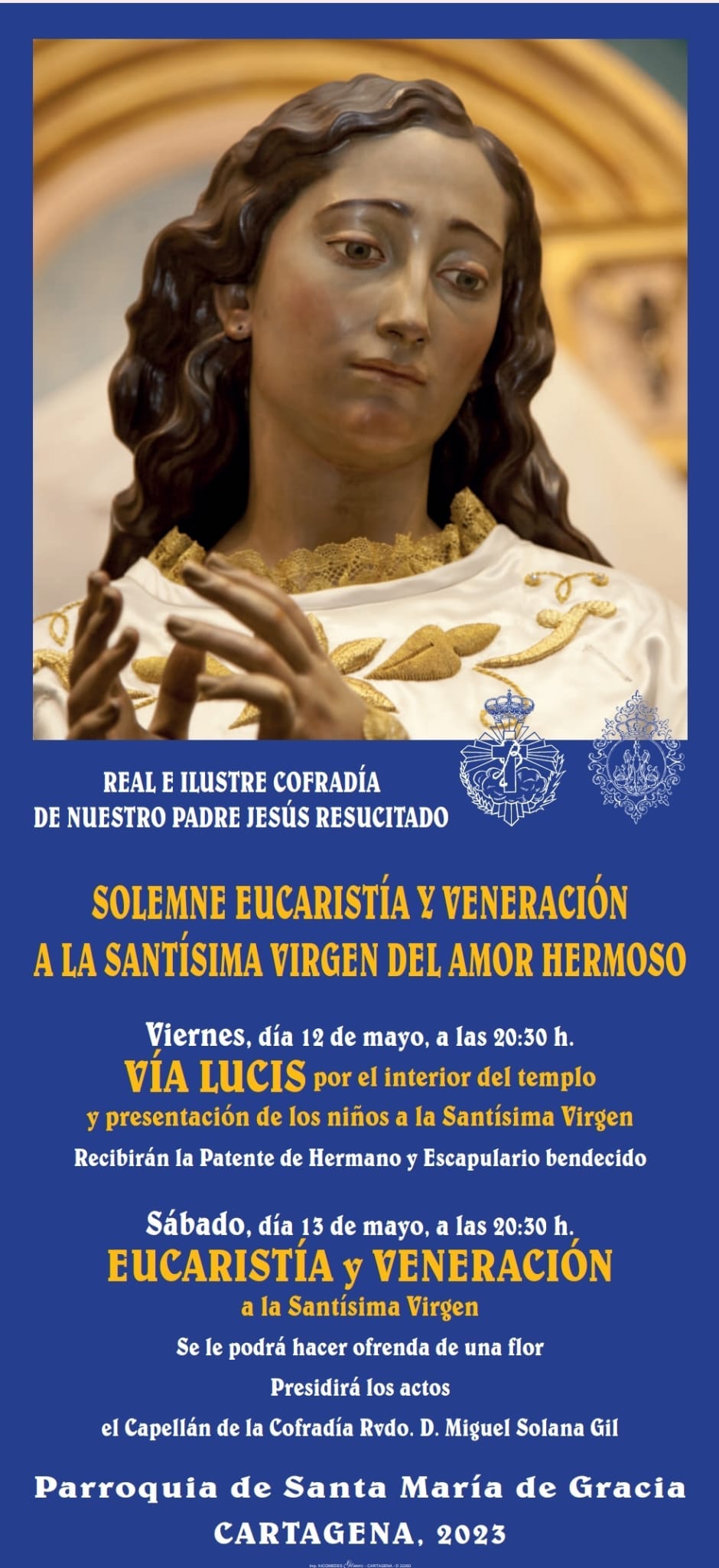 El sábado, 13 de mayo, a las 20:30 horas, se realizará la solemne Eucaristía y veneración a la Santísima Virgen del Amor Hermoso, presidida por el capellán de la Cofradía del Resucitado, Miguel Solana Gil. Se invita a todos los asistentes a entregar una flor a la Virgen.