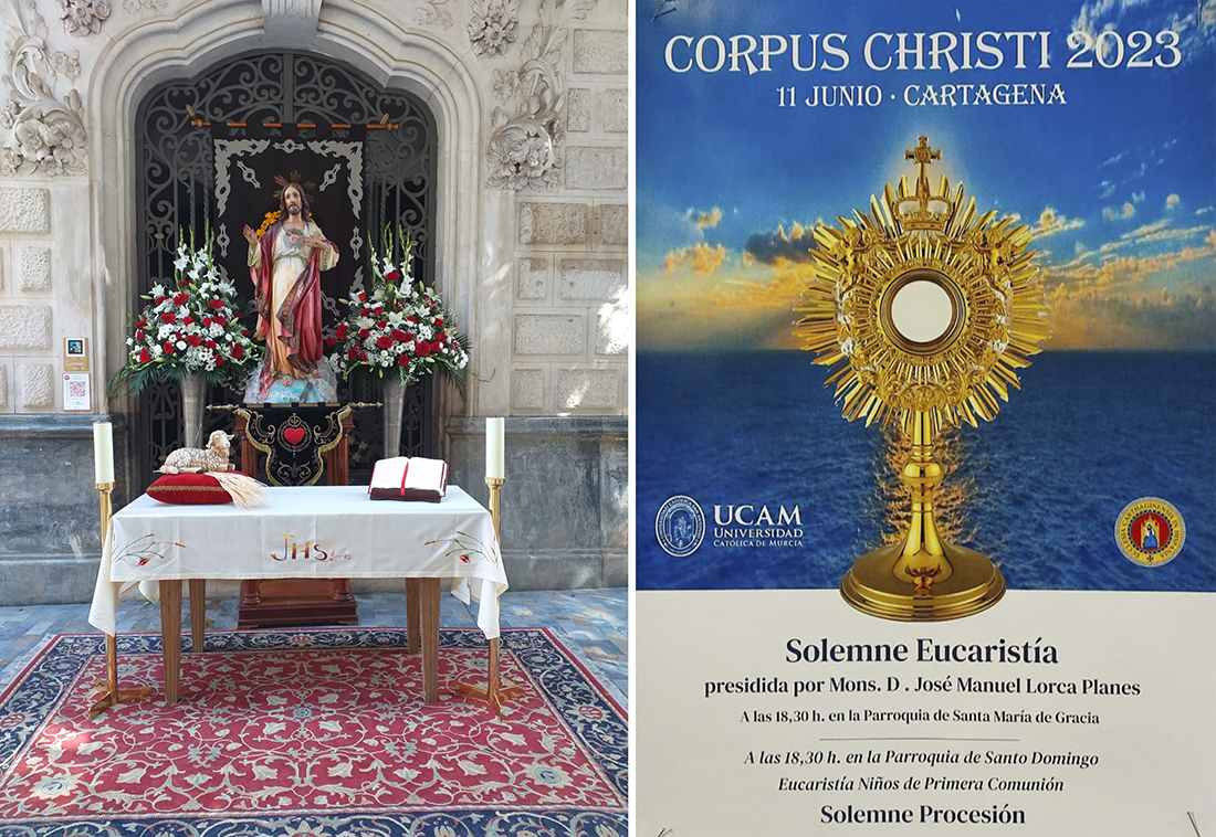 Hoy es la festividad del 'Cuerpo de Cristo' y el casco histórico de Cartagena se engalana para la ocasión con diversos altares, montados principalmente por las hermandades profesiones, como es el que se observa del Cristo del Socorro ante la puerta del edificio modernista del antiguo Banco Hispanoaméricano. Además, los jóvenes de las cuatro cofradías elaborarán un gran tapiz de sal. Las misas tendrán lugar en Santa María y Santo Domingo, para a la conclusión, sobre las siete y media de la tarde, comenzar el desfile con los niños de la Primera Comunión.