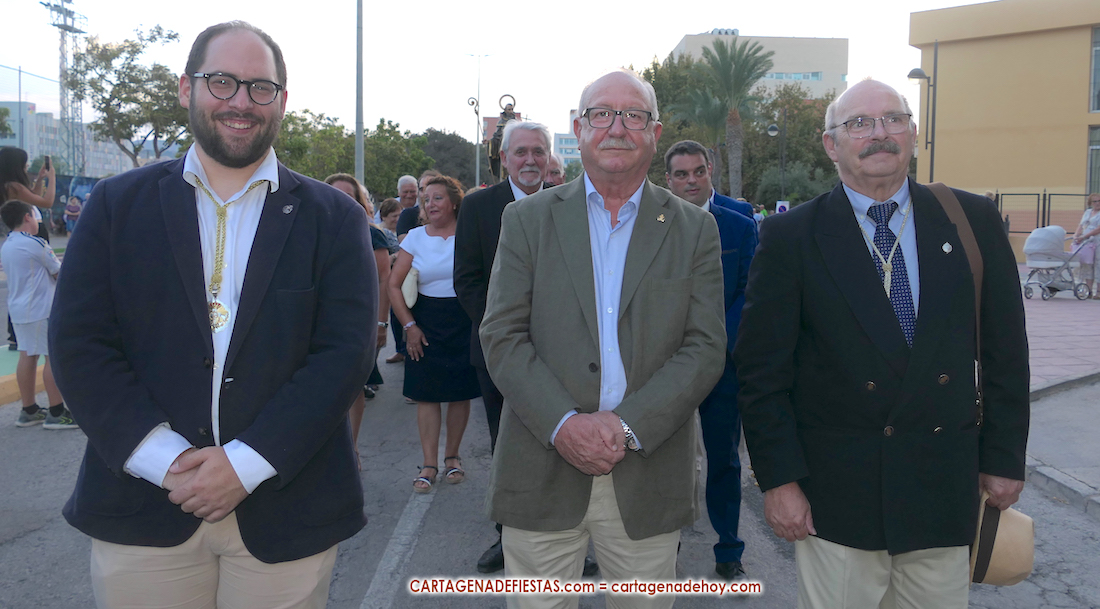En la fotografía posan con sus esposas, Loli Castillo y Toñi Bernal. También pudiera ser el primer acto oficial externo (sin incluir la visita a la alcaldesa) del hermano mayor de la Cofradía del Cristo del Socorro, Javier Pavía Galán, quien fue elegido en junio, pero no hemos confirmado este extremo. En la imagen inferior se observa al primer mayordomo de la Cofradía del Resucitado, Pedro A. Giménez; y a los hermanos mayores Ayala y Pavía, durante la procesión.