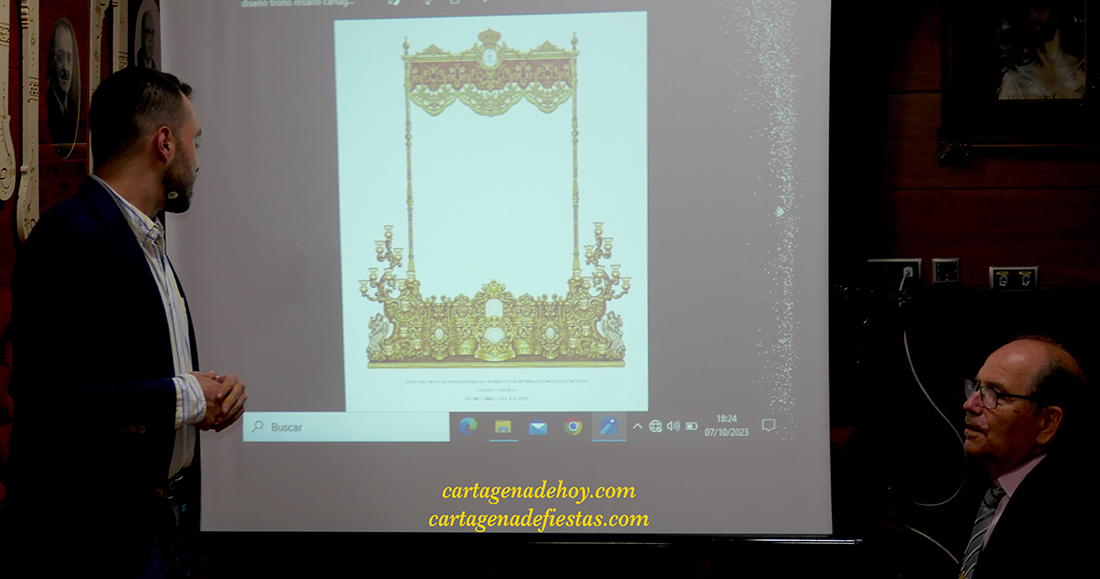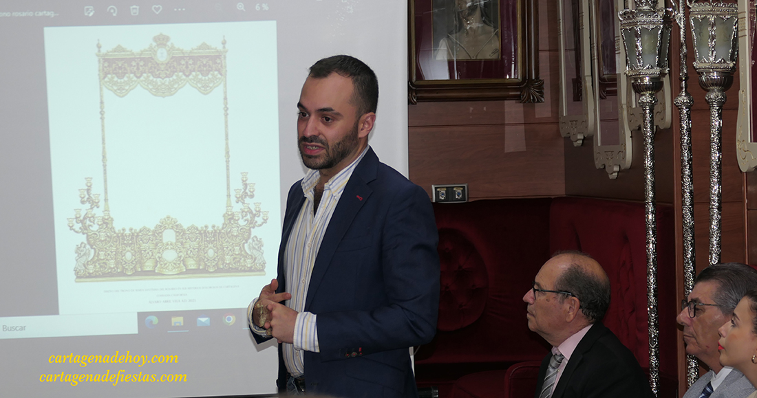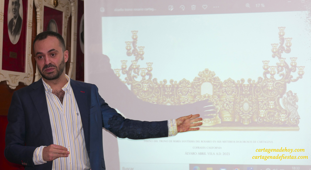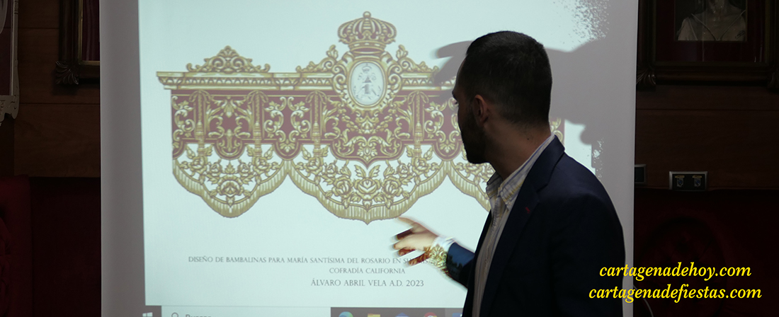 El granadino Álvaro Abril presentó en la sala capitular de la Cofradía Cartagena los bocetos que deben ir materializándose en varios años y que dotará a la base procesional de la Virgen de ‘esencia cartagenera’, siendo un tributo a Rafael de Eleuterio pero sin perder el aire sevillano del actual, único encarnado de la Semana Santa de Cartagena que sale con palio.
