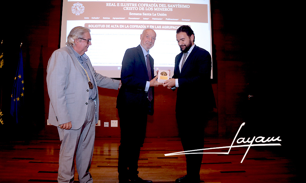El cartagenero y procesionista de la agrupación california de Soldados Romanos ha sido el diseñador del primer portal en internet de las procesiones mineras. En la foto se le observa con el hermano mayor, José Cortado, y el alcalde unionense, Joaquín Zapata, recibiendo la medalla de honor por el buen trabajo llevado a cabo.