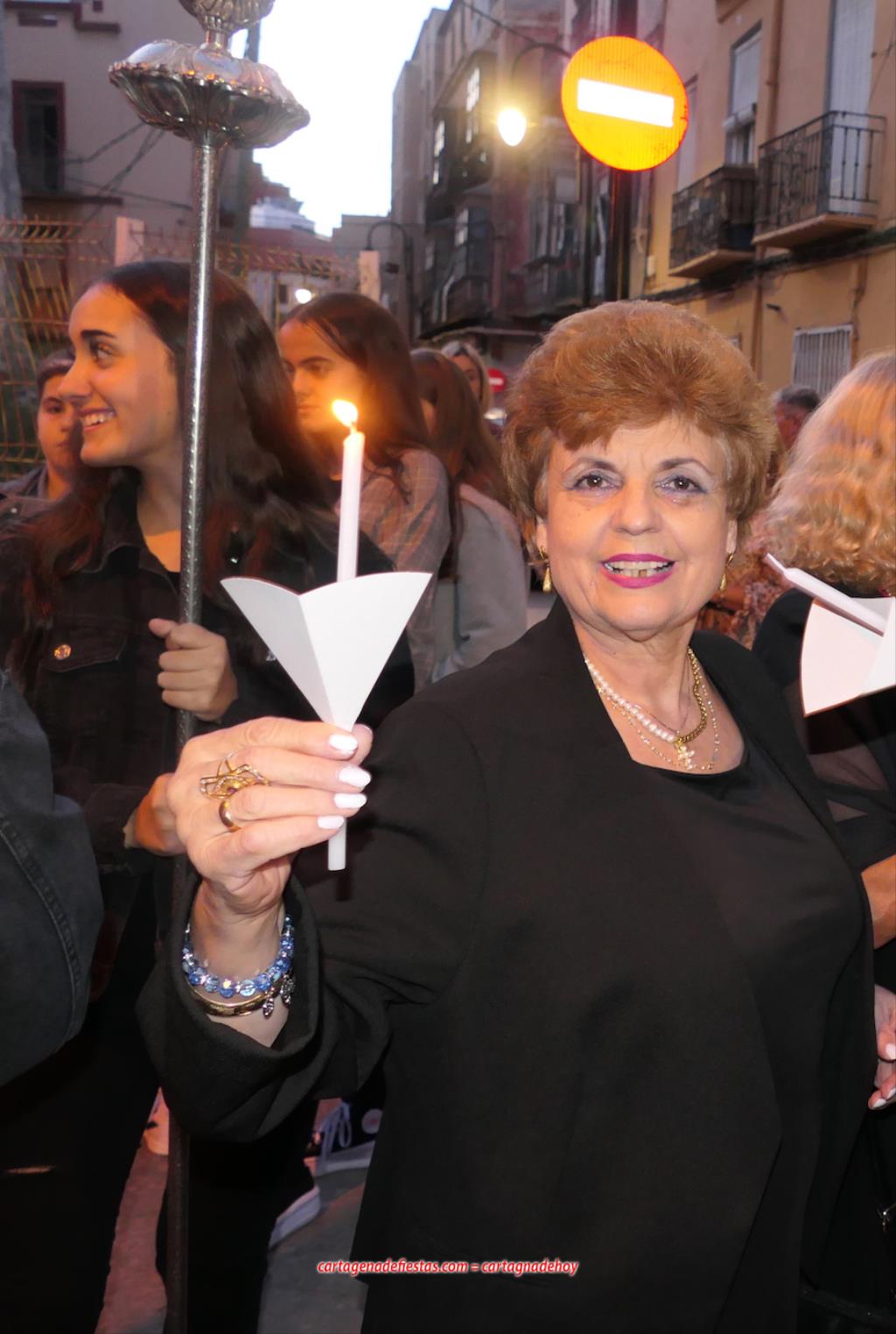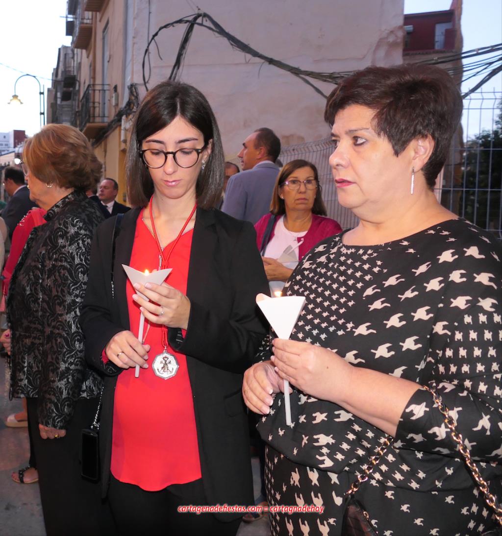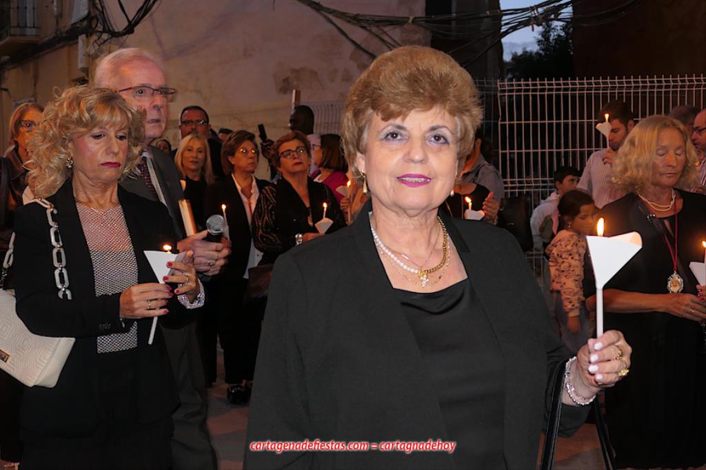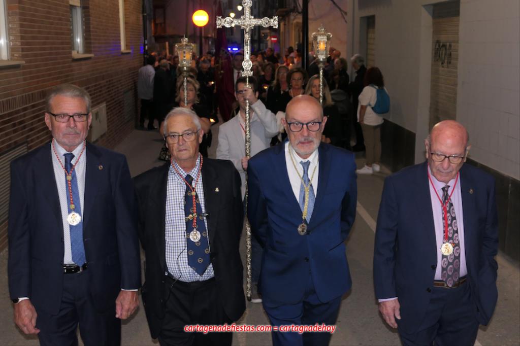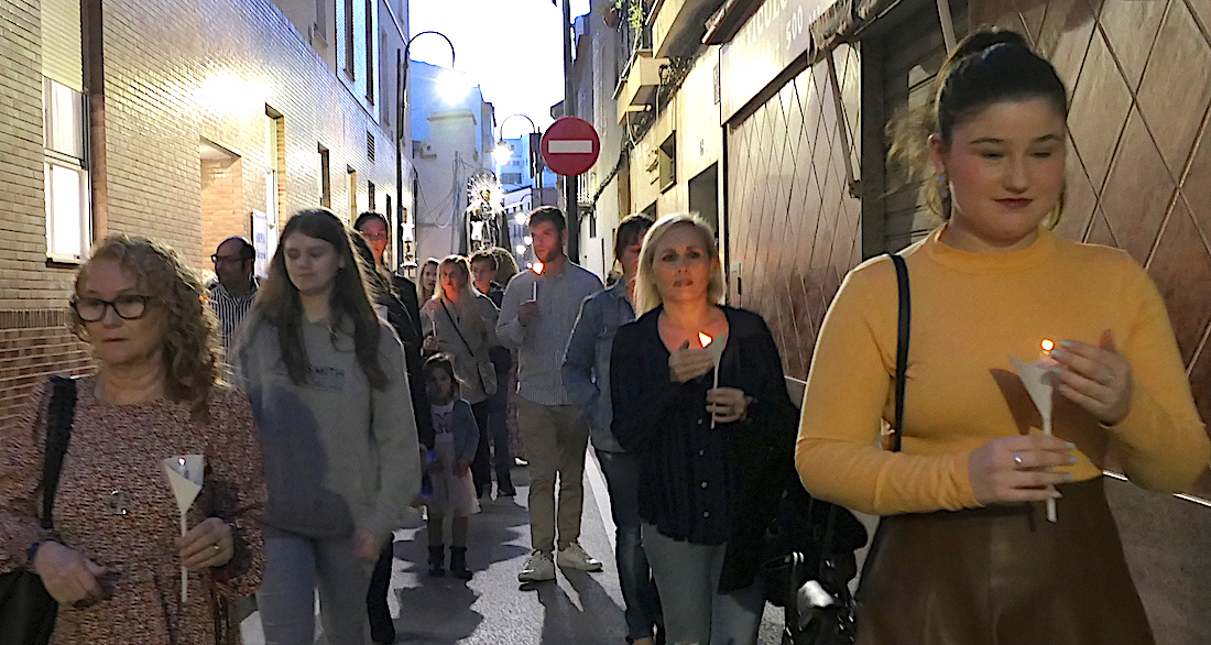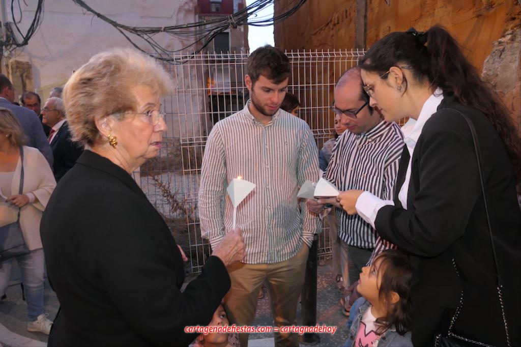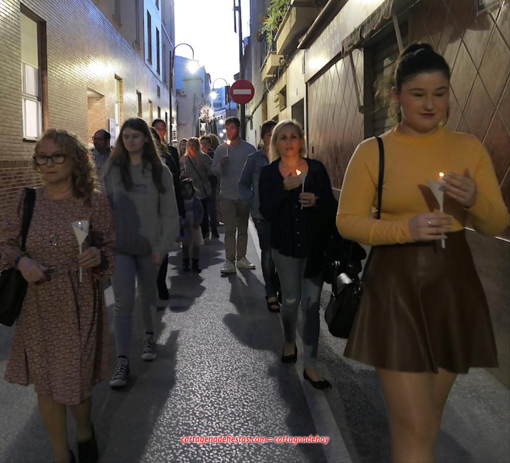 La comitiva, en la que marchaba el hermano mayor de la Cofradía California, Pedro Ayala, en el día de su cumpleaños, se caracteriza por el alumbrado de velas. Antes de empezar, el capellán californio, Francisco de Asís Pagán Jiménez, antes de salir informó que los rezos de las diferentes paradas corresponderían a los 'Misterios gozosos'.