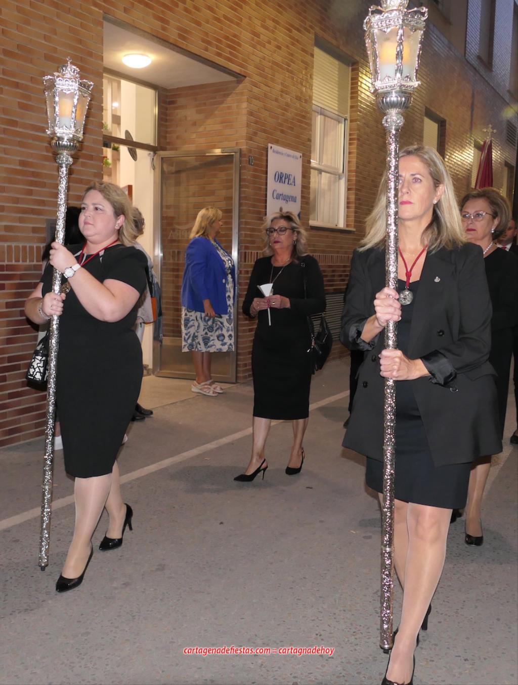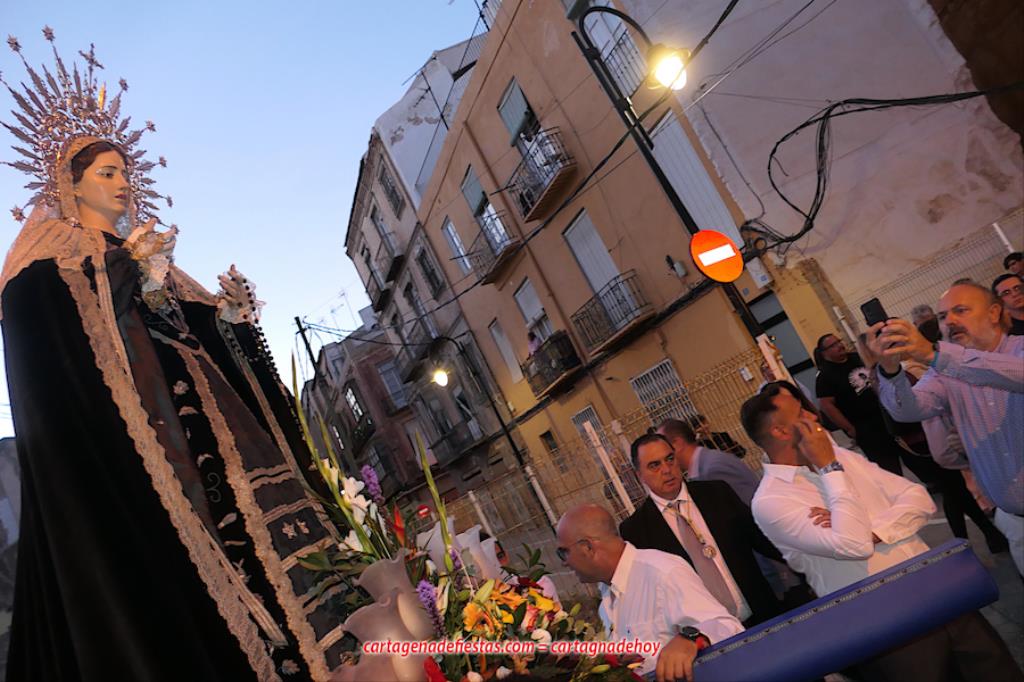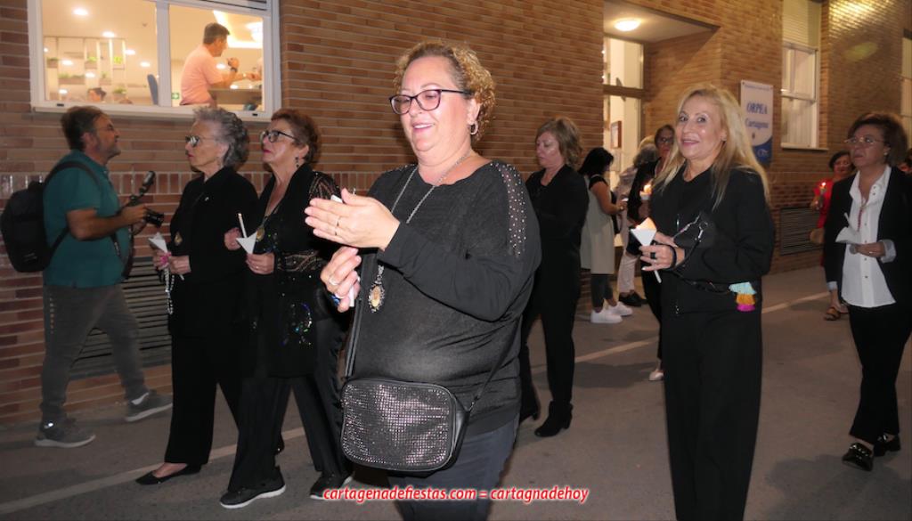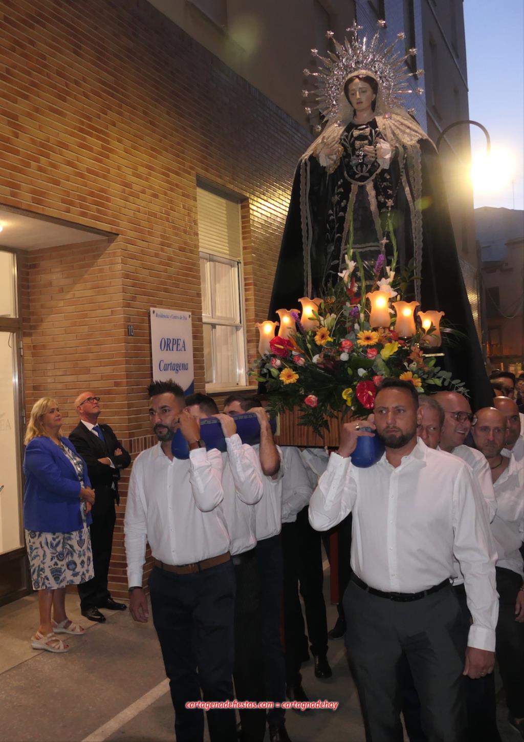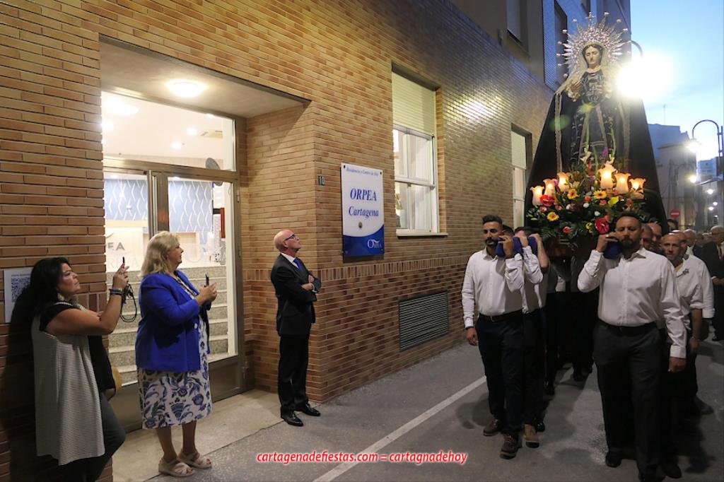 La imagen titular de la agrupación california de María Santísima del Rosario en sus Misterios Dolorosos, como viene haciendo desde 1980, volvió a recorrer las calles del centro histórico de Cartagena fuera de la Semana Santa coincidiendo con el mes de su celebración. La novedad estuvo en la estancia previa de un día en la residencia de mayores y centro de día Orpea, desde donde tomó la salida, a diferencia de los años anteriores en que partía desde la iglesia de Santa María. La iniciativa se ha llevado a cabo para acercar a la Virgen a colectivos cartageneros y la experiencia ha sido muy positiva.