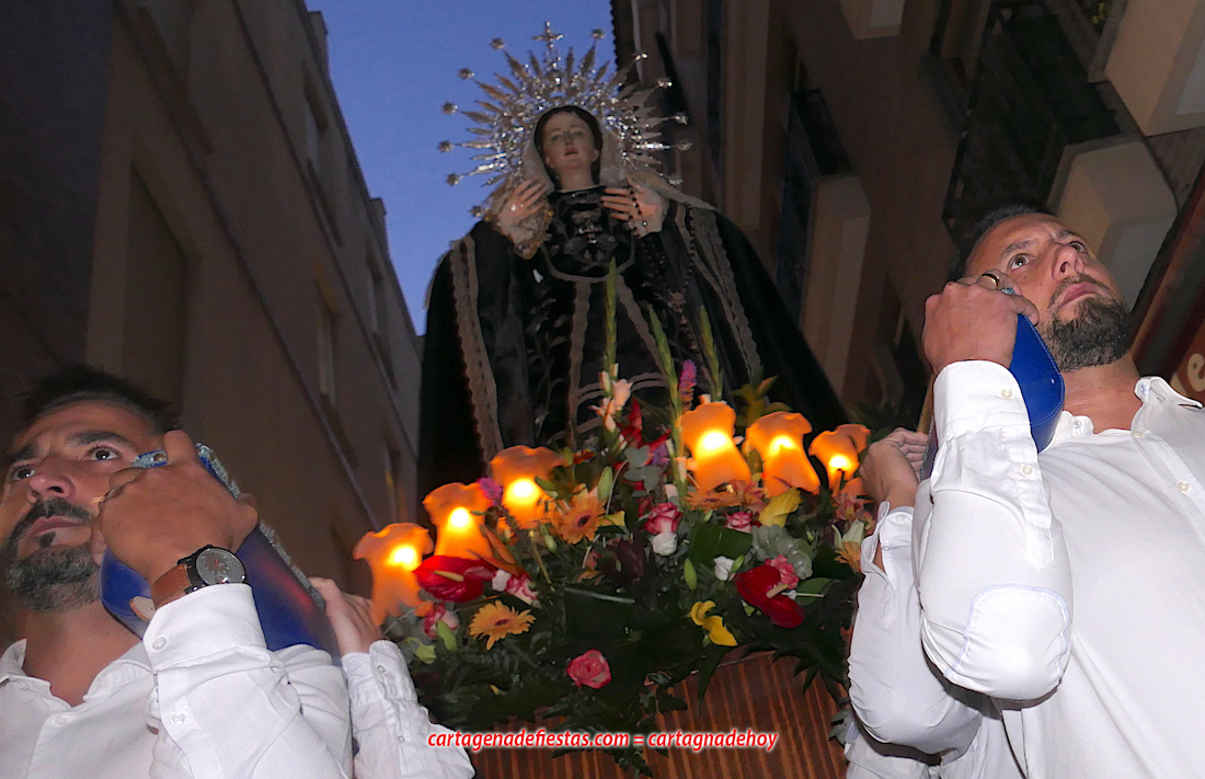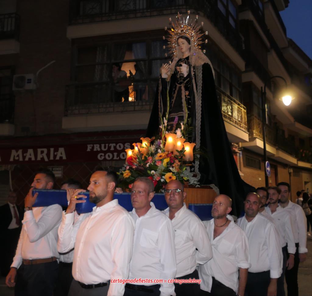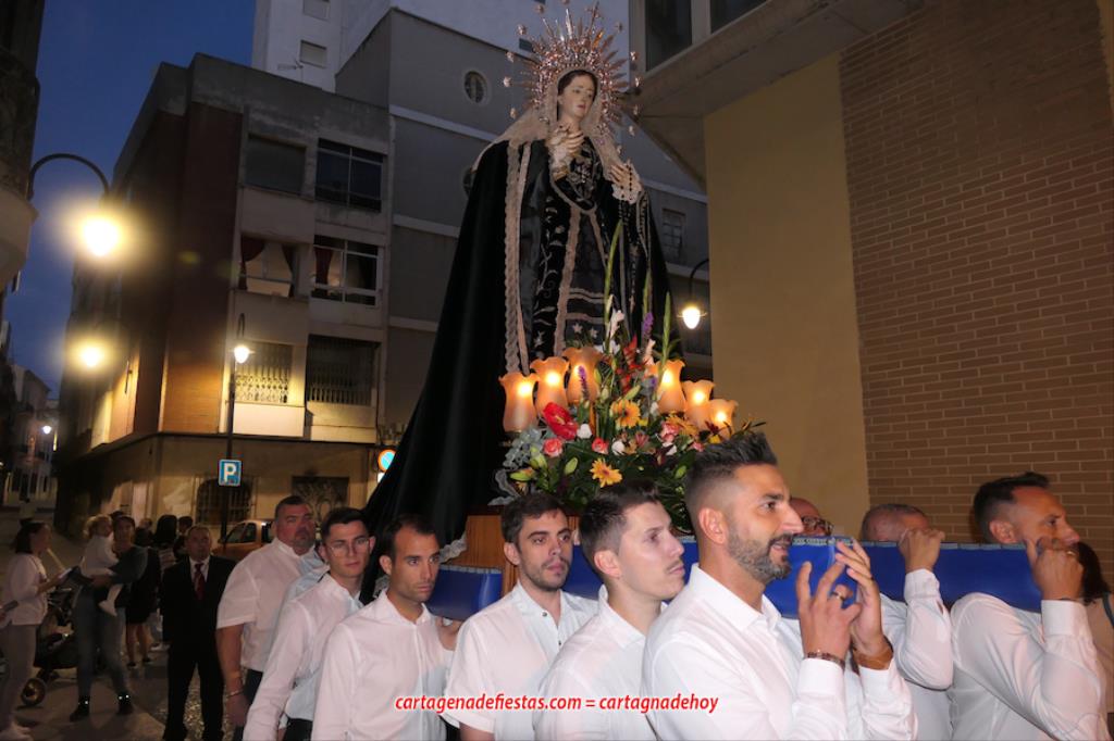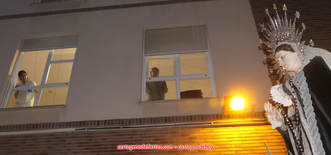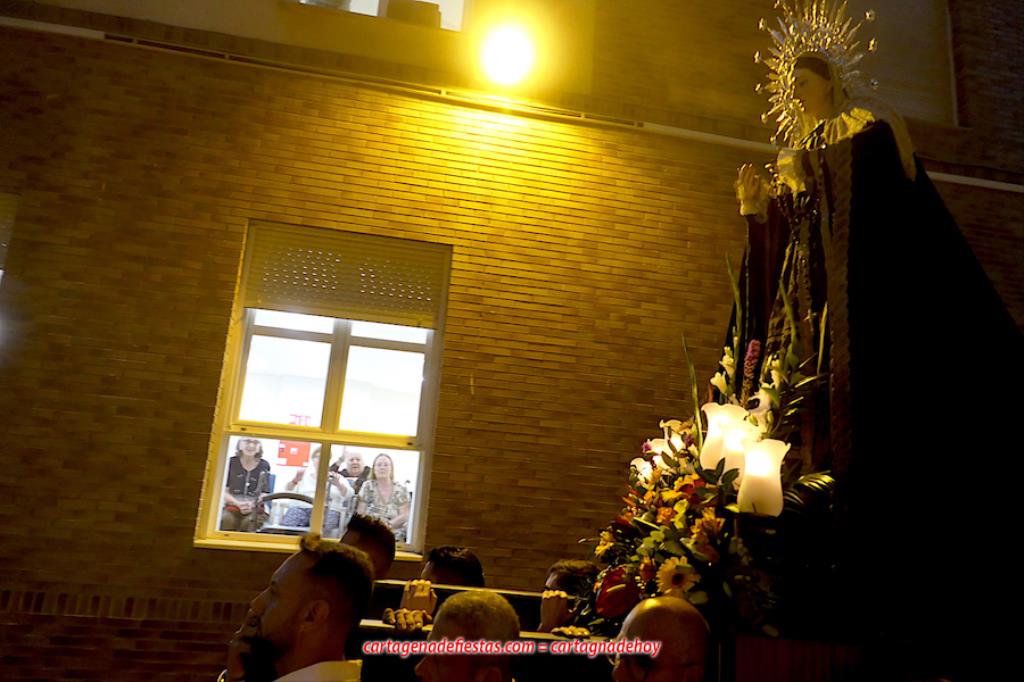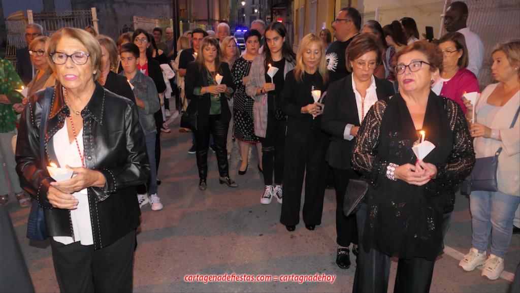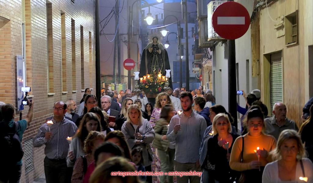 La imagen titular de la agrupación california de María Santísima del Rosario en sus Misterios Dolorosos, como viene haciendo desde 1980, volvió a recorrer las calles del centro histórico de Cartagena fuera de la Semana Santa coincidiendo con el mes de su celebración. La novedad estuvo en la estancia previa de un día en la residencia de mayores y centro de día Orpea, desde donde tomó la salida, a diferencia de los años anteriores en que partía desde la iglesia de Santa María. La iniciativa se ha llevado a cabo para acercar a la Virgen a colectivos cartageneros y la experiencia ha sido muy positiva.