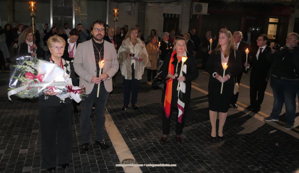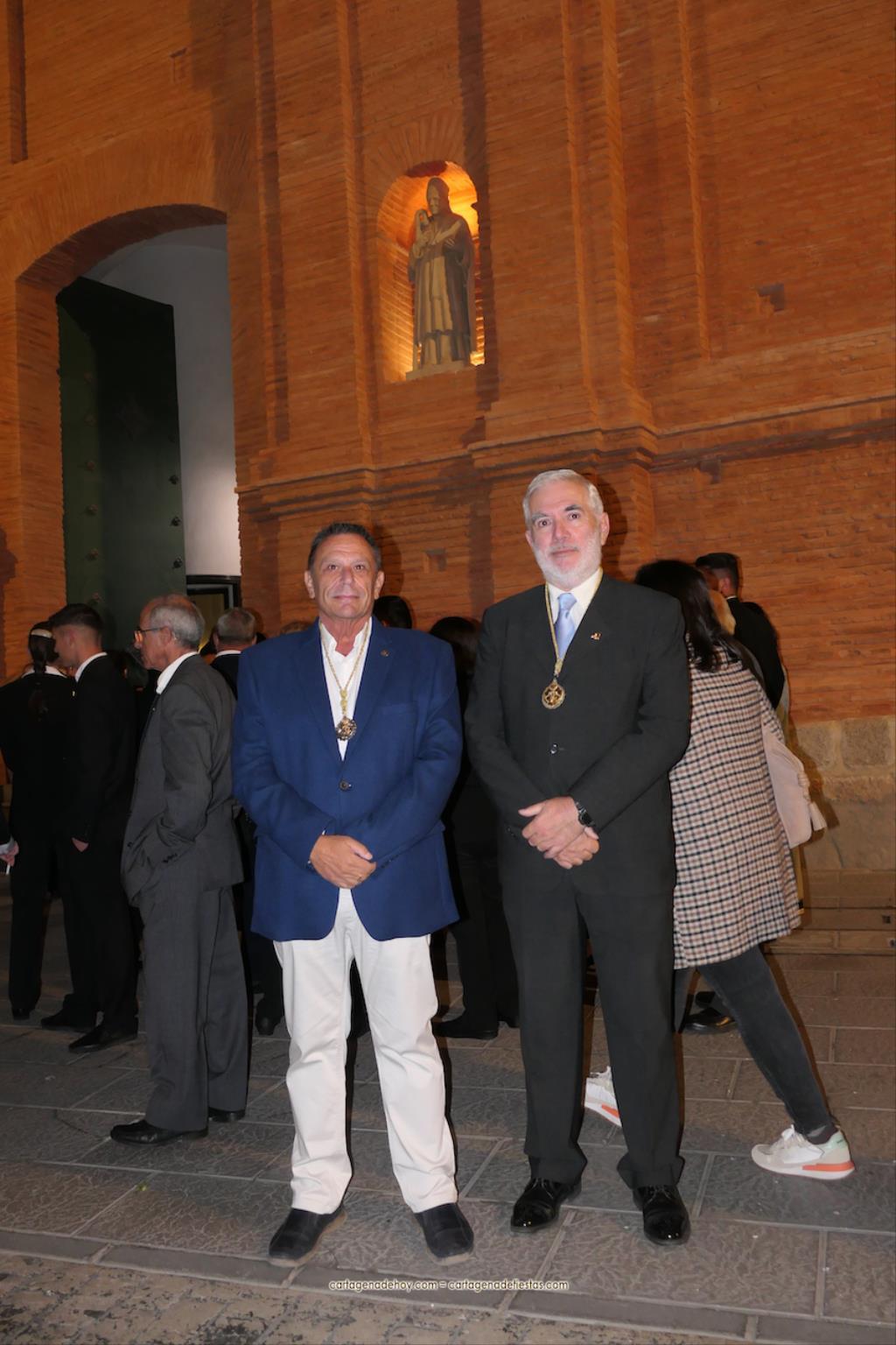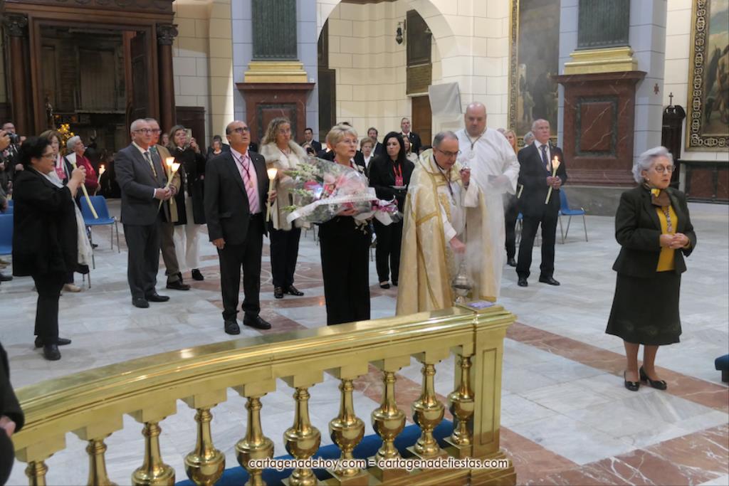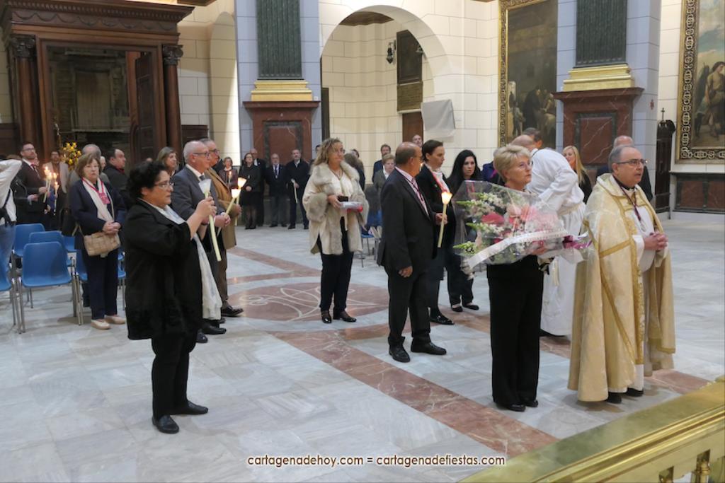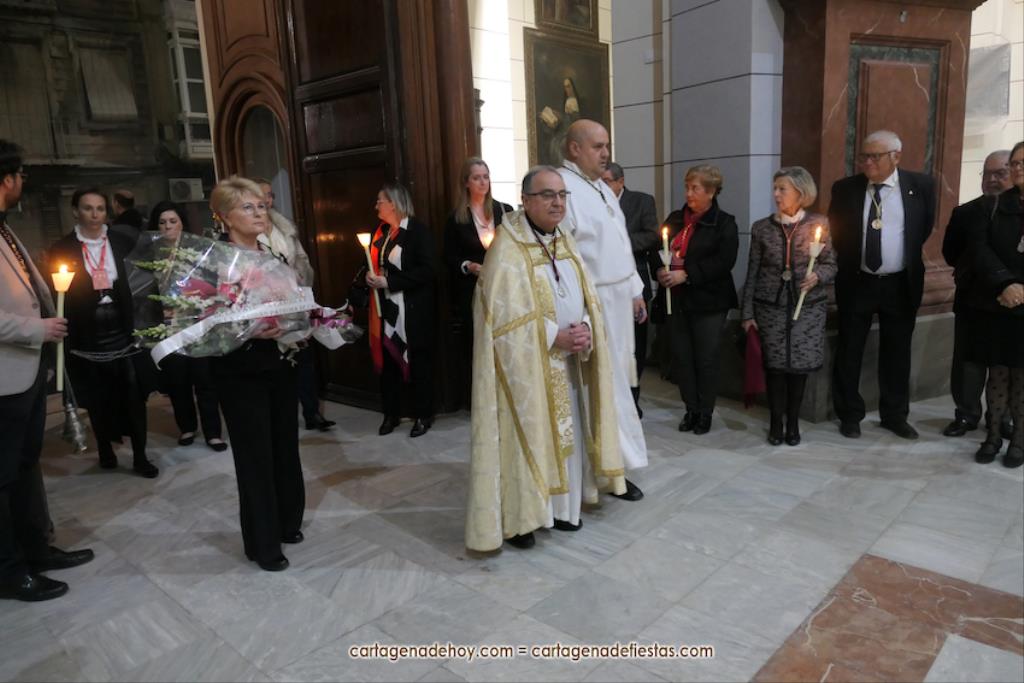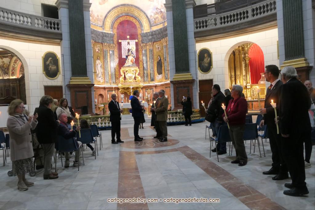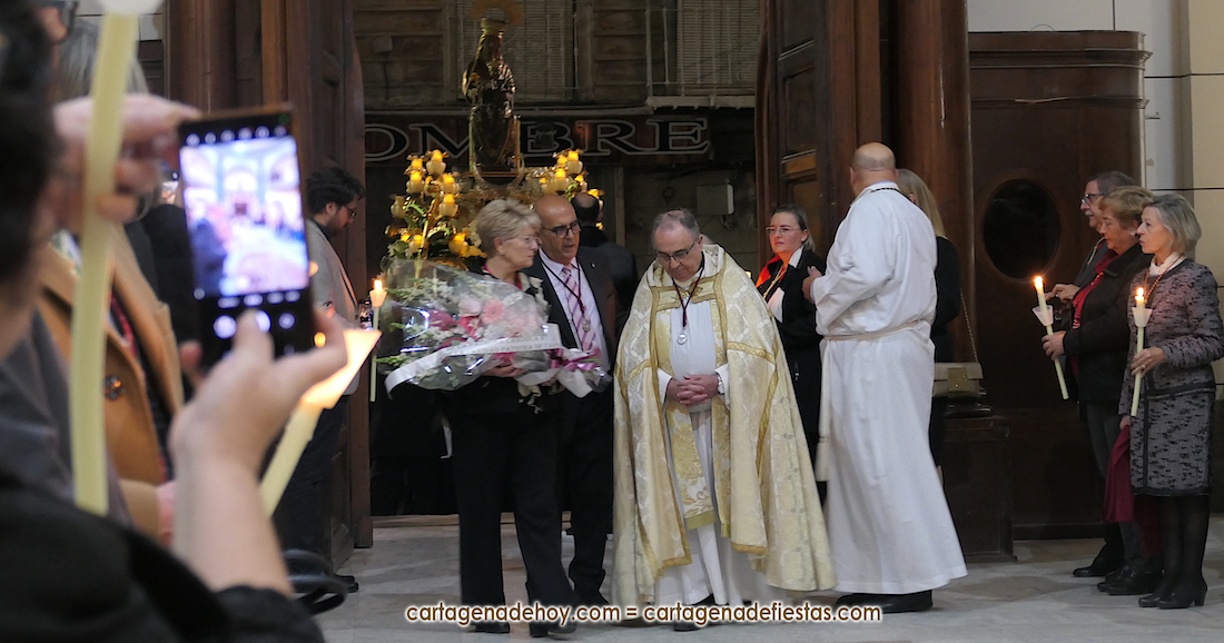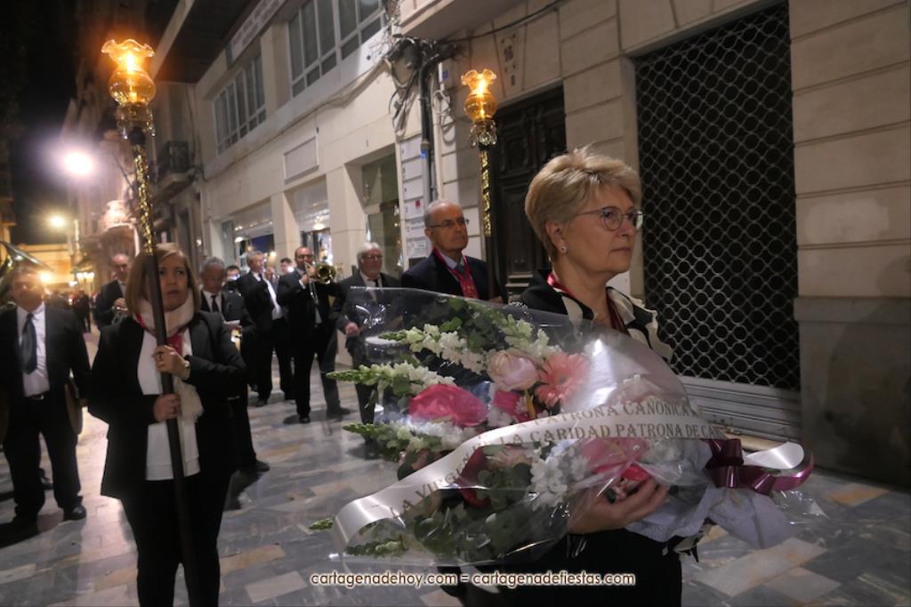 El momento más especial fue cuando la imagen de la Virgen del Rosell se situó ante la entrada de la Real Basílica Menor de la Caridad, cara a cara con la talla de la actual patrona. Una Virgen con el niño Jesús en su regazo, la otra con Jesucristo fallecido tras ser crucificado. Y entre ambas, varios siglos de la historia de la fe en Cartagena. El sacerdote José Abellán fue el encargado de depositar en el altar un ramo de flores, para después ser cantada la Salve. Por cierto, durante el recorrido, se entregaron a los espectadores numerosas estampas conmemorativas de la visita extraordinaria de la patrona canónica de Cartagena a la patrona popular. A continuación, la comitiva siguió la marcha hasta la iglesia de Santa María, otro momento especial y emotivo que envolvió el canto de la Salve.