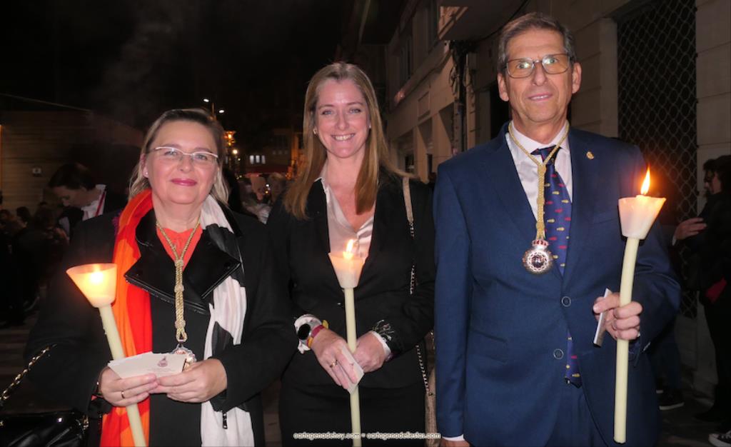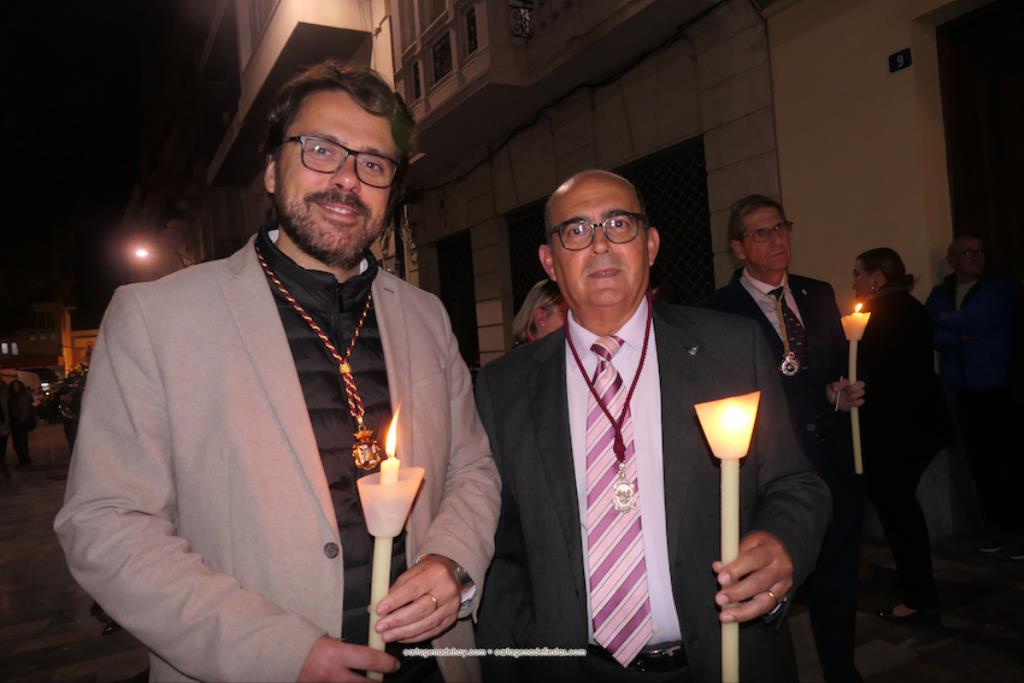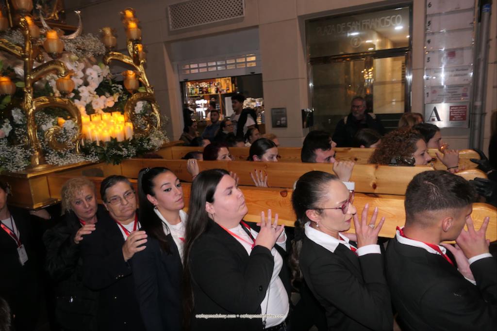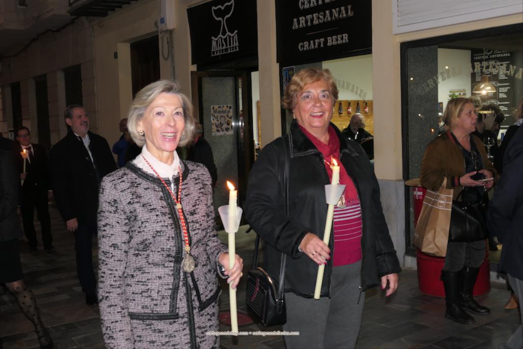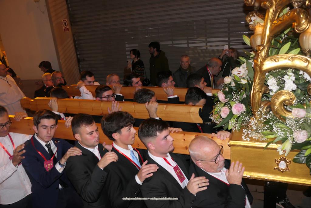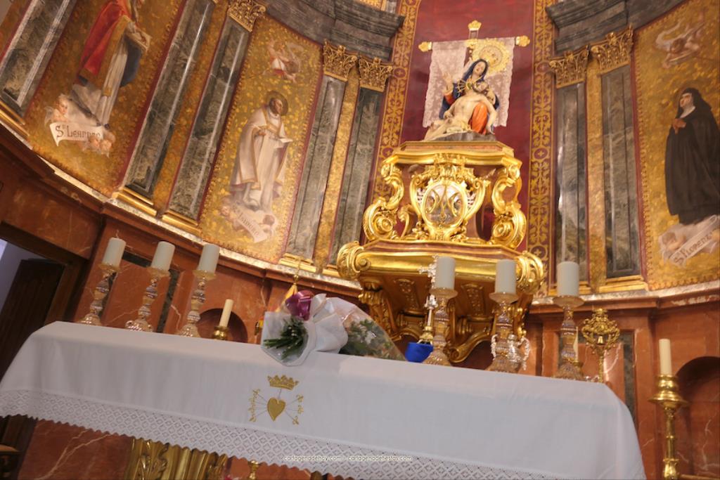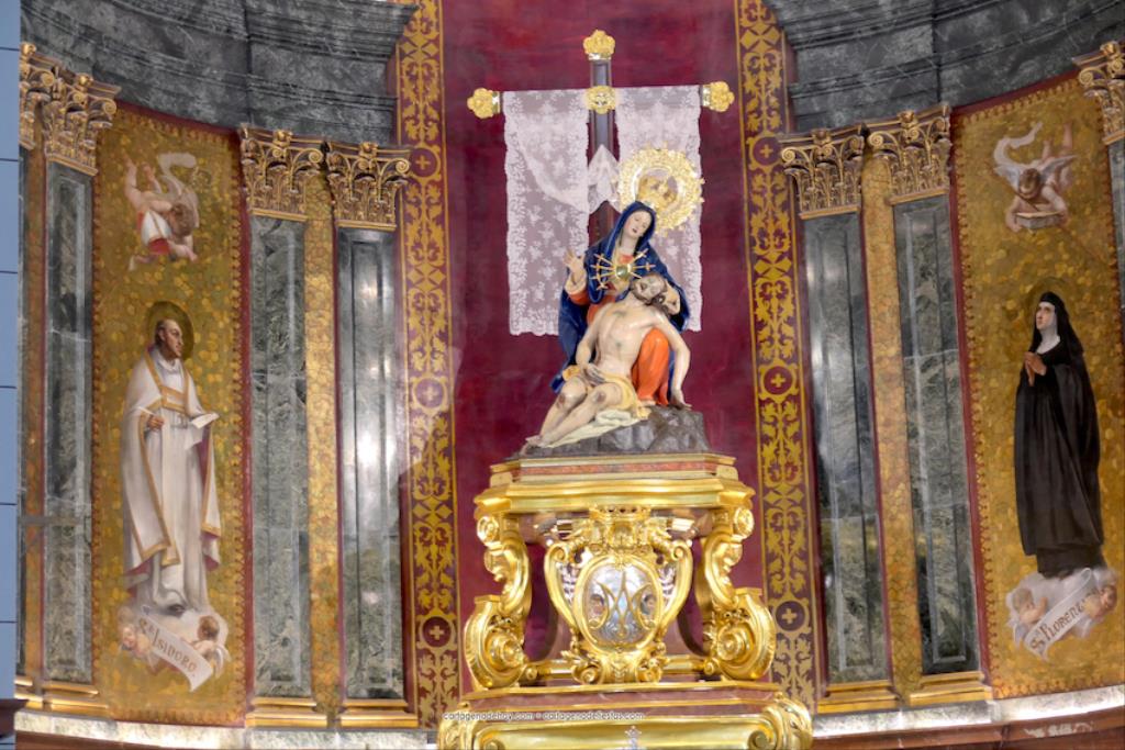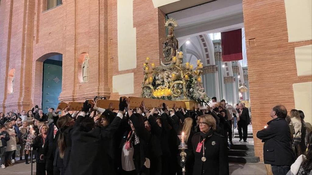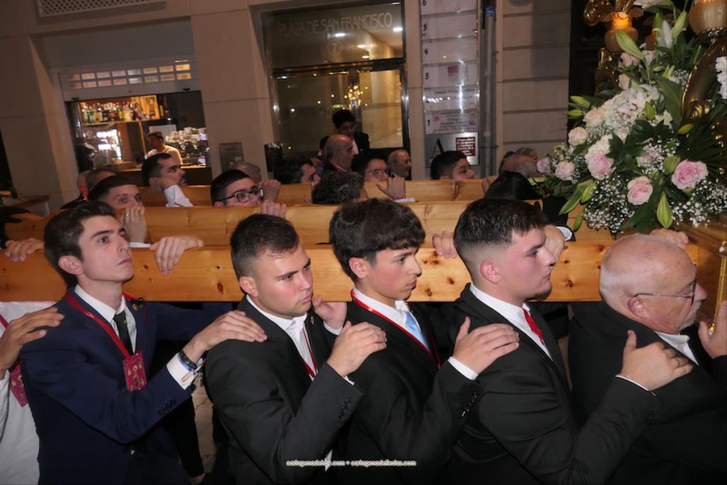 El momento más especial fue cuando la imagen de la Virgen del Rosell se situó ante la entrada de la Real Basílica Menor de la Caridad, cara a cara con la talla de la actual patrona. Una Virgen con el niño Jesús en su regazo, la otra con Jesucristo fallecido tras ser crucificado. Y entre ambas, varios siglos de la historia de la fe en Cartagena. El sacerdote José Abellán fue el encargado de depositar en el altar un ramo de flores, para después ser cantada la Salve. Por cierto, durante el recorrido, se entregaron a los espectadores numerosas estampas conmemorativas de la visita extraordinaria de la patrona canónica de Cartagena a la patrona popular. A continuación, la comitiva siguió la marcha hasta la iglesia de Santa María, otro momento especial y emotivo que envolvió el canto de la Salve.