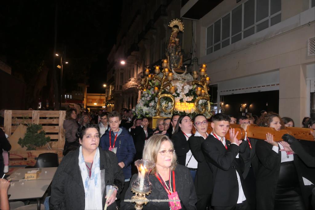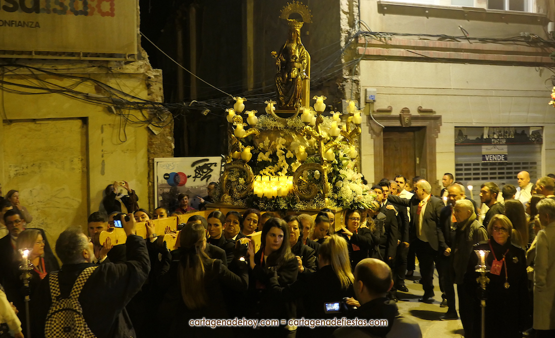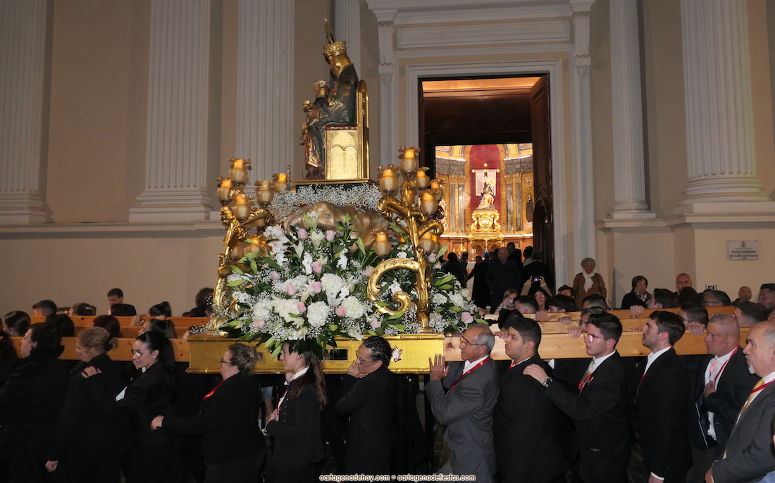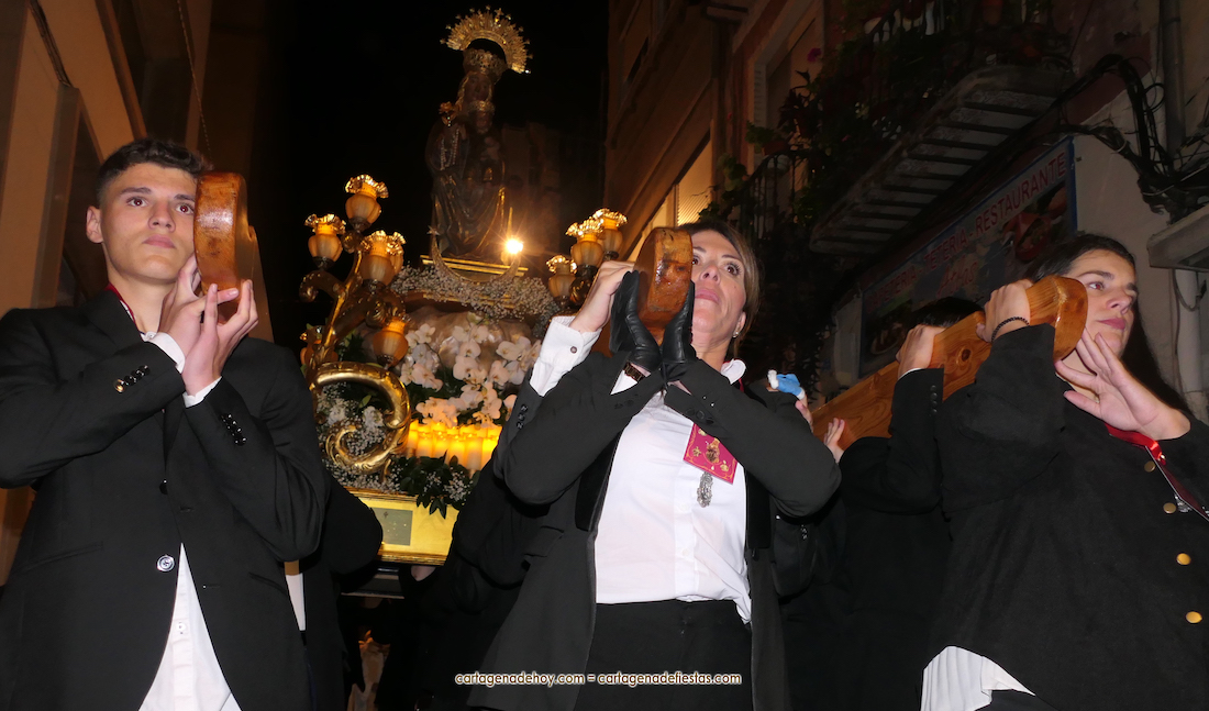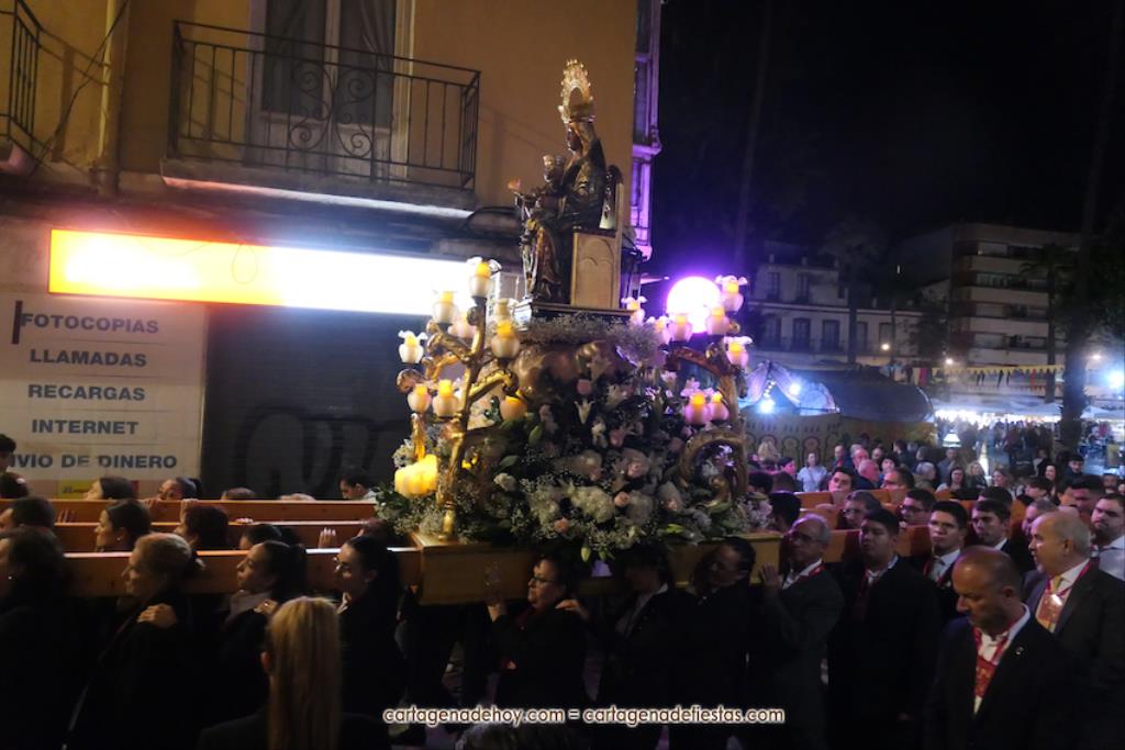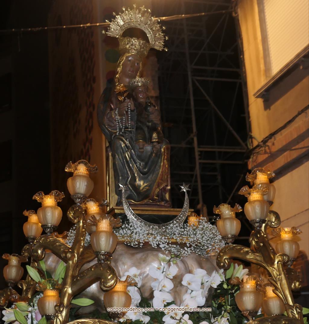 La procesión, organizada por la Cofradía de la Virgen del Rosell y los Cuatro Santos, estuvo formada por una amplia representación de cofradías pasionarias y colectivos católicos, cerrando el trono llevado por algo más de cincuenta portapasos de ambos sexos llevando la talla medieval a la que la leyendas populares señalan que fue encontrada por un pescador, de apellido Ros, flotando en las aguas cartageneras.