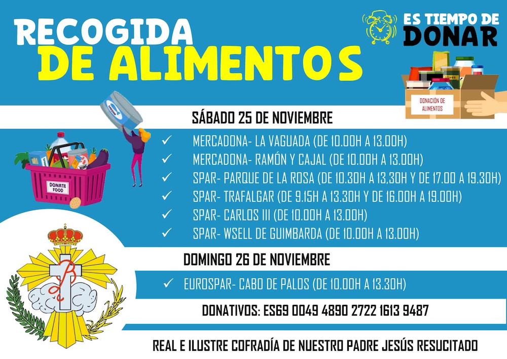 Este año se llevará a cabo este sábado día 25 de noviembre en distintos supermercados de la ciudad, donde voluntarios de las distintas agrupaciones estarán presentes, recogiendo alimentos y también donativos económicos. Este año las ubicaciones serán: supermercados Spar de calle Trafalgar, Parque de la Rosa, Carlos II y Wssell de Guimbarda, y Mercadona de la Vaguada y Ramón y Cajal.