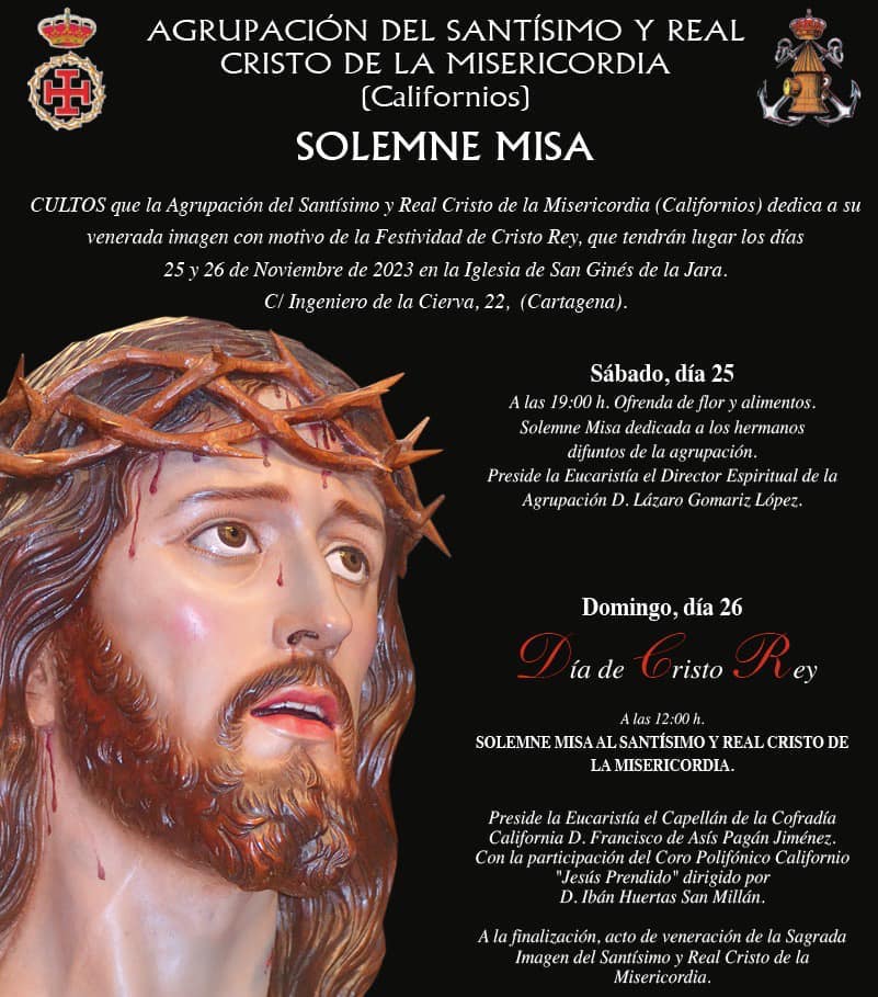 La agrupación de la Cofradía California celebrada dos jornadas de cultos durante hoy y mañana en la iglesia de San Ginés de la Jara. Esta tarde hay ofrenda de flores y alimentos, mientras que el domingo, a partir de las doce horas, la solemne misa que oficiará el capellán encarnado Francisco de Asís Pagán y en la que participará el coro 'Jesús Prendido'.