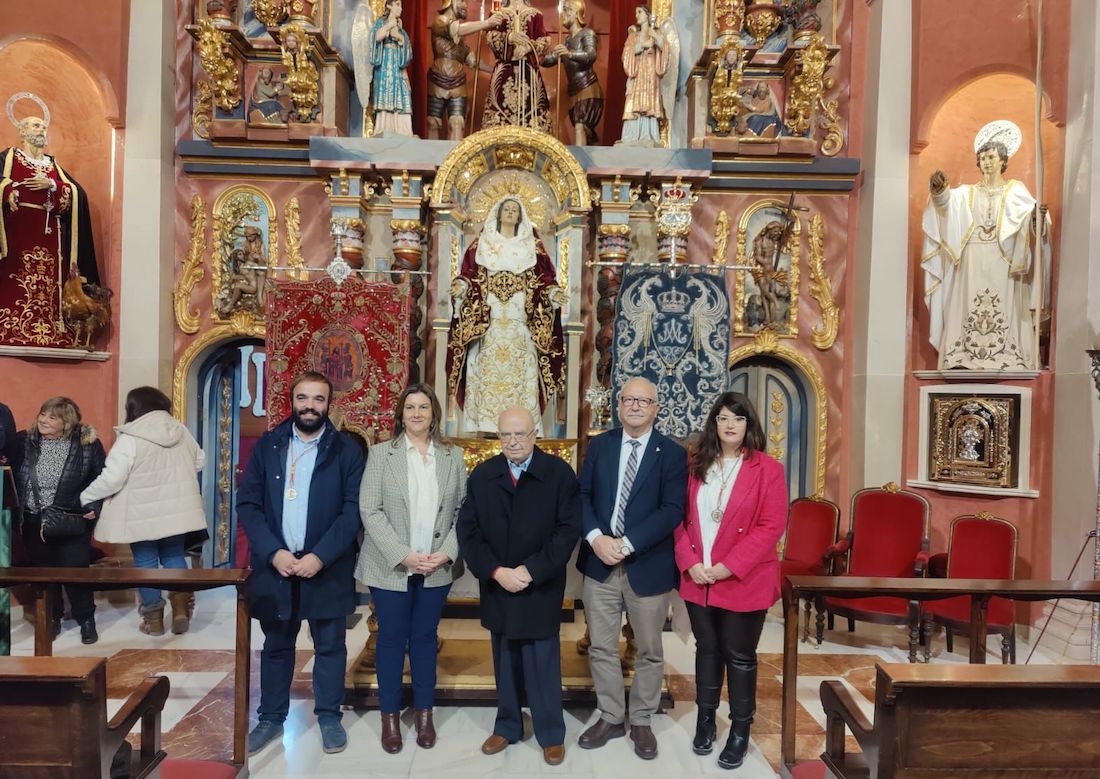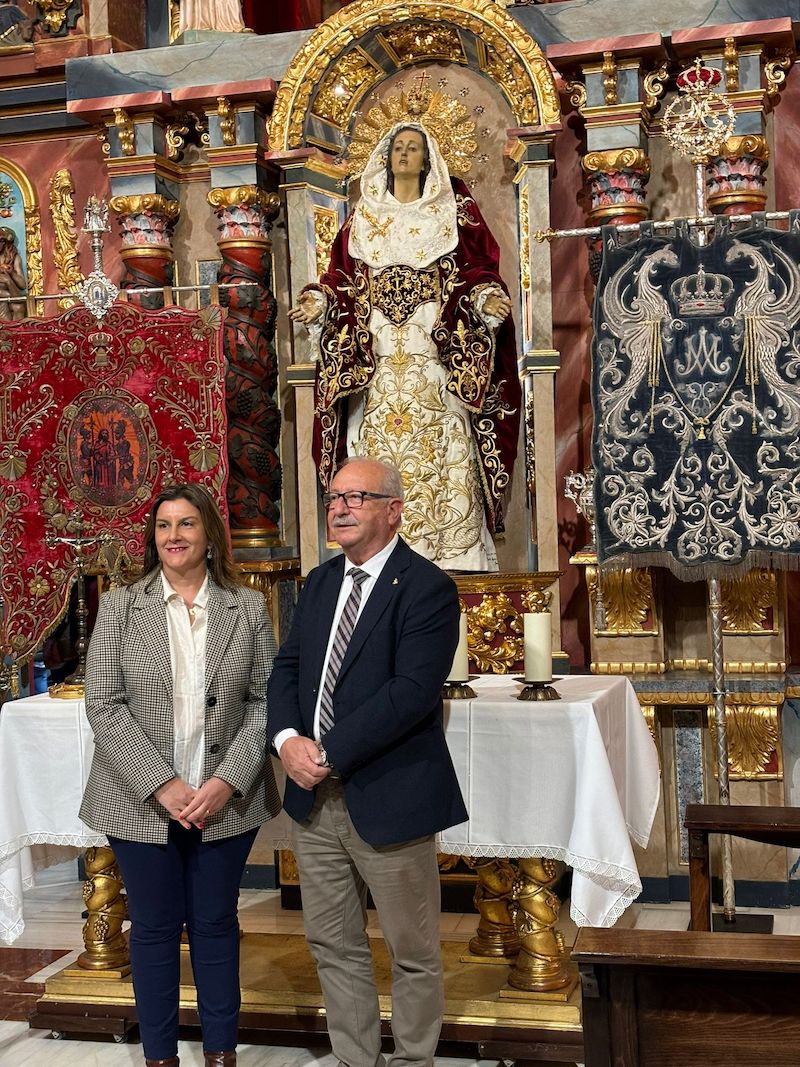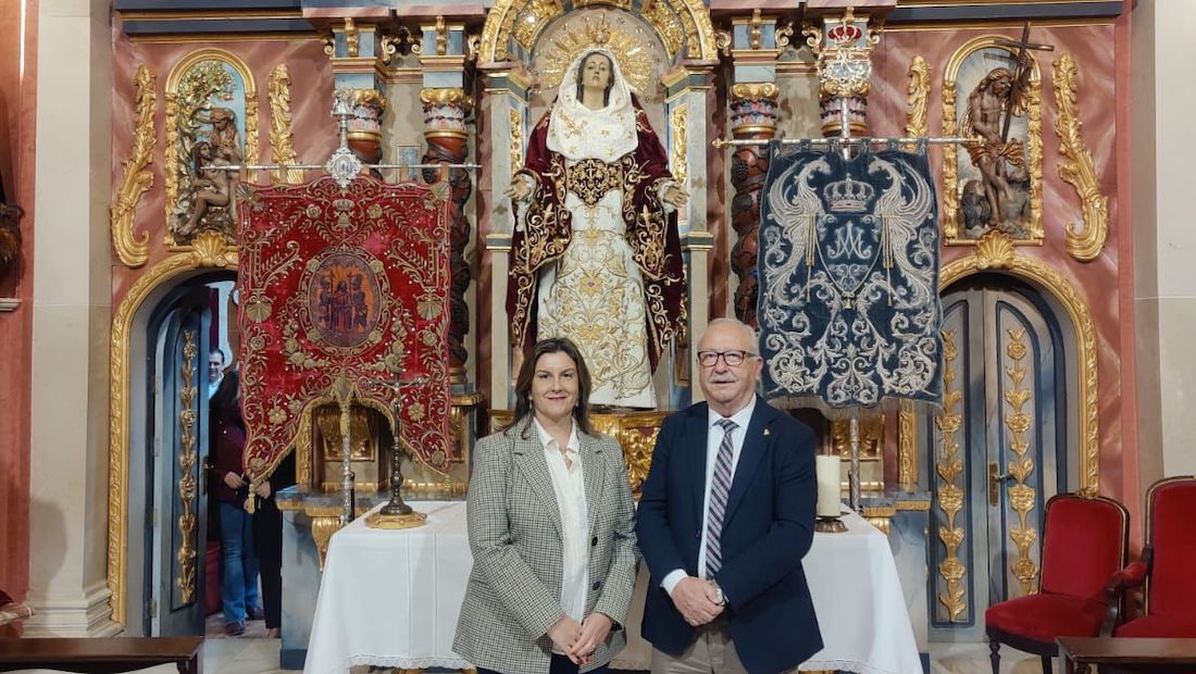 Se ha convertido, tras culminar el proceso electoral, en la primera mujer que ocupa el cargo de presidente en los cerca de cien años de la agrupación y en sus precedentes desde el siglo XVIII. En la foto posa ante la imagen del Primer Dolor con el hermano mayor de la cofradía, Pedro Ayala.